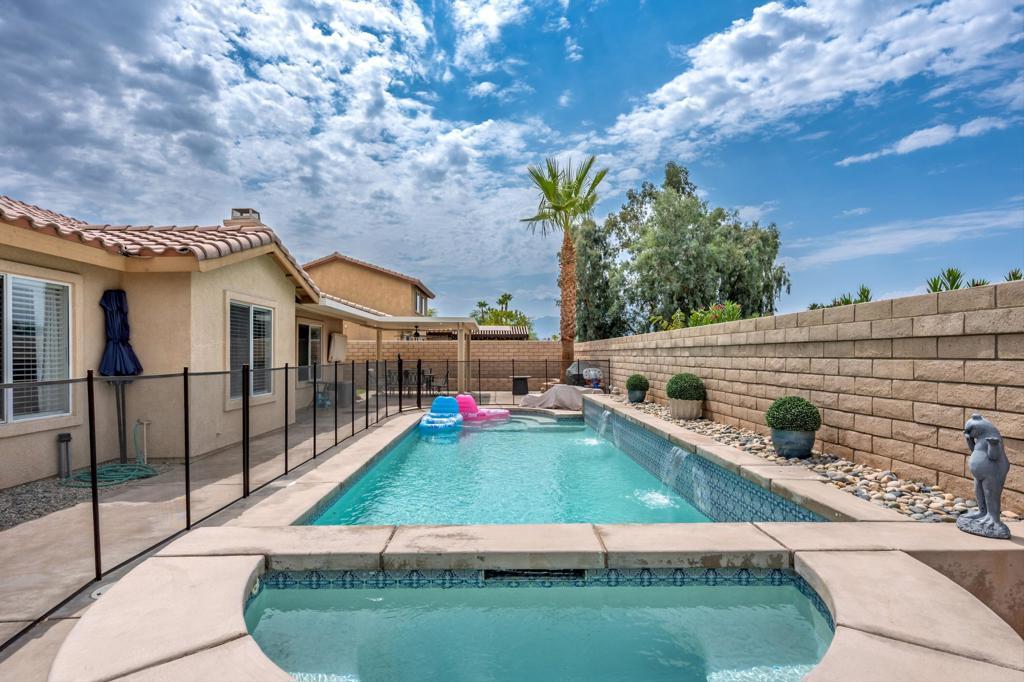 Upgraded, Smart, and Ready to Impress - This beautifully and tastefully updated 4-bedroom, 2.5 bath home is in the highly sought-after gated community of Starlight Dunes and boasts an open-concept floor plan with 10+ ft high ceilings. Nestled on a quiet cul-de-sac this 2,376 sq ft single-story retreat combines thoughtful upgrades, modern tech, and an incredible outdoor living space. The family room and dining room are open to the kitchen with a large eating area that can comfortably accommodate formal gatherings of family and friends. Outside you will find a large covered outdoor space boasting a double insulated covered patio with recessed lighting, fan and 55'' Outdoor TV. With peek-a-boo mountain views, a low maintenance yard, and a fully fenced-in pool and spa. The high-ticket items have been done for you and move in ready. Recent major improvements include: New A/C units, new spa heater, new water heater, epoxy garage floor, garage storage shelves, workbench, and tool boxes, Ecobee smart thermostats (Dual zones), programmable recessed lighting throughout, and Ring cameras installed. This home is fully equipped with $40K+ in included tech and essential mechanical updates. The primary bedroom has a wall mounted 64'' TV and Soundbar, both of which stay for your enjoyment. Conveniently Located near IB league schools, upscale dining, shopping and El Paseo - the Rodeo Drive of Desert shopping. And with 100+ golf courses in the area, you are guaranteed a tee time. This home offers everything you could possibly need to start enjoying a true desert experience from the moment you walk through the door. Whether you're looking for a desert retreat or a full-time residence, Zenith Way delivers the total package.