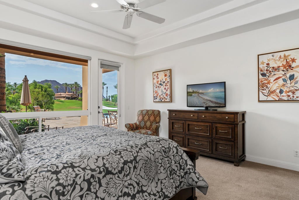 Perched above the 3rd fairway of the renowned Jones Course, this stunning Terraza II residence offers more than a home--it offers a perspective. Here, panoramic views of the Santa Rosa Mountains serve as your daily masterpiece, creating a breathtaking backdrop for legendary evening sunsets. This is the quintessential Rancho La Quinta lifestyle realized. The main residence features two bedrooms and two-and-a-half baths. Engineered wood flooring graces the living areas, where soaring high ceilings amplify the sense of light and space. The property's generous layout is further enhanced by a desirable detached casita, a private sanctuary offering two additional bedrooms connected by a Jack and Jill bath--perfect for hosting esteemed guests or creating a private executive office. Offered turnkey furnished, this residence allows for an immediate transition into your coveted desert life. Beyond the threshold, you own a stake in one of the desert's most sought after communities. As a resident, you are perfectly positioned to enjoy the much-anticipated Rancho La Quinta Country Club renovation, slated for completion mid-season. This transformation will further elevate a club already synonymous with world-class amenities and an exclusive social calendar. This is a rare opportunity to acquire an elevated viewpoint within an unparalleled setting.