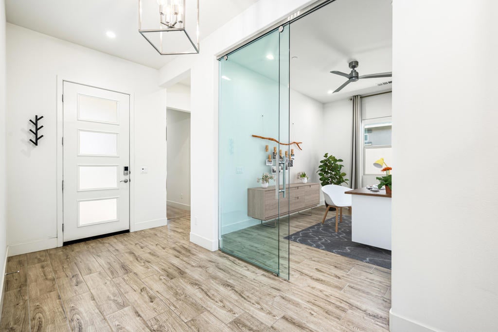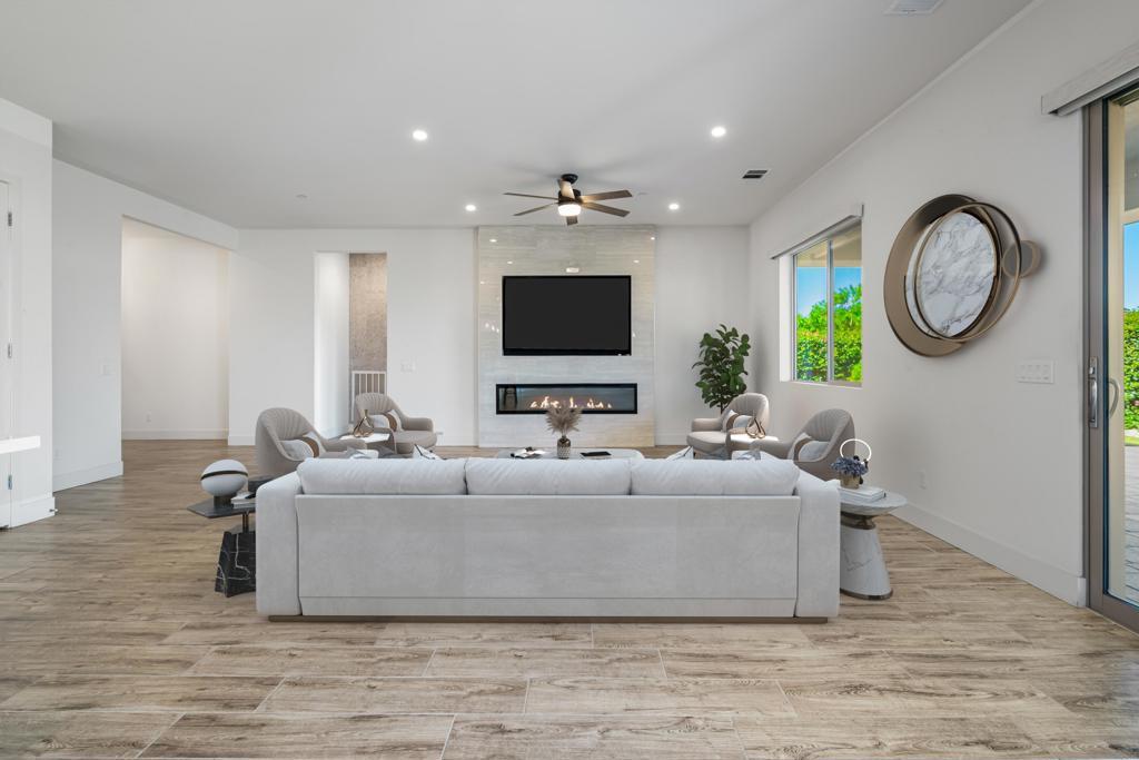 This beautifully appointed Liberty plan, located within the prestigious gated Trilogy Polo Club by Shea Homes, offers 2,367 square feet of refined single-level living with 3 bedrooms, 3 bathrooms, and a versatile den/office enhanced by elegant glass barn doors. The entry welcomes you through a custom front door into an inviting foyer with tile plank flooring and upgraded baseboards, leading into the expansive great room showcasing an open-concept design centered around two separate floor-to-ceiling tiled decorative fireplaces and a TV niche. The chef's kitchen is a true centerpiece, featuring quartz countertops, shaker cabinetry with brushed nickel hardware, a spacious prep island with seating and pendant lighting, subway tile backsplash, stainless steel appliances, built-in ovens, and a 6-burner gas cooktop with custom hood. Additional enhancements include under-cabinet motion-detecting lighting and rechargeable mounted lights thoughtfully placed throughout the home for added ambiance and convenience. Guest accommodations provide comfort and privacy, with two of the three full bathrooms offering en suite access and two bedrooms featuring walk-in closets. The luxurious primary retreat includes one of the fireplaces and offers an en suite bath with quartz countertops, dual vanities, a beautifully tiled shower, and a walk-in closet with custom organizers. The home's window treatments combine elegance and ease with a mix of decorative hanging drapes and remote-controlled shades. Outdoor living is equally impressive with a serene covered paver patio, professional landscaping with accent lighting, and ample space to relax or entertain. Additional highlights include a custom-designed garage with epoxy flooring, built-in cabinetry, and a separate golf cart garage. The property also features a premium 5-ton Lennox Signature Collection gas heating and cooling system with UV sterilization and a single, whole-house attic air filter replaced annually--eliminating the need for multiple filter changes and ensuring superior indoor air quality. This home is truly a must-see for those seeking style, function, and sophistication in one of the desert's premier lifestyle communities.