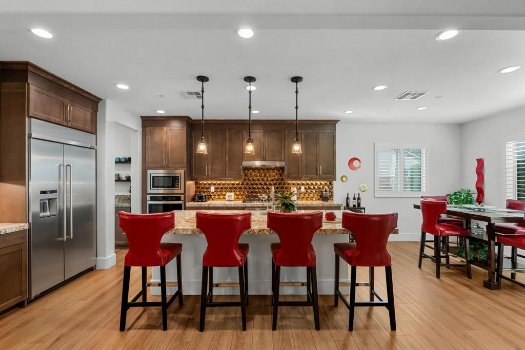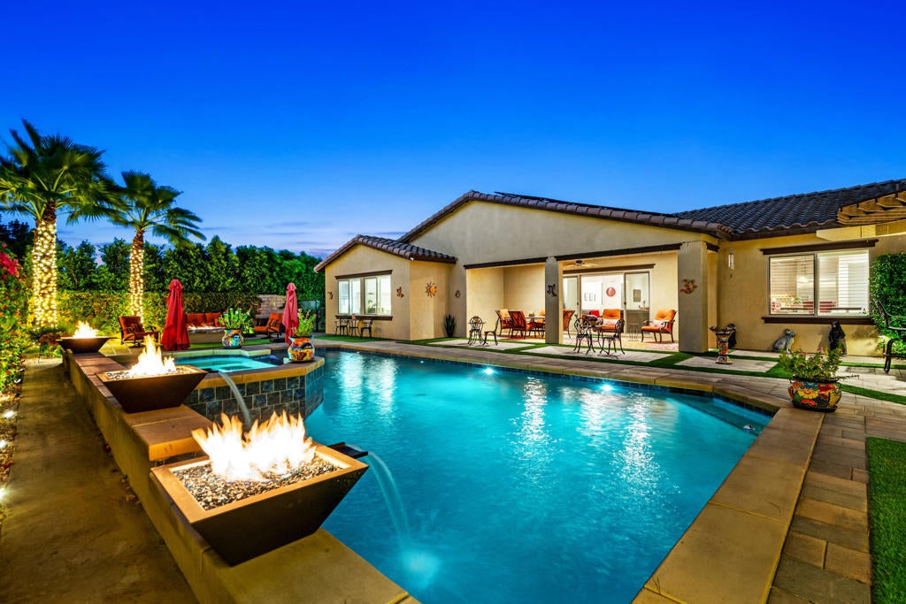 Experience resort-style living in this exquisitely upgraded 4 bed 3.5 bath 2,911 SF home with private casita on a 1/4-acre lot with 2-car plus tandem garage. Enter through a custom front gate & glass door to soaring ceilings & sunlit spaces that flow seamlessly from the grand entry to the den & formal dining room. The open-concept living area boasts a custom entertainment center & modern fireplace, framed by new flooring, baseboards, and elegant crown molding throughout.The gourmet kitchen features granite counters, a chic LED-lit backsplash, pull-out cabinets, soft-close drawers, a walk-in pantry and a spacious eat-in island with breakfast nook with all appliances included plus W&D. Down the hall are two generous guest rooms, while the casita offers its own entrance and the lavish primary suite overlooks the newly landscaped backyard retreat. Step outside to your custom designed luxurious oasis--complete with a covered outdoor kitchen and bar, lush landscaping with palms, pavers & vibrant turf plus dedicated dog run, and a resort-style pool accented by fire-and-ice bowls and a custom fire pit. Every detail, from the high-tech security and misting system to the refined finishes, creates a sanctuary of luxury, technology and timeless beauty within the gated community of Carmela.