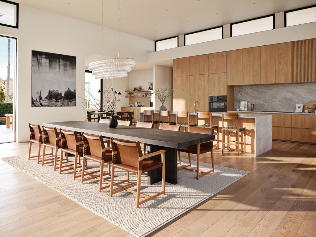Located in the Flores Montanas community, this 4 bedroom 5 bathroom modern residence offers 4,474 sq ft of refined living. Soaring 14-ft ceilings and real white oak floors and cabinetry set the tone for sleek sophistication. The expansive great room opens seamlessly via automated pocket doors to a resort-style backyard with a knife-edge black pebble tech pool, an 11-ft fire feature with cascading waterfall, and built-in space heaters for year-round comfort.The sleek kitchen is equipped with Monogram appliances, double dishwashers, double sinks, and Taj Mahal natural stone countertops. Additional highlights include a spacious laundry room, double washers and dryers, and a fully insulated, air-conditioned 3-car garage with hot/cold water spigot and custom dog wash station.This fully automated smart home features whole-house reverse osmosis filtration, solar power, indoor/outdoor sound, and smart window tech in the primary bath. All within minutes of Old Town La Quinta's charming shops, dining, farmers markets, and world-class golf--offering the perfect blend of high design and desert lifestyle.