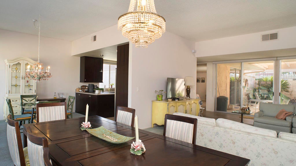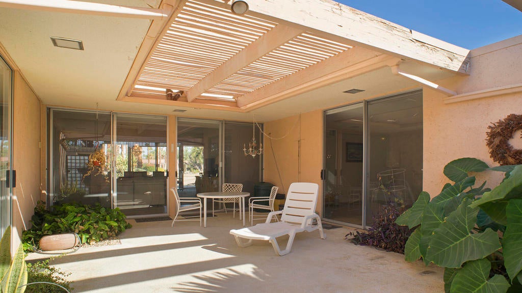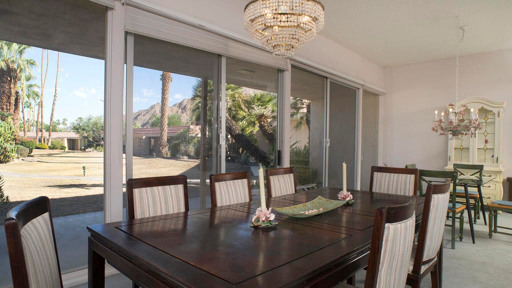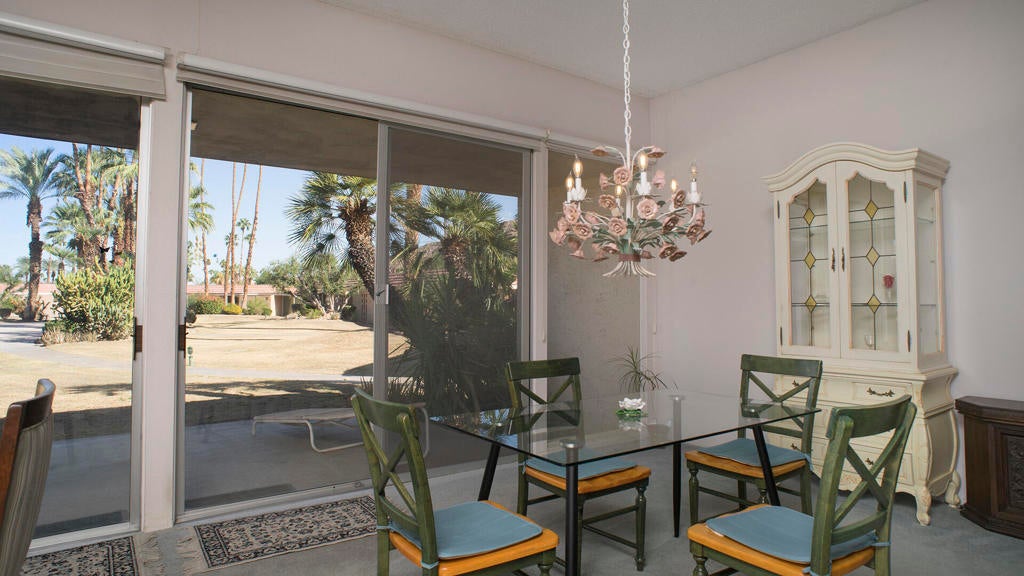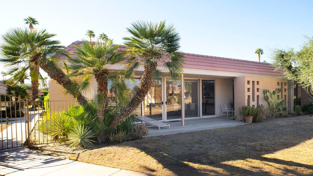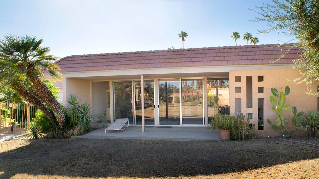 PRICE REDUCTION! First time on the market! Wonderful and spacious, 3 bedroom, 3 bath Sandpiper condo in prestigious Indian Wells Country Club. Open and bright Mid-century floor plan with gorgeous south mountain views from the kitchen and great room! Back patio overlooks the beautifully landscaped grounds and community pool. Kitchen was updated with new cabinets. Wood-like tile floors. Main bedroom has access to a private courtyard patio, en-suite bathroom with dual sinks, shower and walk-in closet. Second bedroom has access to the private courtyard patio, includes an en-suite bathroom and walk-in closet. Third bedroom has access to the back patio, and walk-in closet, third bathroom with sink, shower. Inside laundry room. Some of the original light fixtures are still hanging. Center courtyard is very private. Two car detached garage. Close to El Paseo shopping, fine dining, McCallum Theatre, golf and the world-renowned Indian Wells Tennis Garden, an ideal location!