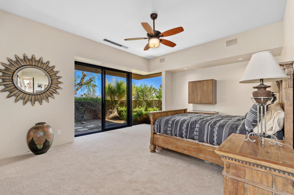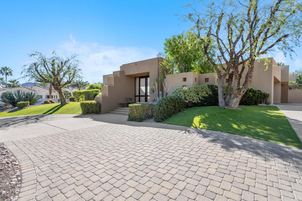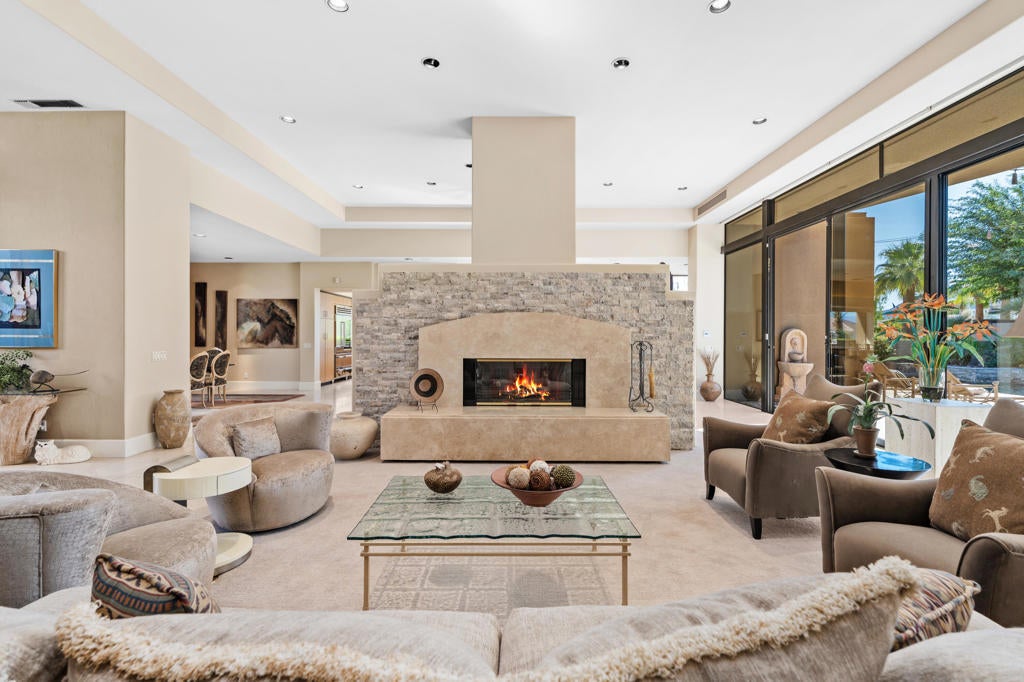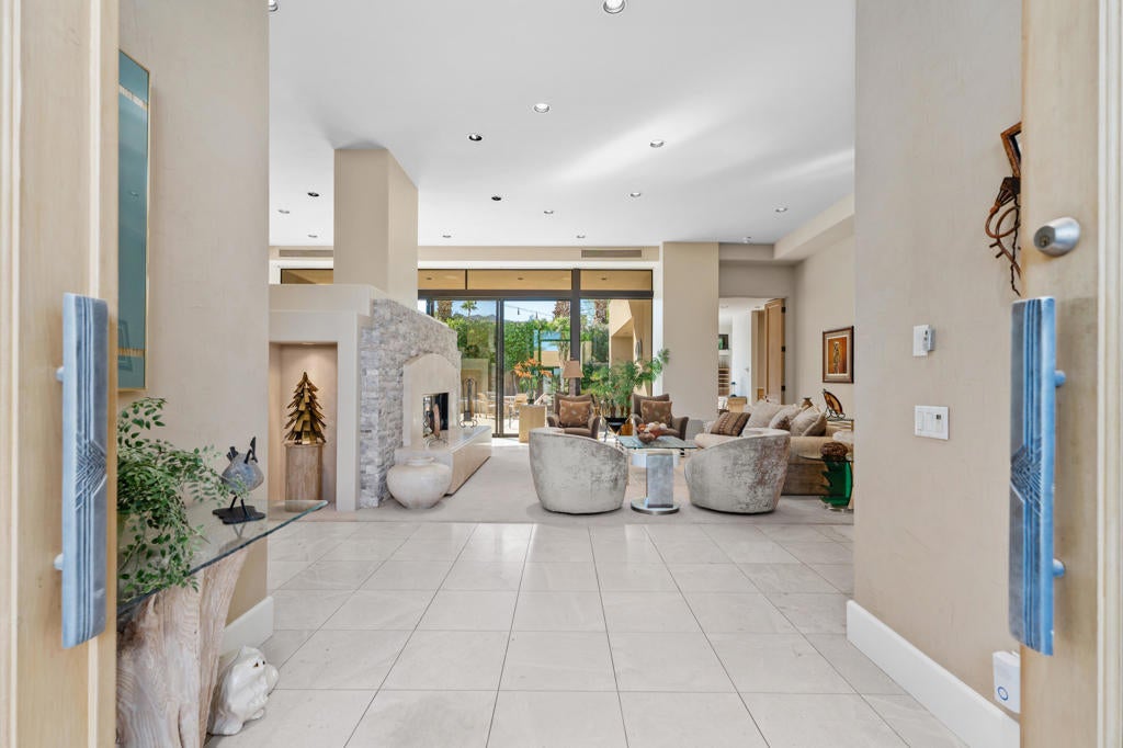 Discover the perfect blend of contemporary design, privacy, and luxury at this distinctive custom home in The Highlands--one of the most coveted enclaves within Ironwood Country Club. With over 4,450 square feet of refined living space on a premium elevated half-acre lot, this residence captures beautiful mountain views while offering an effortless indoor-outdoor lifestyle. Thoughtfully designed for both comfort and style, the home features three bedrooms plus a den and four-and-a-half baths, including two spacious primary suites. Walls of glass and high ceilings flood the interiors with natural light, highlighting the home's architectural sophistication. The expansive great room features a step-down wet bar, limestone flooring, and a sleek fireplace--perfect for entertaining. A gourmet kitchen with white oak cabinetry, granite countertops, a large island, and professional-grade Sub-Zero, Bosch, and KitchenAid appliances will delight any chef. Both primary suites are true retreats, each with seamless corner windows framing dramatic views, luxurious baths with bidet toilets, and generous walk-in closets. One suite features a fireplace, a spa-style tub, marble shower & countertops, and dual vanities, while the other offers its own private sanctuary. Outdoors, you'll find spaces designed for relaxation and entertaining--from the gated entry courtyard to the landscaped backyard with artificial turf, built-in BBQ, and Pebble Tec pool and spa framed by stacked stone. The three-car garage with epoxy flooring, owned 60-panel solar system with batteries that power the home for 24 hours, four HVAC zones, and two new water heaters reflect the home's thoughtful attention to comfort and efficiency. Located in the prestigious Ironwood Country Club--one of Palm Desert's premier private communities--residents enjoy access to two championship golf courses, world-class tennis and pickleball facilities, a state-of-the-art fitness and wellness center, and both fine and casual dining options. An active social calendar and stunning desert setting make Ironwood an exceptional place to call home. This extraordinary residence embodies desert contemporary living at its finest--private, refined, and perfectly positioned for those who value design, quality, and serenity.