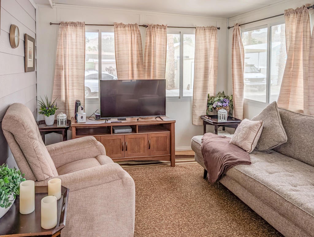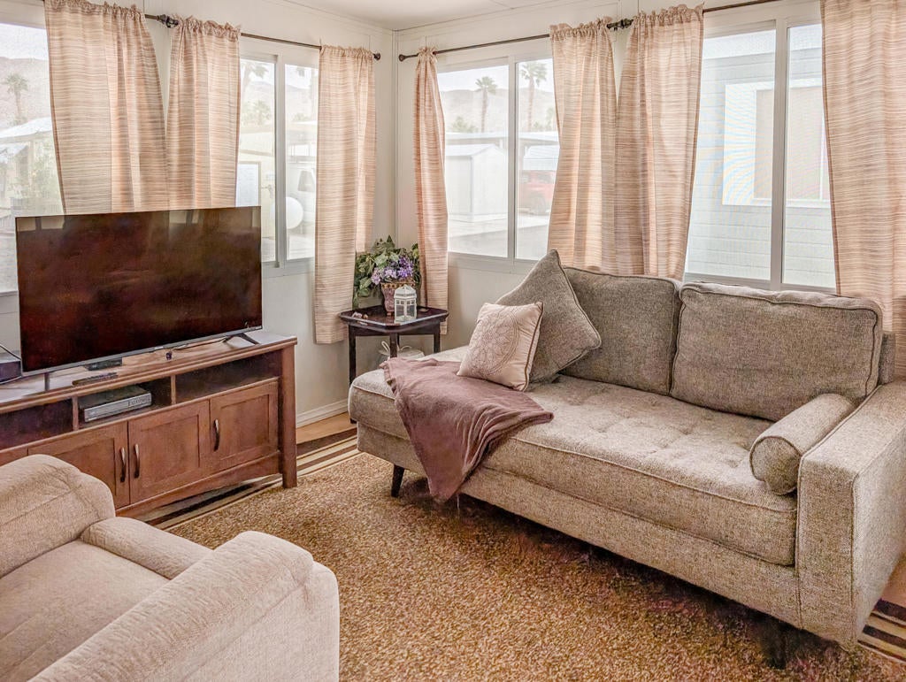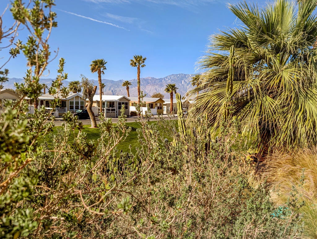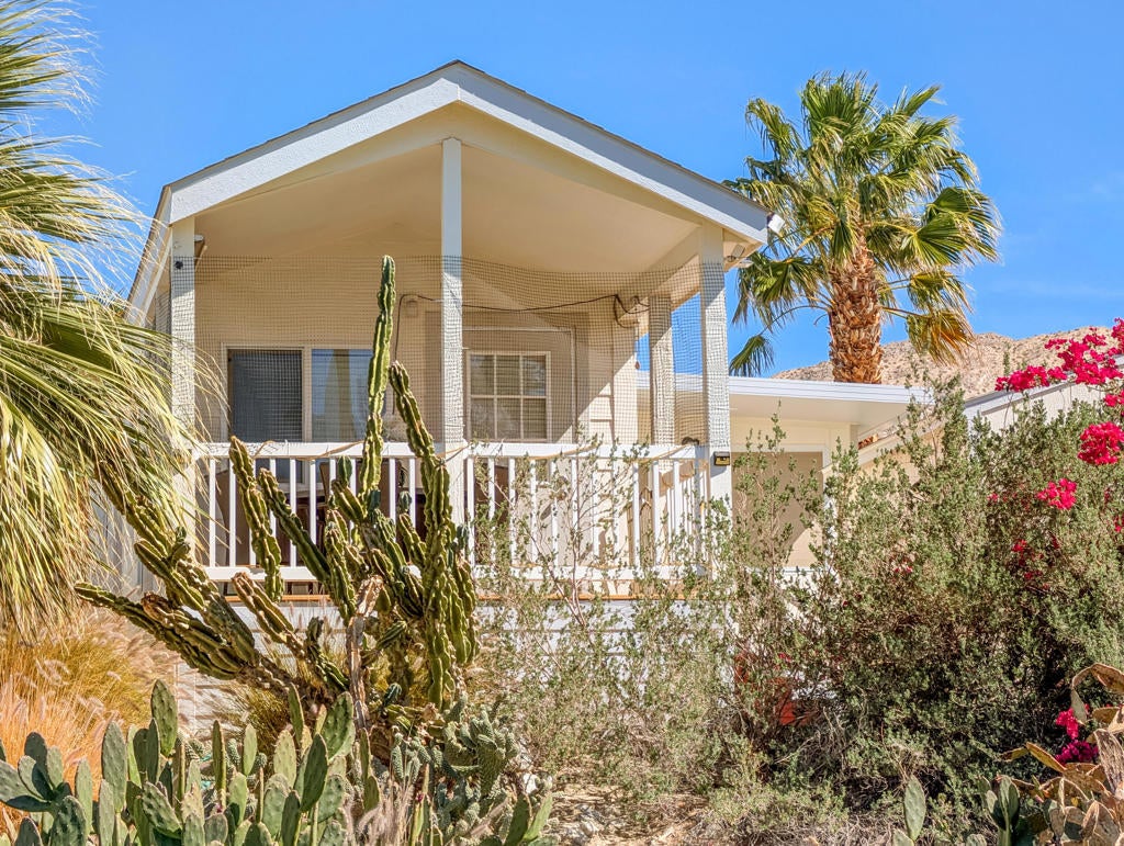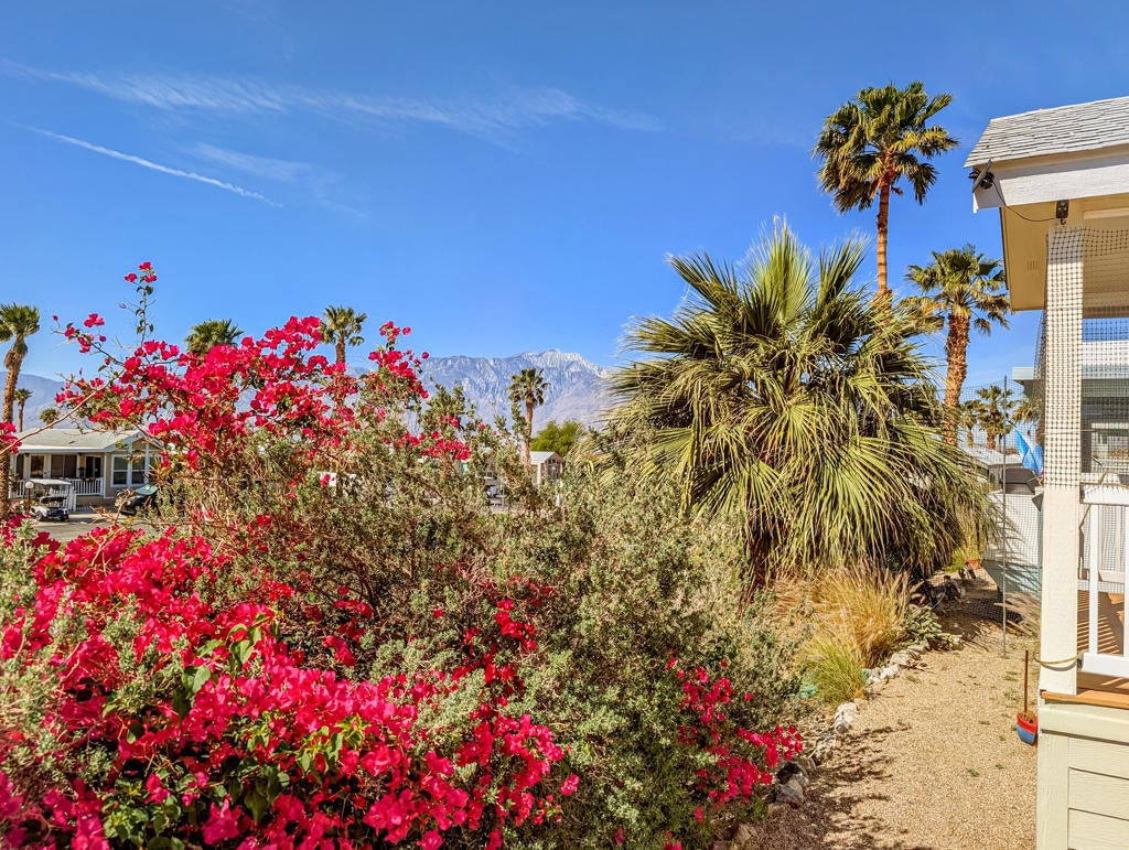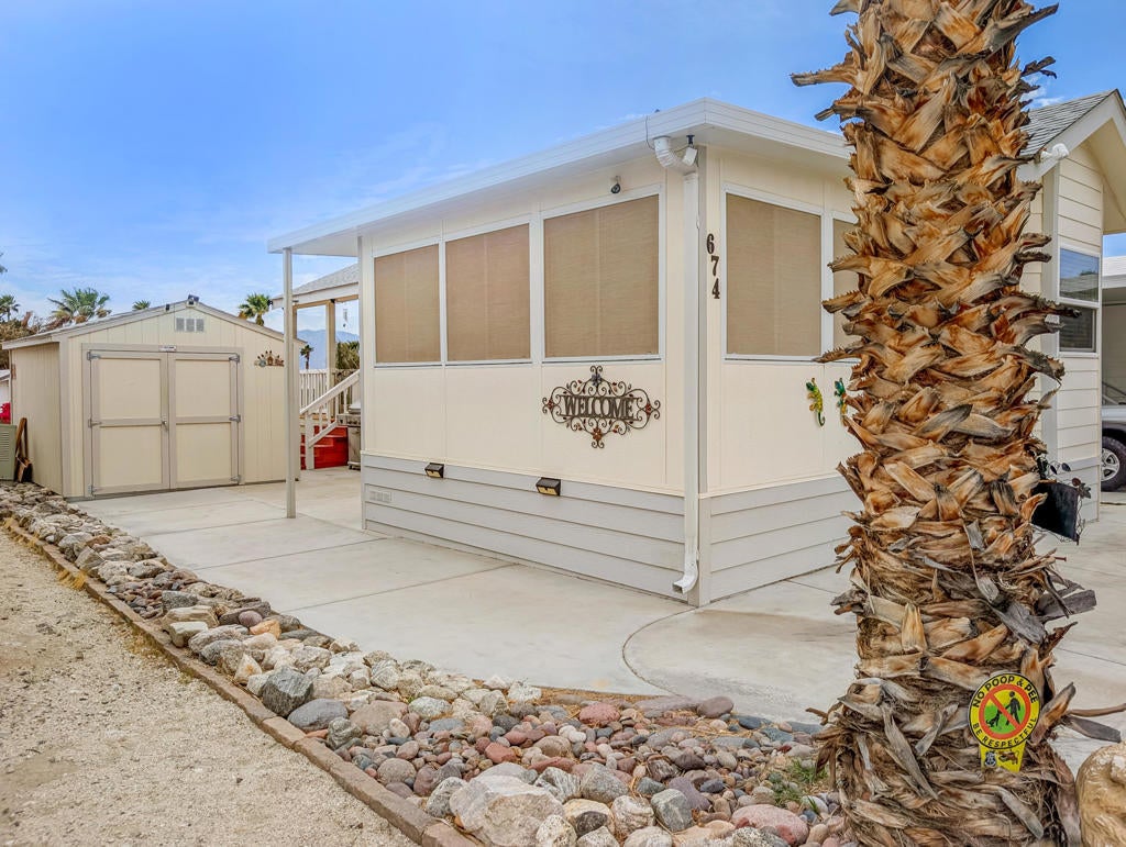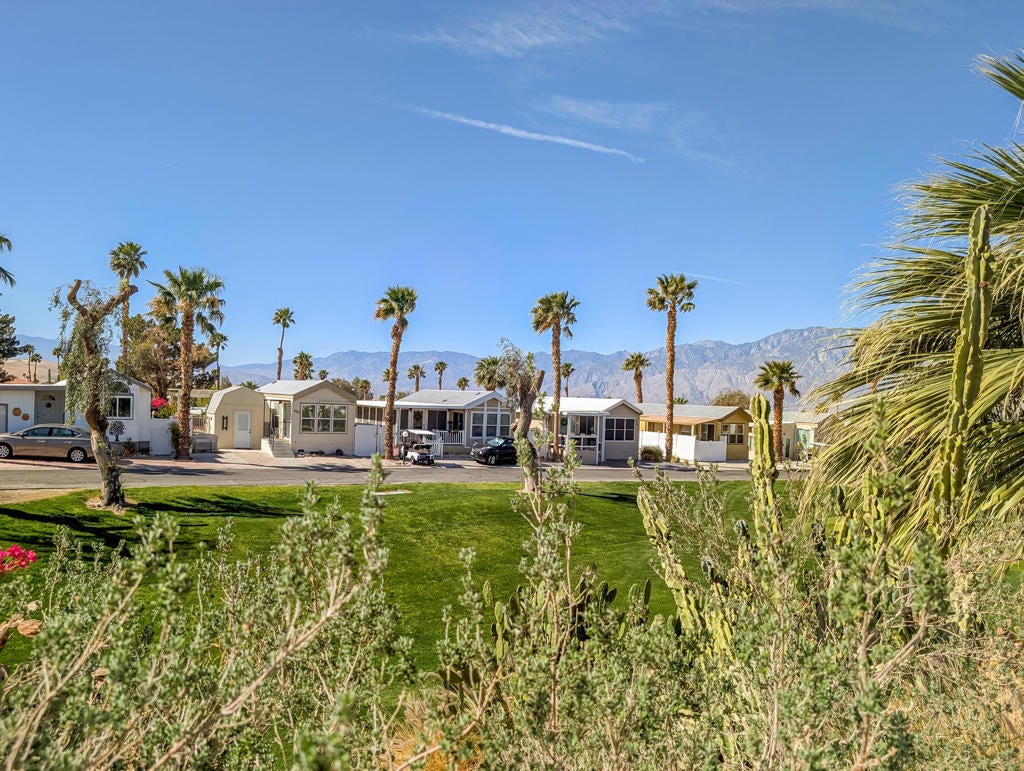 Charming and serene! This 2007 Laurel Creek Park Model with ~550 sq. ft., 1 bedroom, 1 bathroom is delightful with modern touches and style throughout. Situated high above the 3rd hole of the golf course you'll get a bird's eye view of golfing activity and the stunning Mt. San Jacinto peaks while enjoying the covered protected deck. So much beautiful mature landscape to create a private and peaceful feeling, large shed for storage, side patio, paved parking and much more. Caliente Springs is a 55+ Resort with healing amenities of mineral hot spring pool and spas, 8-pickleball courts, tennis courts, laundry facilities, 9-hole golf course and a fun and active community with great schedule events. Lot is not owned, space rent is $811. Easy lender finance (OAC).