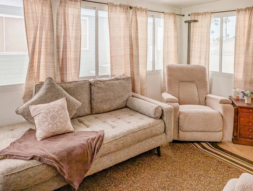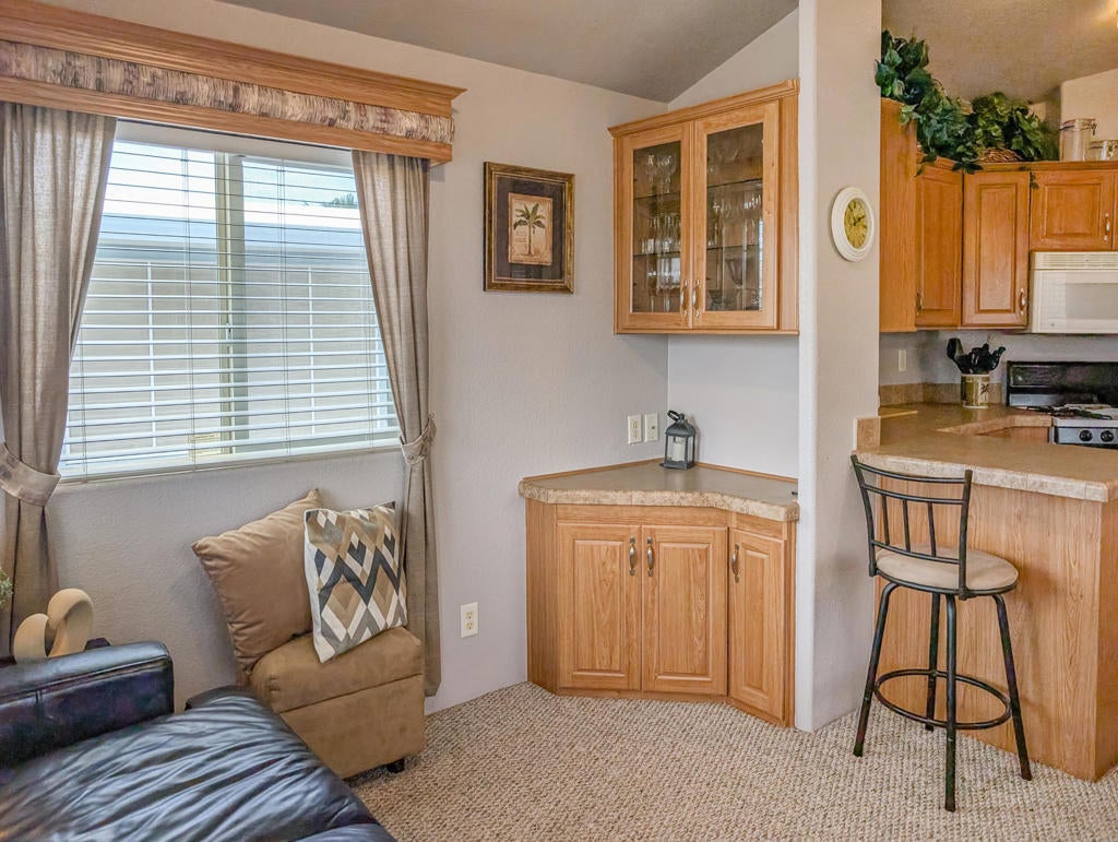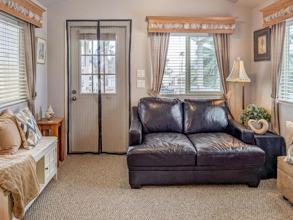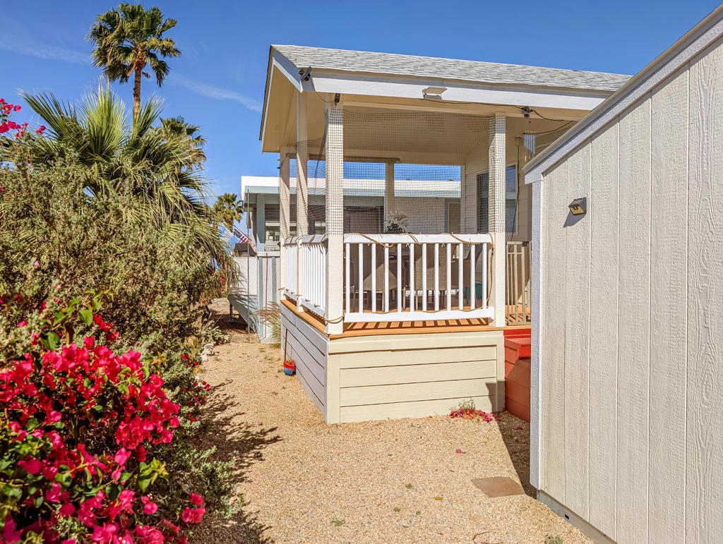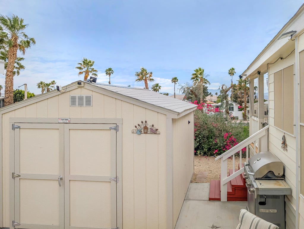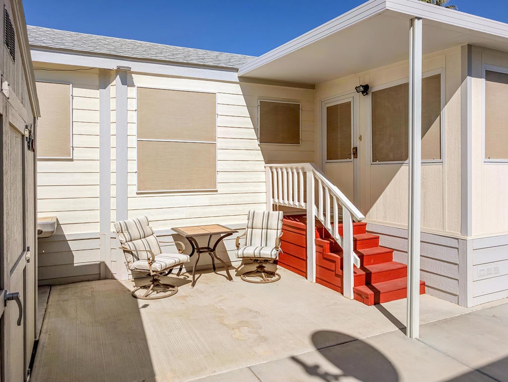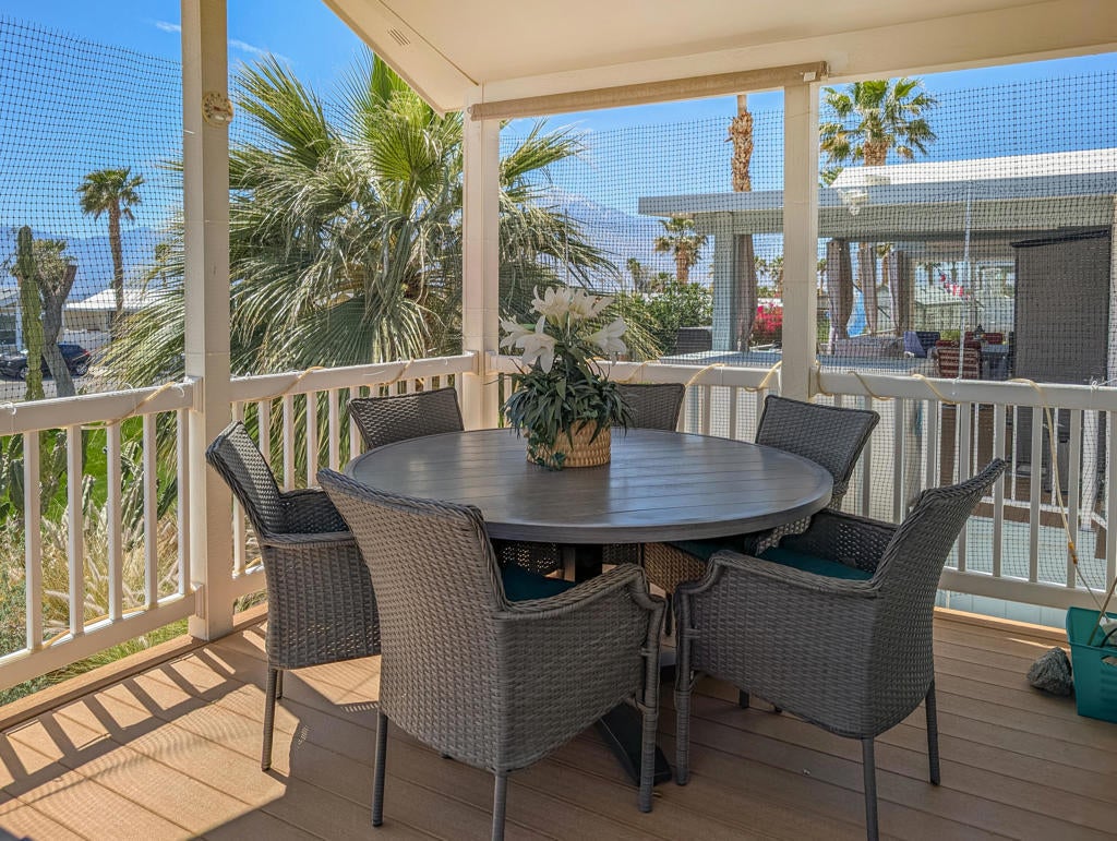 Charming and serene! This 2007 Laurel Creek Park Model with ~550 sq. ft., 1 bedroom, 1 bathroom is delightful with modern touches and style throughout. Situated high above the 3rd hole of the golf course you'll get a bird's eye view of golfing activity and the stunning Mt. San Jacinto peaks while enjoying the covered protected deck. So much beautiful mature landscape to create a private and peaceful feeling, large shed for storage, side patio, paved parking and much more. Caliente Springs is a 55+ Resort with healing amenities of mineral hot spring pool and spas, 8-pickleball courts, tennis courts, laundry facilities, 9-hole golf course and a fun and active community with great schedule events. Lot is not owned, space rent is $811. Easy lender finance (OAC).