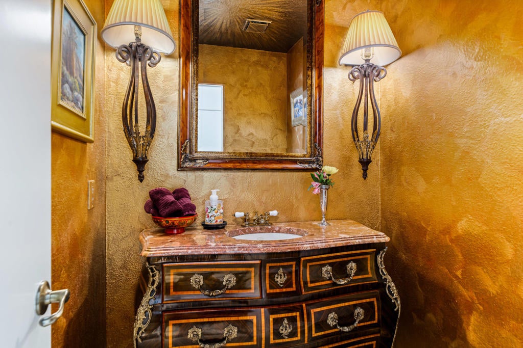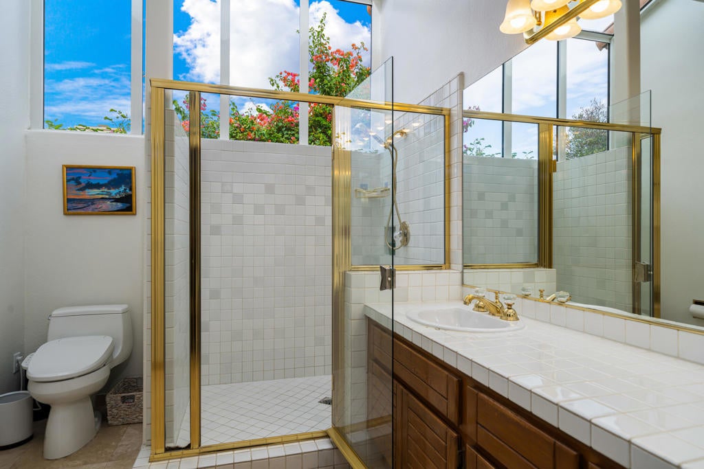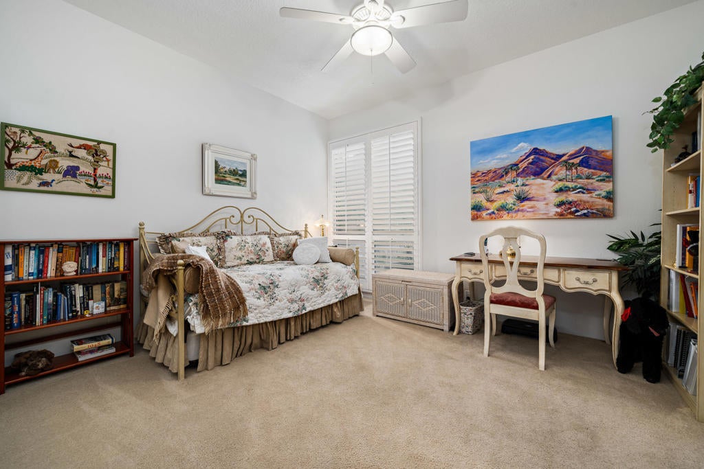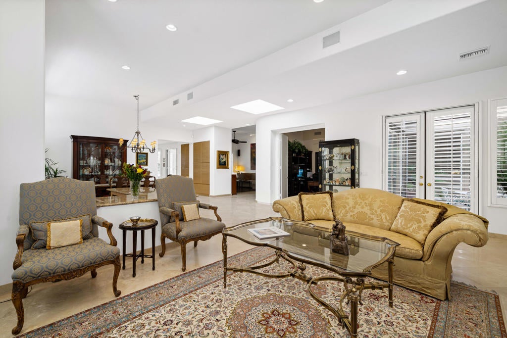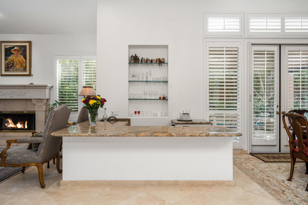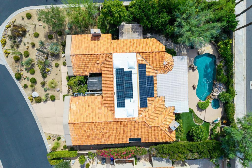 Welcome to this beautifully upgraded 4-bedroom, 4-bathroom residence, ideally positioned on a desirable secluded corner lot within the guard-gated community of Monterra in South Palm Desert. Capturing breathtaking west-facing mountain views, this home perfectly blends sophisticated design, modern comfort, and resort-style living. Step inside to soaring high ceilings, elegant travertine and wood flooring, and a spacious open layout designed for effortless entertaining. The chef's kitchen showcases granite countertops, stainless steel appliances, and a Sub-Zero refrigerator, while multiple fireplaces in the living room and primary suite create warm, inviting spaces to unwind. Outdoors, enjoy your private resort oasis featuring three patios with misters and drop shades; also, including a custom side patio surrounded by pavers, complete with a pergola and seating wall for entertaining and year-round comfort. Bask by the saltwater pool and spa with a tranquil waterfall, or gather on the covered side patio for dining al fresco beneath the desert sky. Every detail has been thoughtfully designed for comfort and efficiency, including owned solar panels, a commercial-grade misting system, custom screens on French doors, ceiling fans, a whole-home instant hot water and water softener, and a kitchen filtration system. The three-car garage provides ample space for vehicles and storage, while low HOA fees add exceptional value. This stunning home embodies the essence of desert elegance, privacy, and functionality--the perfect retreat for full-time residents or seasonal escapes.