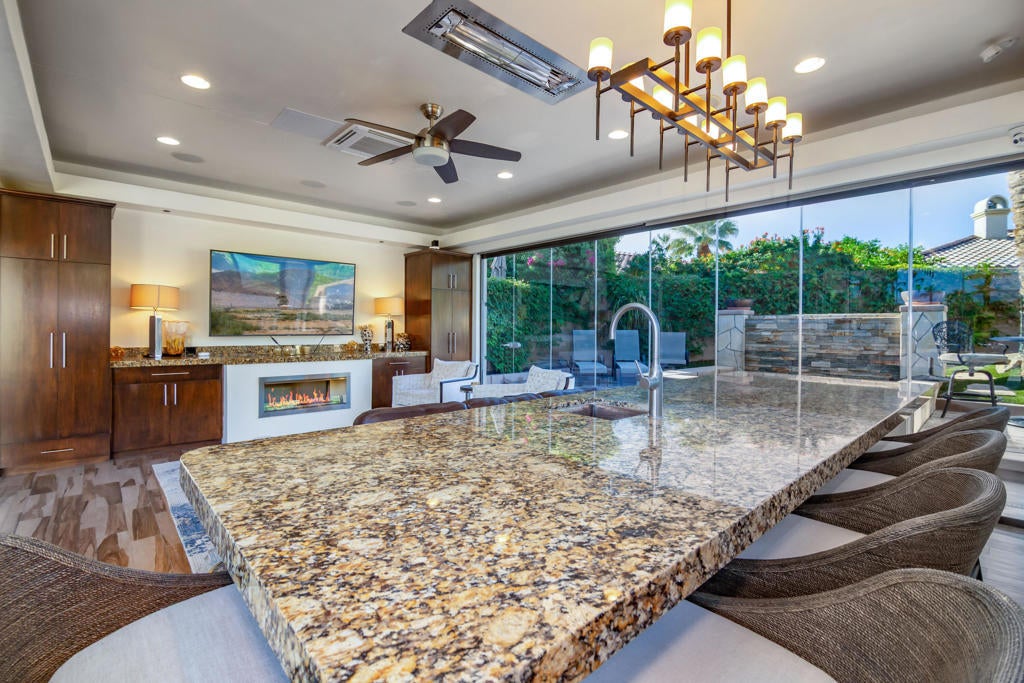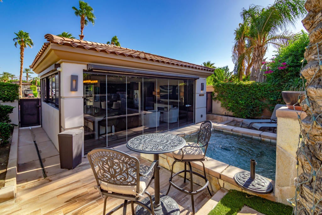Motorcoach Country Club Lot 264 Privacy Developed-Located along Motorcoach Country Club's quiet south wall, Lot 264 offers the perfect blend of privacy, comfort, and functionality. Backing up to a residential neighborhood rather than a major road, this lot provides a peaceful setting without the distraction of traffic noise.The front of the lot features an expanded paver patio with dedicated golf cart parking and charging, plus a large rectangular fire pit with ample seating--ideal for gathering with friends and enjoying the desert evenings. The private backyard offers a spool with a soothing waterfall feature, BBQ island, additional water feature, and synthetic turf area perfect for pets. A large retractable awning extends over the backyard for added shade, creating a comfortable outdoor retreat that can be enjoyed year-round.The attached casita includes a 3/4 bathroom with a full tile shower, generous cabinetry for storage, and its own mini-split system for climate control--perfect for guests or a private workspace. Inside the coach house/tile-roof shade structure, you'll find a full kitchen with dine-in seating, an island with bar seating for up to six, and a cozy living area with fireplace, TV, and comfortable seating. The space is fully enclosed with CoverGlass stacking glass panels, allowing for a seamless indoor/outdoor flow that captures the essence of desert living.Motorcoach Country Club offers resort-style amenities including a private golf course, three pools and spas, pickleball and tennis courts, a fitness center, and a newly renovated clubhouse with on-site restaurant and bar. Scenic canals offer opportunities for boating and paddleboarding, and a vibrant social calendar keeps residents engaged all season long.Motorcoach Country Club exclusively accommodates Class A motorhomes from 30' to 45'. Due to zoning, on-site properties are not considered dwellings, and overnight stays inside them are not allowed. MCC's annual Food & Beverage minimum is $2,080.