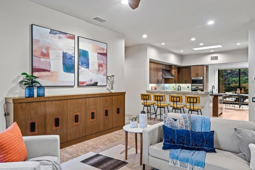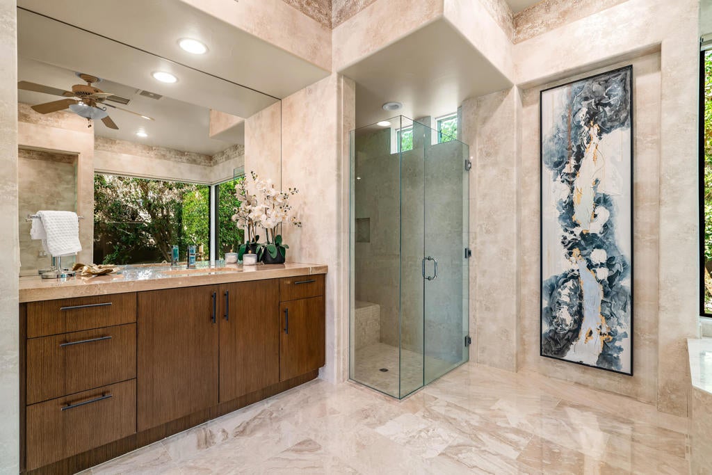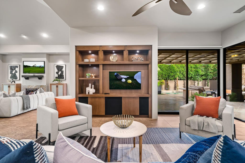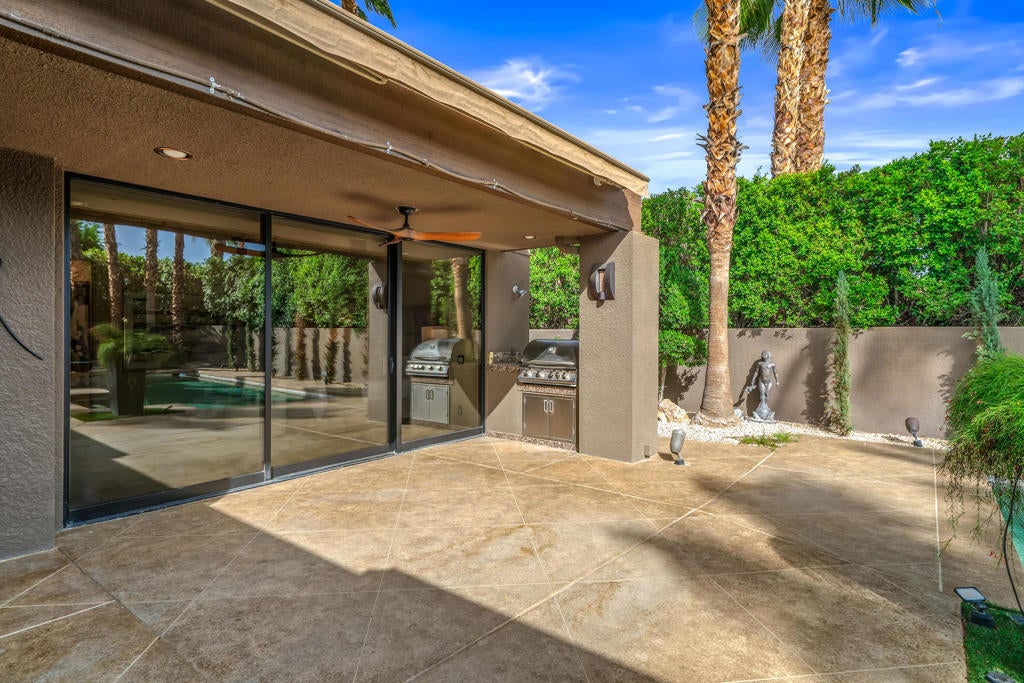 THE EPITOME OF DESERT ELEGANCE IN PRESTIGIOUS PAINTED COVE! Embrace refined sophistication in this exquisite contemporary home, perfectly nestled on a serene corner lot within the exclusive gated enclave of Painted Cove in La Quinta. Offering 3723 Sq Ft of beautifully curated living spaces seamlessly blending privacy, luxury and effortless indoor-outdoor living at its finest! A grand arrival begins at the bronze and metal double doors opening to an airy, light filled floor plan that exudes understated elegance. The living room and dining room combination serve as the heart of the home flowing gracefully into the family room, creating a sense of volume, connection and warmth. The ideal setting for both intimate gatherings and grand scale entertaining! The open chef's kitchen is where form meets function, recently elevated with premier sub zero refrigeration, Wolf gas cook top, Wolf high speed oven with 2 warming drawers and a Cove dishwasher completed by a lovely breakfast nook and breakfast bar. Delight in high ceilings, expansive windows and refined finishes that enhance the contemporary ambiance, while new interior paint, luxury vinyl plank flooring throughout add modern cohesive sophistication. Thoughtfully designed, this home features 4 bedrooms and 5 bathrooms ensuring comfort and privacy for all. The generously sized attached casita, with private entrance, provides a serene retreat for guests. The primary suite is a true sanctuary with an oversized walk in closet, spa inspired bathroom with double vanities, new stone flooring and separate shower and tub. Each guest room is an ensuite with one transformed to a refined home office. Not to be forgotten is the interior laundry room with newer appliances. The three car garage has been refreshed with flooring recoated. The third car garage also functions as a personal gym with an mini split A/C! OUTDOORS discover a private resort style oasis around the entire home, framed by lush low maintenance landscaping. The sparling pool/spa beckons relaxation, supported by a high efficiency Pentair pump and Aquastar filtration system! Electric retractable awnings create shaded retreats ideal for alfresco dining, quiet morning or sunset gatherings! Abundant serenity, beauty and impeccable design can be found here! Close to amazing golf, fine dining, shopping and the Indian Wells Tennis Gardens! LUXURY. GRACE. LIFESTYLE is what you find here at Painted Cove in La Quinta!!
