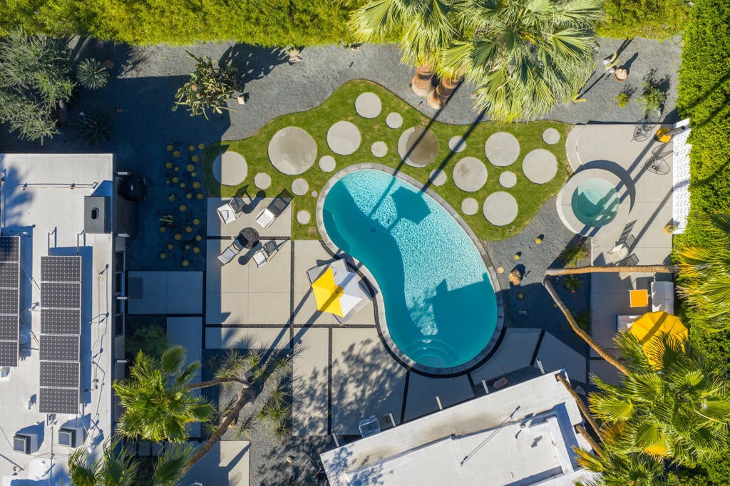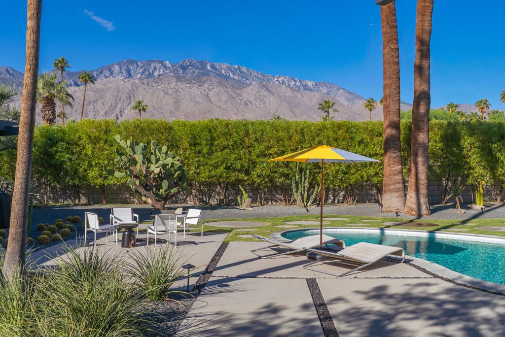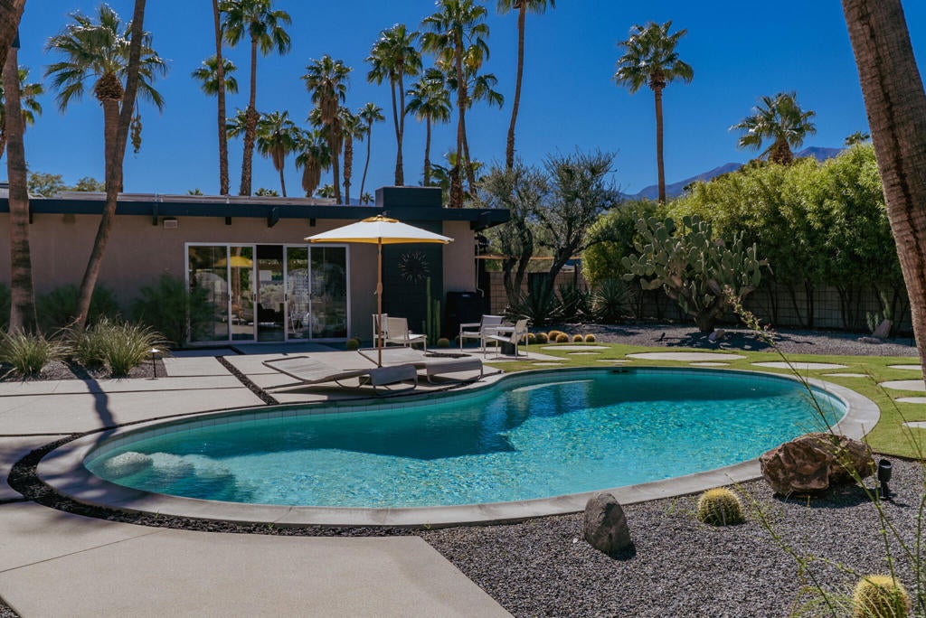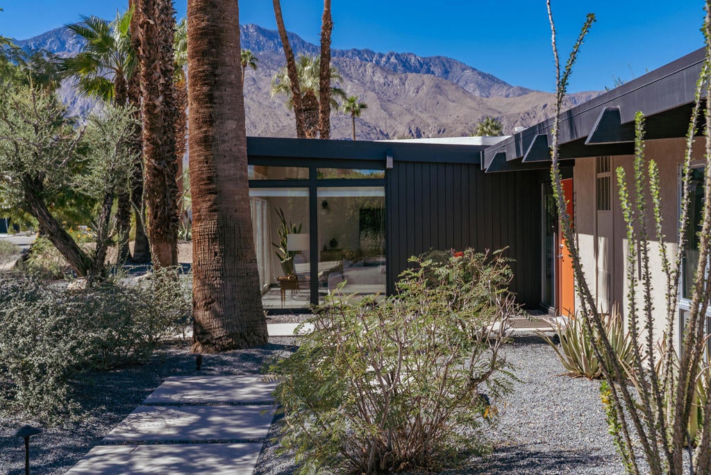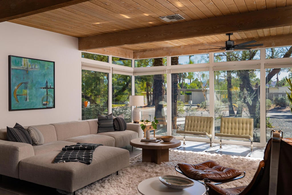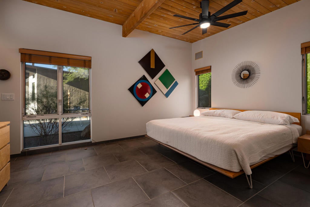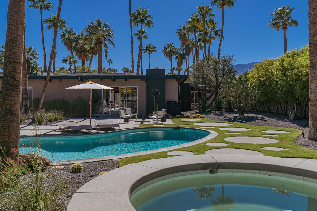 Midcentury architectural gem on an oversized lot with large casita! Located in the sought after midcentury neighborhood of Sunmor, surrounded by highly designed midcentury properties. A very private enclave perfect for walking and biking, but also minutes from downtown. Five bedrooms in total, one serving as the perfect home office, three in the main house, and one in the casita, which also features a full kitchen! Beautifully updated to showcase classic midcentury details -- post and beam construction, floor to ceiling plate glass, warm organic tongue and groove ceilings. Exceptionally large main entertaining space for a house of this style. Lush, mature landscaping, with a recently updated pool and hardscape. Backyard is fully walled and driveway features a motorized gate for privacy. 35 panels (8.575 kW) of fully owned solar. The street presence is iconic, and the pedigree is purely Palm Springs.