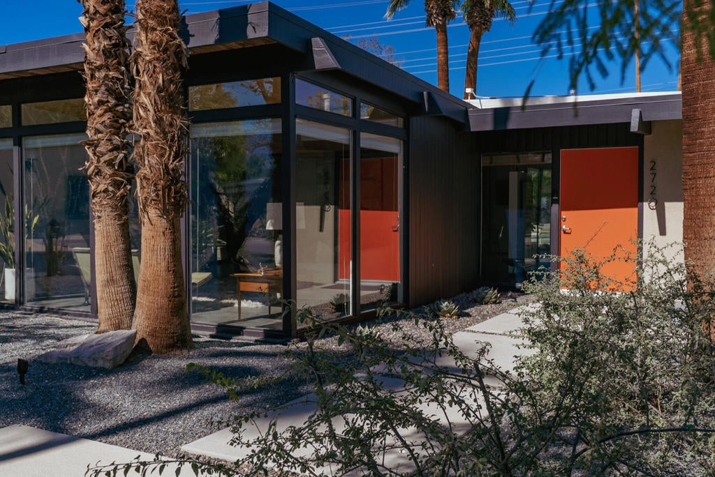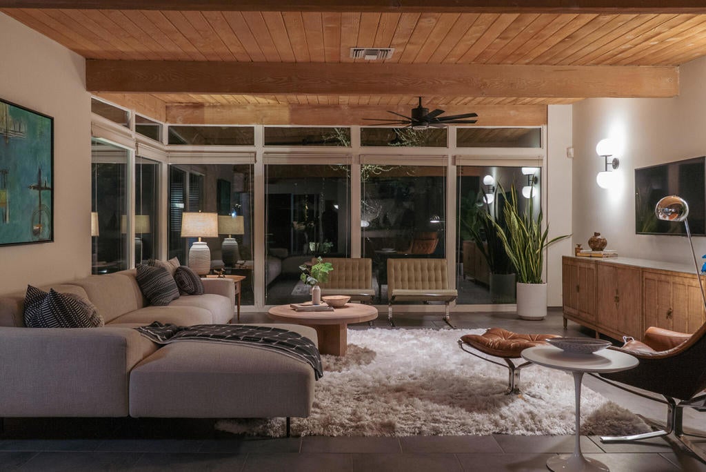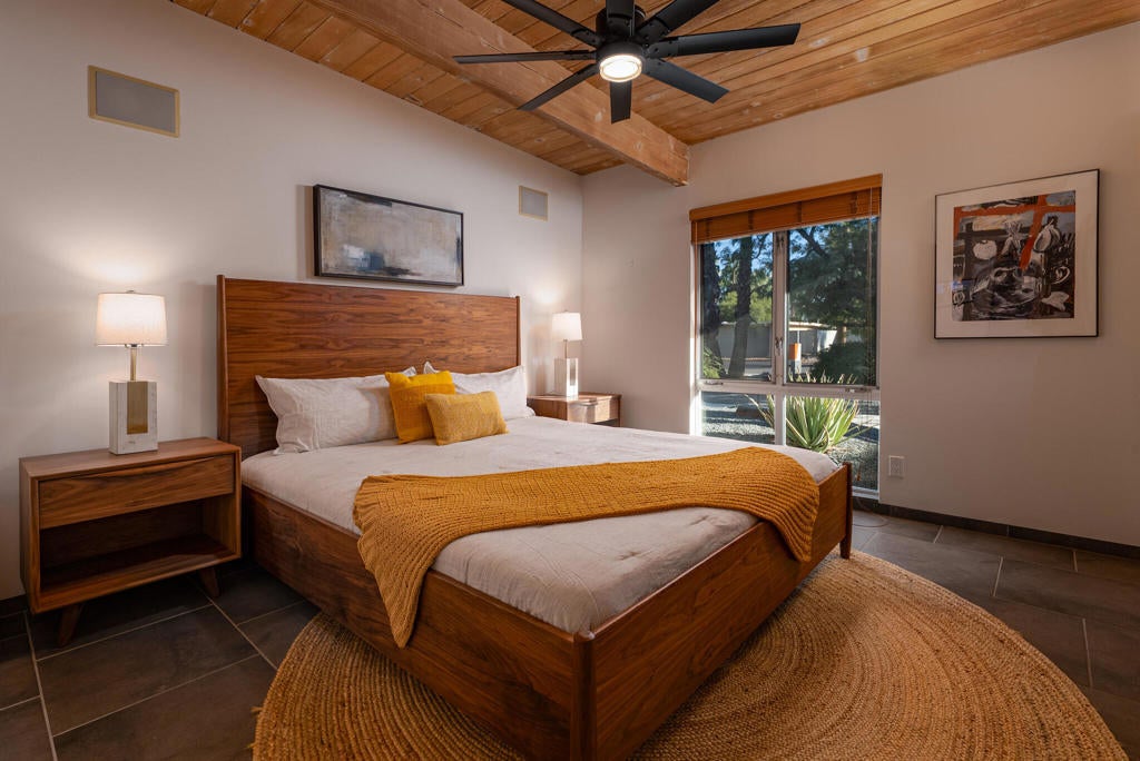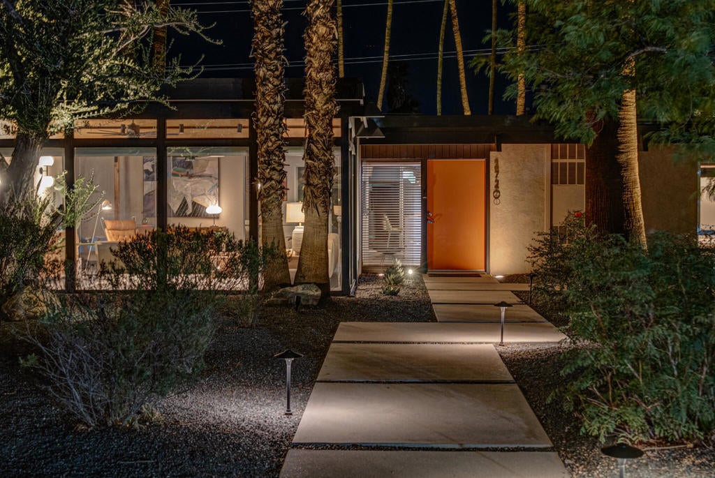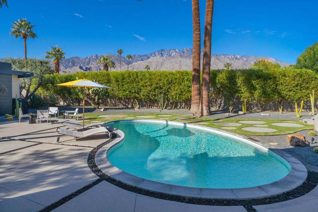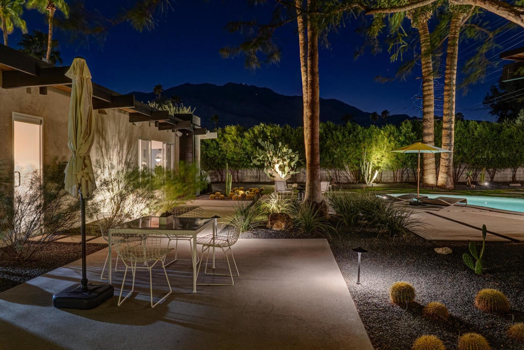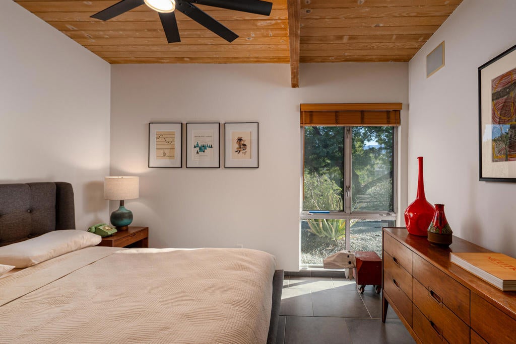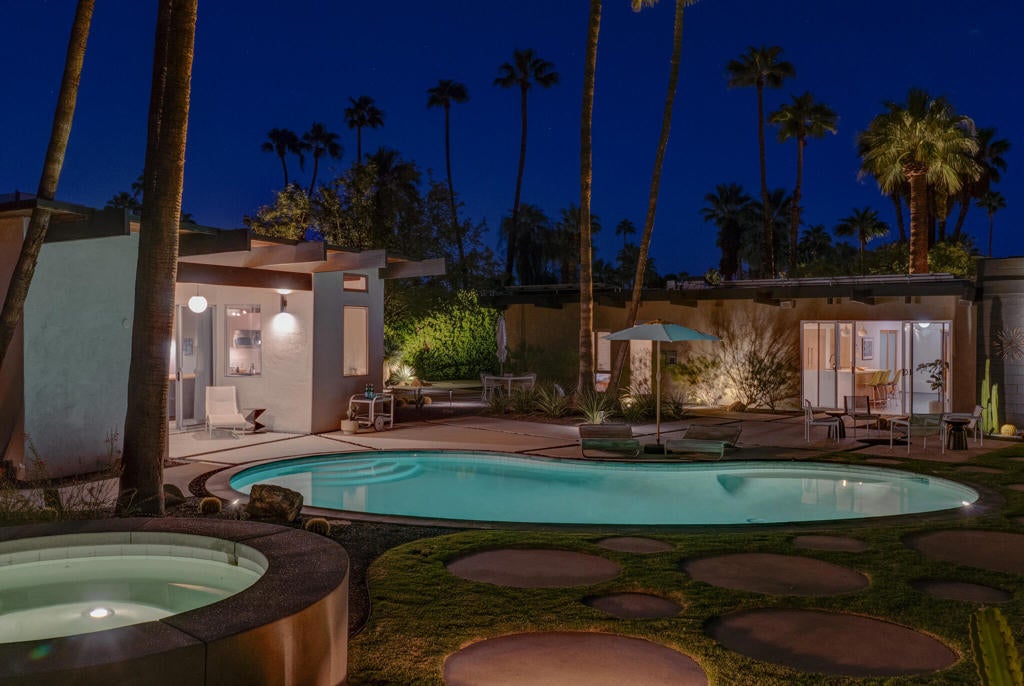 Midcentury architectural gem on an oversized lot with large casita! Located in the sought after midcentury neighborhood of Sunmor, surrounded by highly designed midcentury properties. A very private enclave perfect for walking and biking, but also minutes from downtown. Five bedrooms in total, one serving as the perfect home office, three in the main house, and one in the casita, which also features a full kitchen! Beautifully updated to showcase classic midcentury details -- post and beam construction, floor to ceiling plate glass, warm organic tongue and groove ceilings. Exceptionally large main entertaining space for a house of this style. Lush, mature landscaping, with a recently updated pool and hardscape. Backyard is fully walled and driveway features a motorized gate for privacy. 35 panels (8.575 kW) of fully owned solar. The street presence is iconic, and the pedigree is purely Palm Springs.