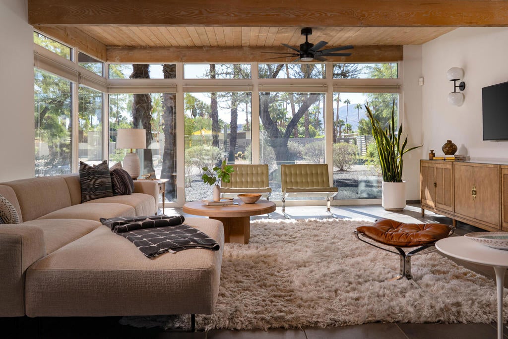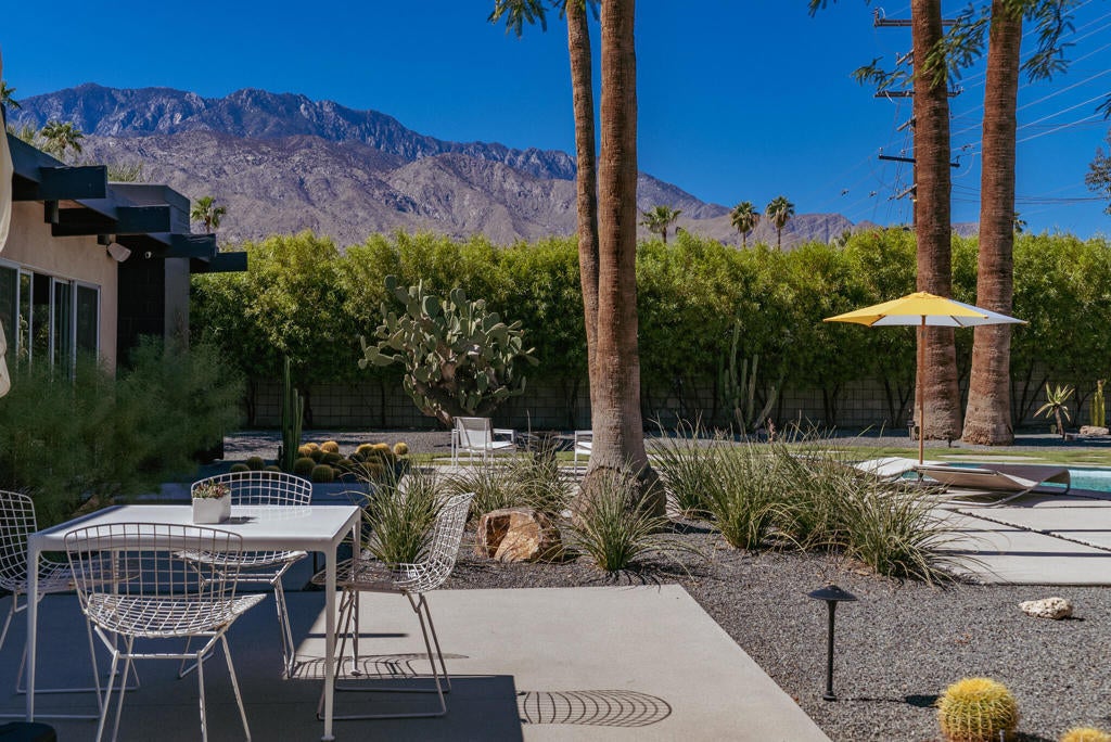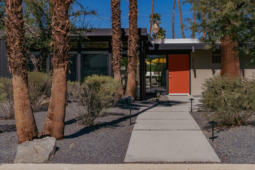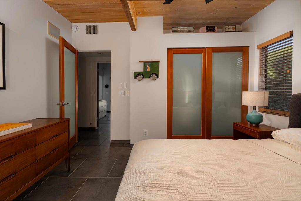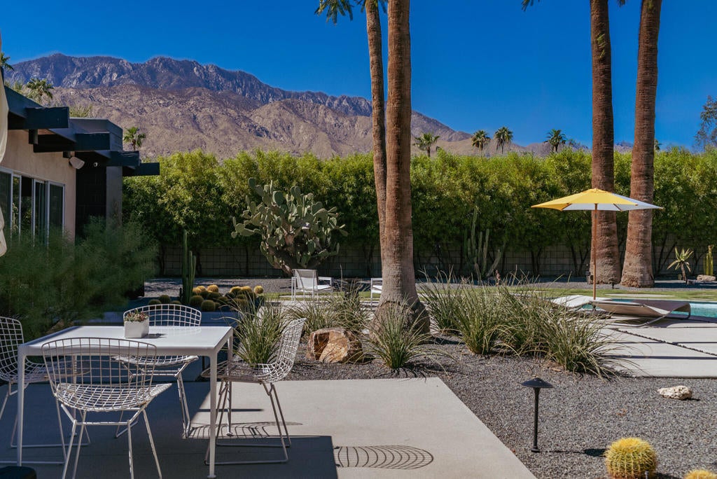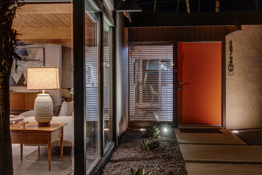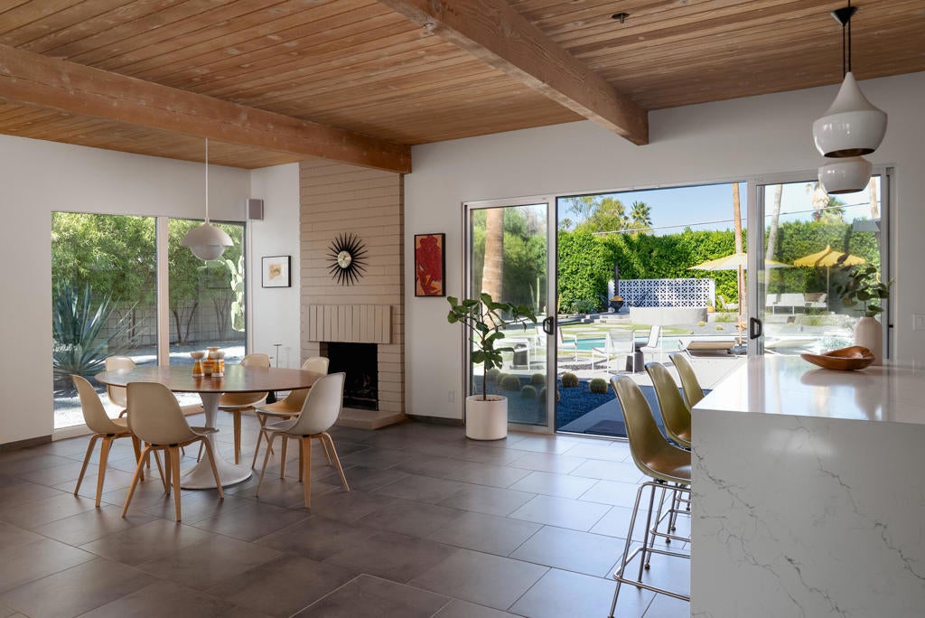 Midcentury architectural gem on an oversized lot with large casita! Located in the sought after midcentury neighborhood of Sunmor, surrounded by highly designed midcentury properties. A very private enclave perfect for walking and biking, but also minutes from downtown. Five bedrooms in total, one serving as the perfect home office, three in the main house, and one in the casita, which also features a full kitchen! Beautifully updated to showcase classic midcentury details -- post and beam construction, floor to ceiling plate glass, warm organic tongue and groove ceilings. Exceptionally large main entertaining space for a house of this style. Lush, mature landscaping, with a recently updated pool and hardscape. Backyard is fully walled and driveway features a motorized gate for privacy. 35 panels (8.575 kW) of fully owned solar. The street presence is iconic, and the pedigree is purely Palm Springs.