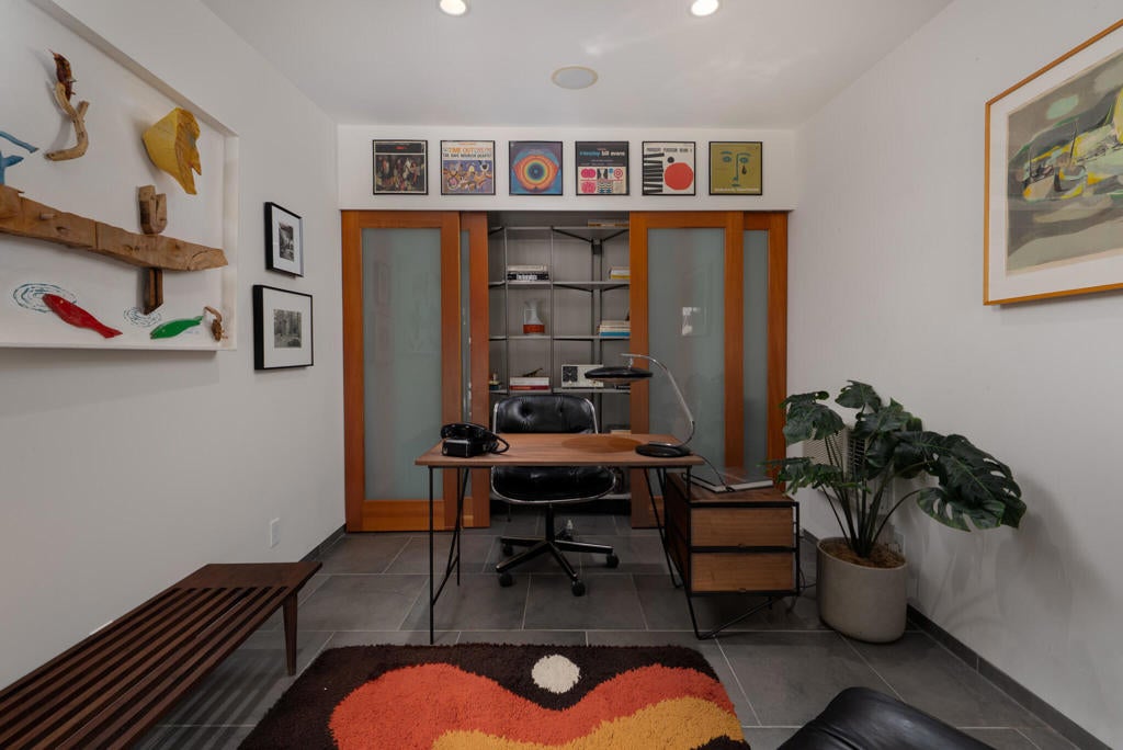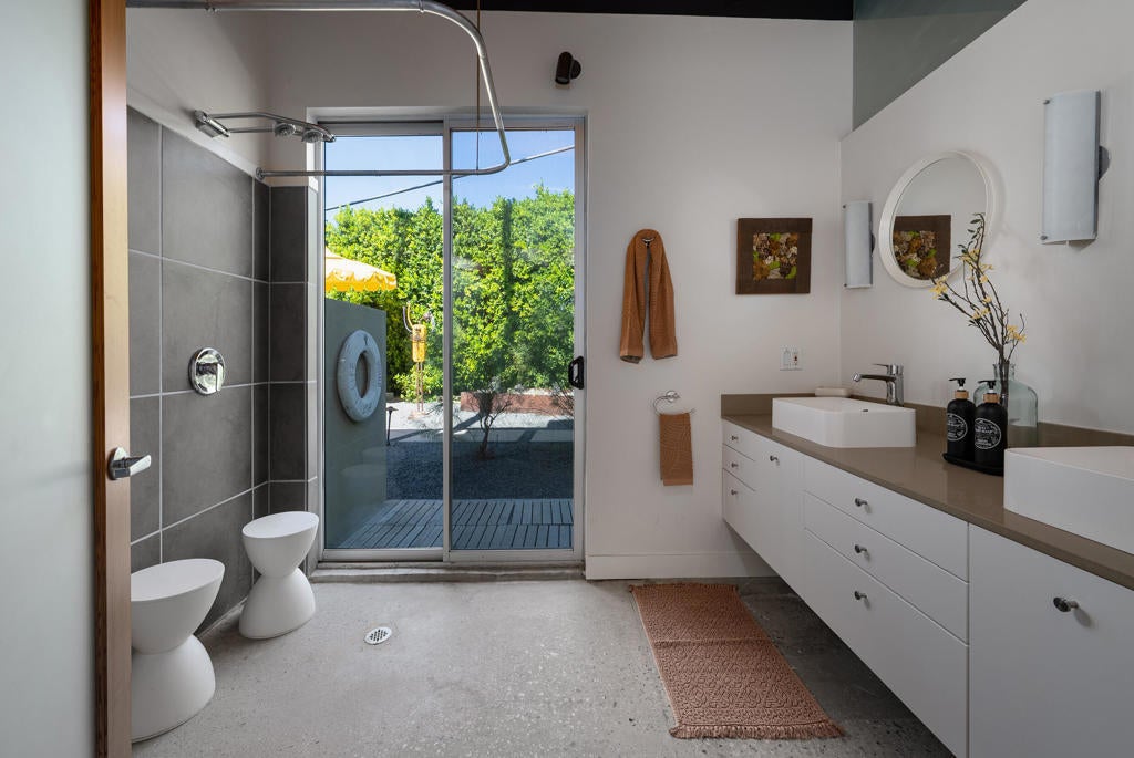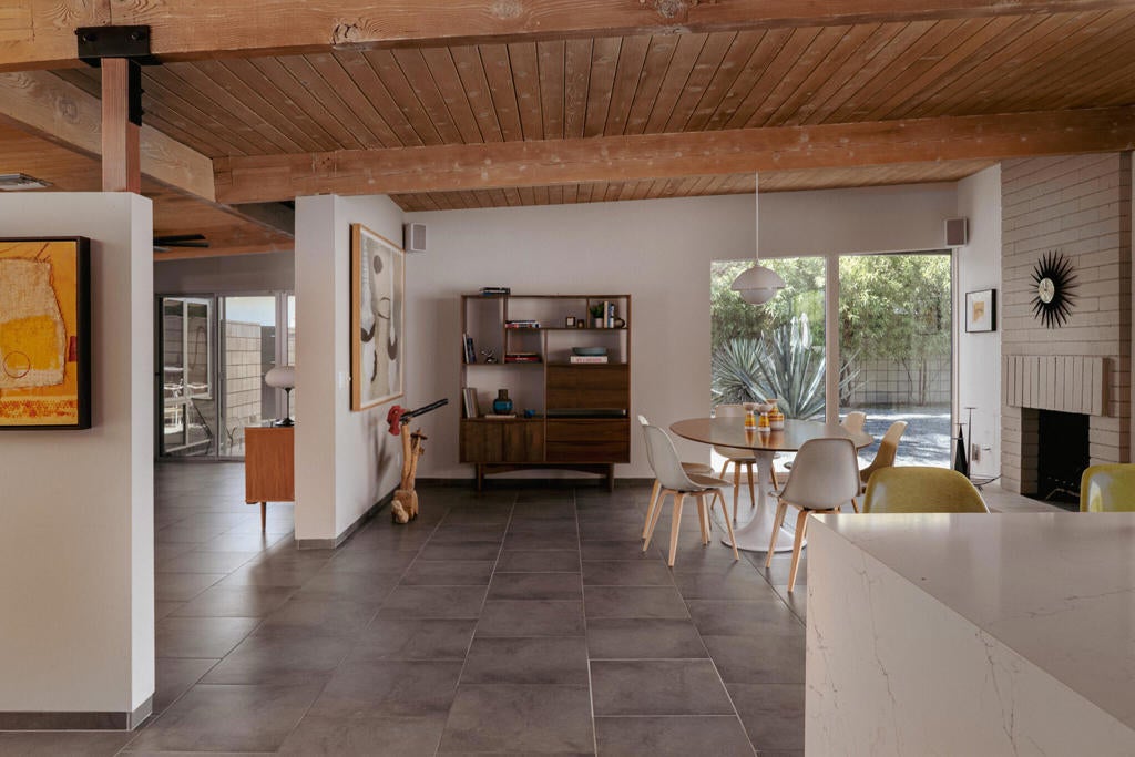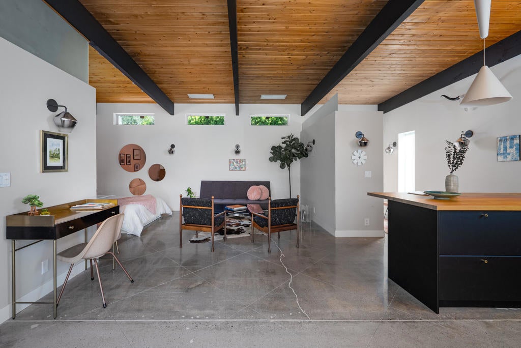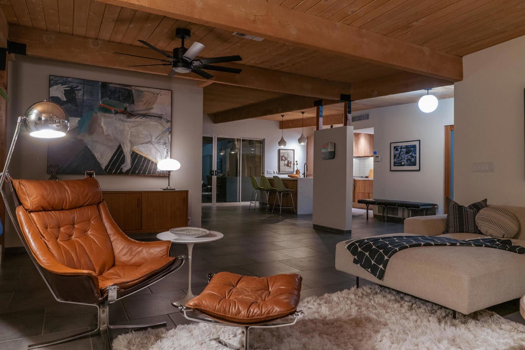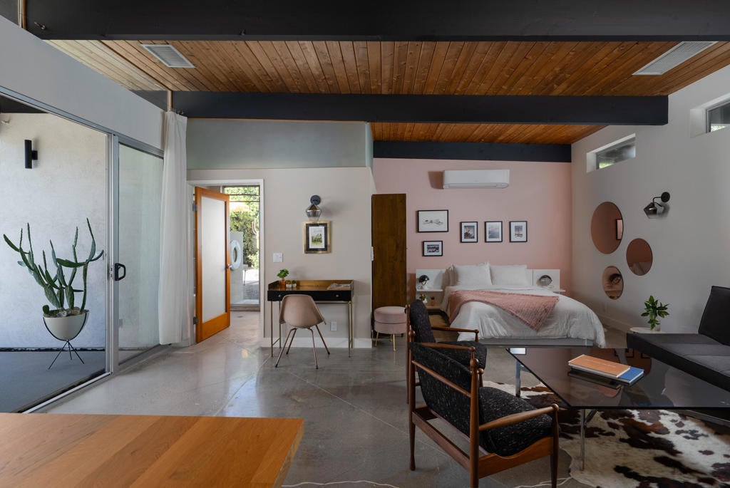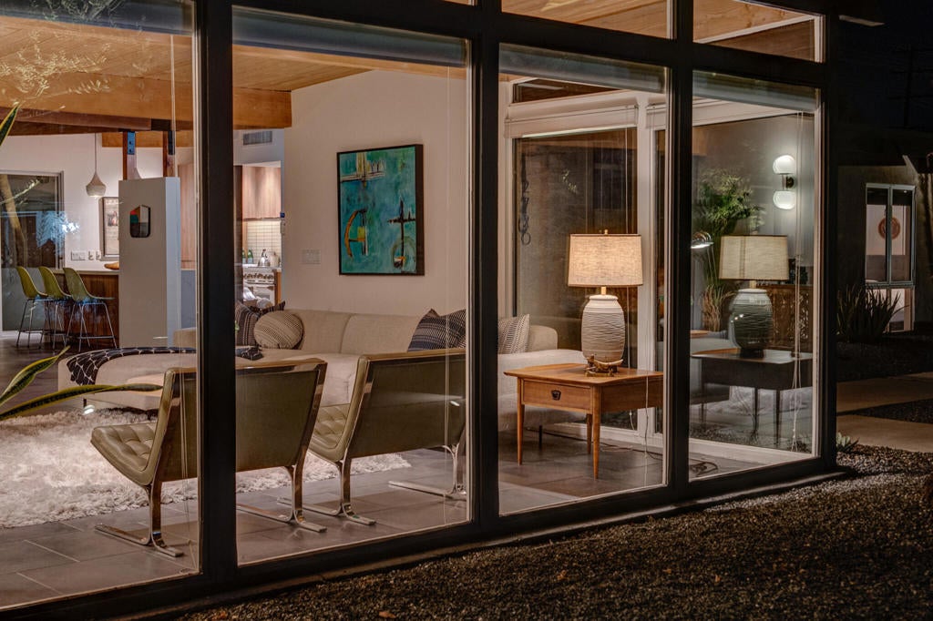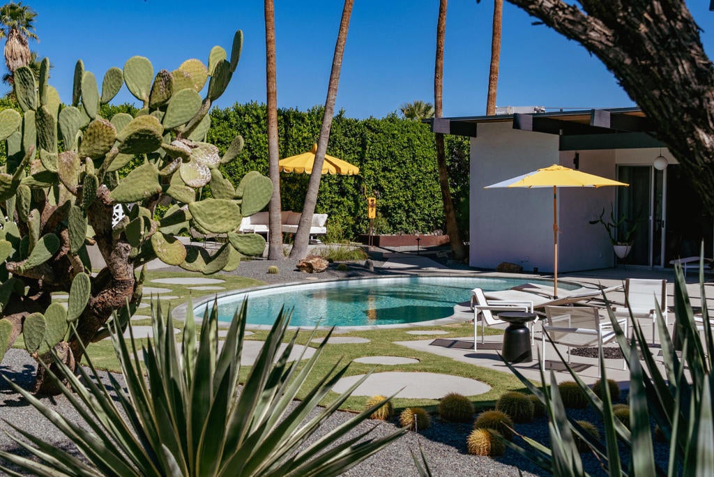 Midcentury architectural gem on an oversized lot with large casita! Located in the sought after midcentury neighborhood of Sunmor, surrounded by highly designed midcentury properties. A very private enclave perfect for walking and biking, but also minutes from downtown. Five bedrooms in total, one serving as the perfect home office, three in the main house, and one in the casita, which also features a full kitchen! Beautifully updated to showcase classic midcentury details -- post and beam construction, floor to ceiling plate glass, warm organic tongue and groove ceilings. Exceptionally large main entertaining space for a house of this style. Lush, mature landscaping, with a recently updated pool and hardscape. Backyard is fully walled and driveway features a motorized gate for privacy. 35 panels (8.575 kW) of fully owned solar. The street presence is iconic, and the pedigree is purely Palm Springs.
