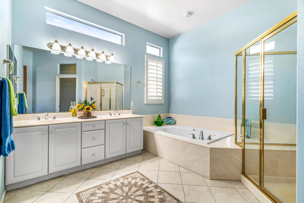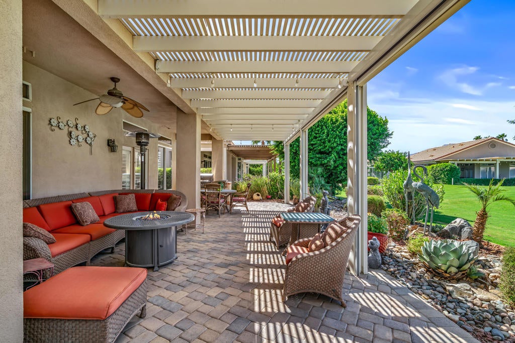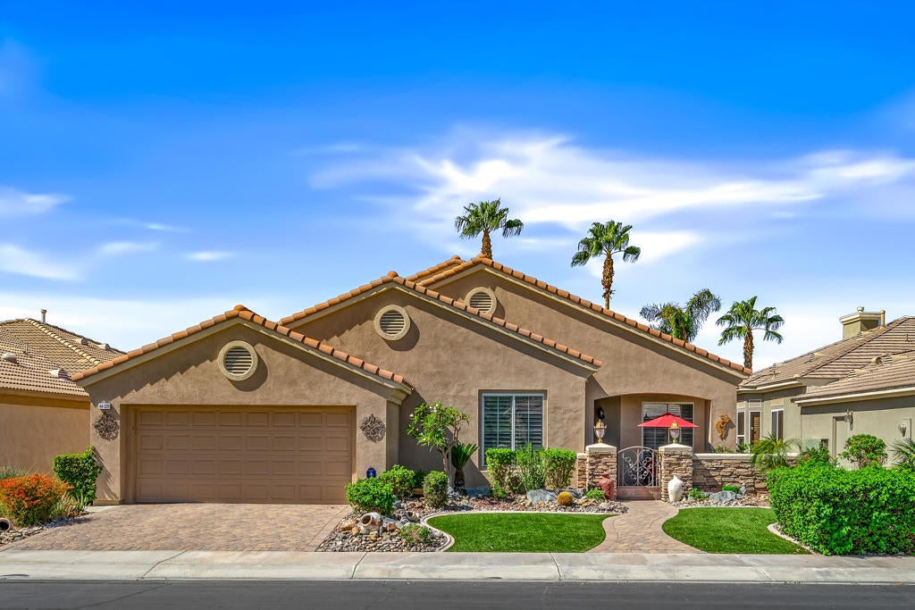 SPECTACULAR VIEWS from this 2407 sq.ft. 2 bed, 2 bath PLUS DEN home in Heritage Palms C.C. Featuring beautiful brick paver driveway AND extended paver front and rear patios, artificial turf, desert style landscaping, entry courtyard and leaded glass front door. This spacious OPEN DESIGN has plenty of room for your large dining parties, casual bar with sitting area to entertain guests and family room off of the beautiful island design kitchen with new stainless appliances. Additional upgrades include recently replaced dual A/C units, garage A/C, plantation shutters, French patio doors and electric sun shades across the entire extended rear patio that has dramatic views of the 14th and 15th fairways, lake w/fountain and panoramic VIEWS of the mountains. The large primary suite has dual vanities, separate tub & shower and a large walk-in closet. This unique layout also includes an oversized laundry room with loads of cabinetry and folding counter. Heritage Palms is a premier adult community featuring an 18 hole championship golf course, indoor & outdoor pools, pickle ball & tennis courts, fitness center, grill room, card rooms, social clubs and more.