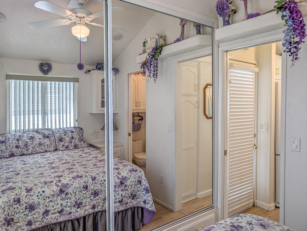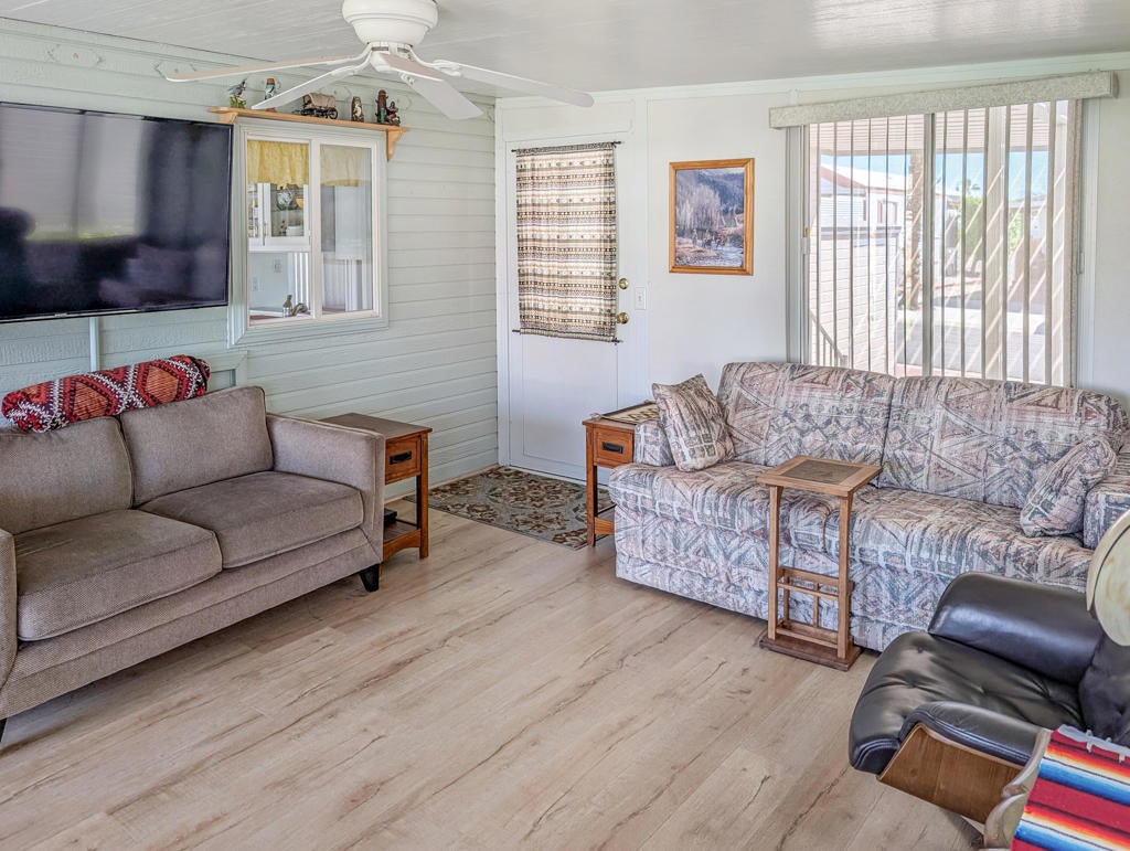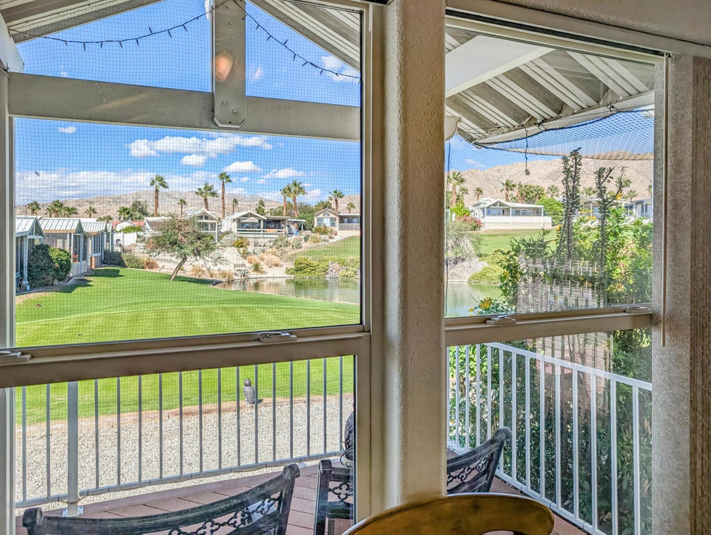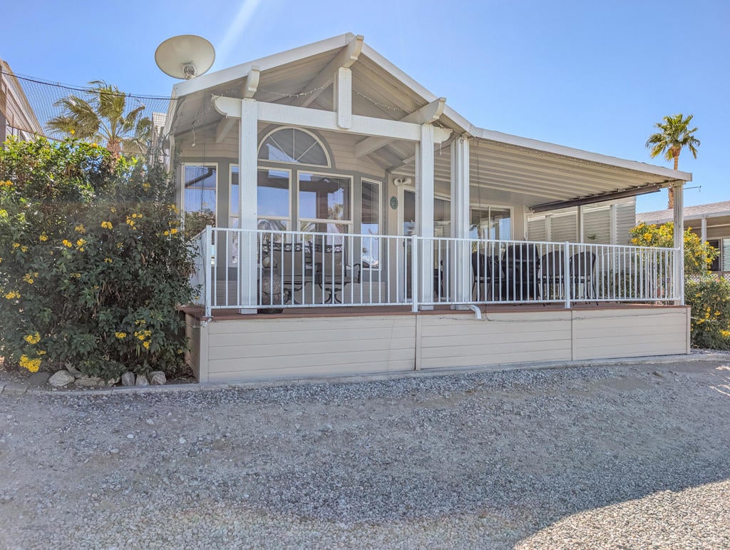 This stunning home radiates charm and warmth, featuring a meticulously maintained 2005 Hallmark Park Model with approximately 550 sq. ft. of living space. The residence includes 1 bedroom and 1 bathroom, making it an ideal retreat for comfort and relaxation. Pride of ownership is evident throughout the house, with beautiful wood floors enhancing every room with modern conveniences including a washer/dryer, water softener and a peaceful location, offering amazing views of the 9th hole of the golf course and a lovely water feature while enjoying your own private covered deck, designed to provide a truly incredible outdoor experience. With such inviting scenery, you might find it hard to ever leave this tranquil space. The residence is exceptionally clean and bright, requiring minimal maintenance--perfect for a vacation getaway in the sun or as a full-time home. Caliente Springs is a premiere 55+ gated community nestled in the beautiful desert. Residents enjoy a wealth of amenities, such as: A 9-hole golf course, pickleball and tennis courts, healing mineral fed pool and spas and an active and friendly community. Beyond the inviting comforts of this charming retreat, you'll discover a vibrant lifestyle where neighbors become friends, and every day brings new opportunities for relaxation or recreation. Whether you enjoy morning strolls along manicured paths, friendly matches on the courts, or simply savoring the tranquility of your own oasis, this home offers the perfect blend of privacy and community spirit. With convenient access to resort-style amenities and a welcoming environment, you can embrace the best of desert living and create lasting memories in a place you'll be proud to call home. Lot is not owned; space rent is $950. Golf cart included with home.
