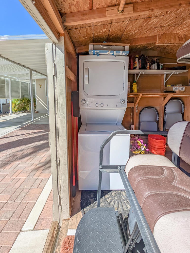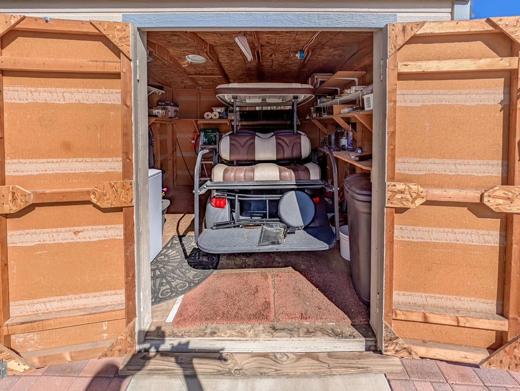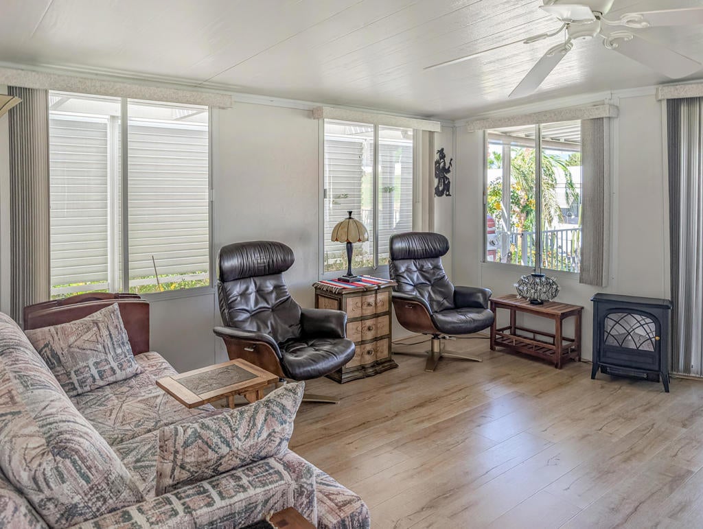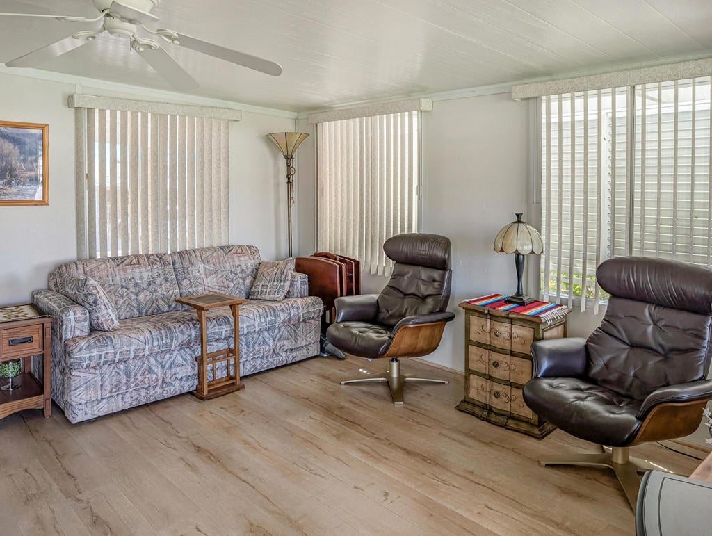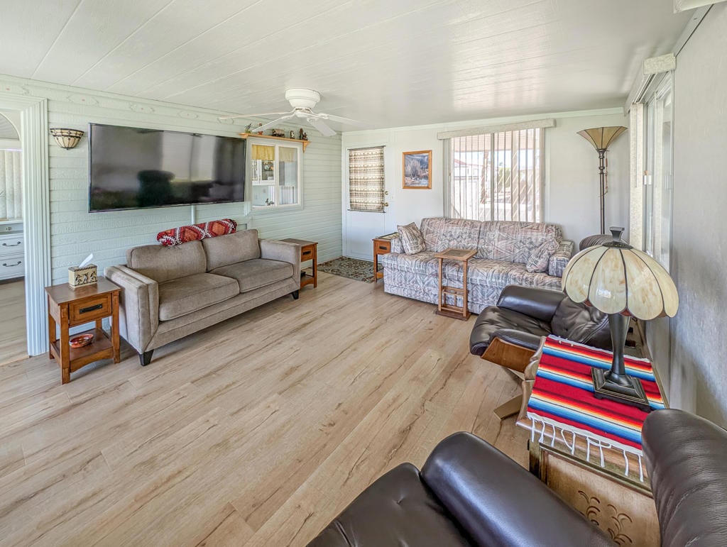This stunning home radiates charm and warmth, featuring a meticulously maintained 2005 Hallmark Park Model with approximately 550 sq. ft. of living space. The residence includes 1 bedroom and 1 bathroom, making it an ideal retreat for comfort and relaxation. Pride of ownership is evident throughout the house, with beautiful wood floors enhancing every room with modern conveniences including a washer/dryer, water softener and a peaceful location, offering amazing views of the 9th hole of the golf course and a lovely water feature while enjoying your own private covered deck, designed to provide a truly incredible outdoor experience. With such inviting scenery, you might find it hard to ever leave this tranquil space. The residence is exceptionally clean and bright, requiring minimal maintenance--perfect for a vacation getaway in the sun or as a full-time home. Caliente Springs is a premiere 55+ gated community nestled in the beautiful desert. Residents enjoy a wealth of amenities, such as: A 9-hole golf course, pickleball and tennis courts, healing mineral fed pool and spas and an active and friendly community. Beyond the inviting comforts of this charming retreat, you'll discover a vibrant lifestyle where neighbors become friends, and every day brings new opportunities for relaxation or recreation. Whether you enjoy morning strolls along manicured paths, friendly matches on the courts, or simply savoring the tranquility of your own oasis, this home offers the perfect blend of privacy and community spirit. With convenient access to resort-style amenities and a welcoming environment, you can embrace the best of desert living and create lasting memories in a place you'll be proud to call home. Lot is not owned; space rent is $950. Golf cart included with home.