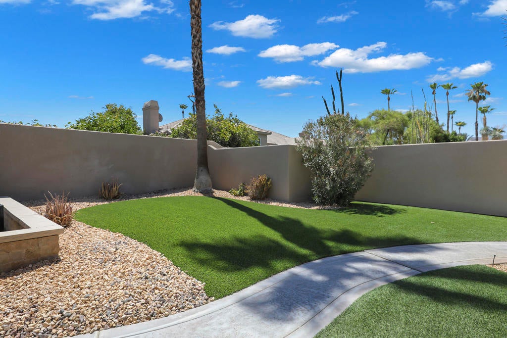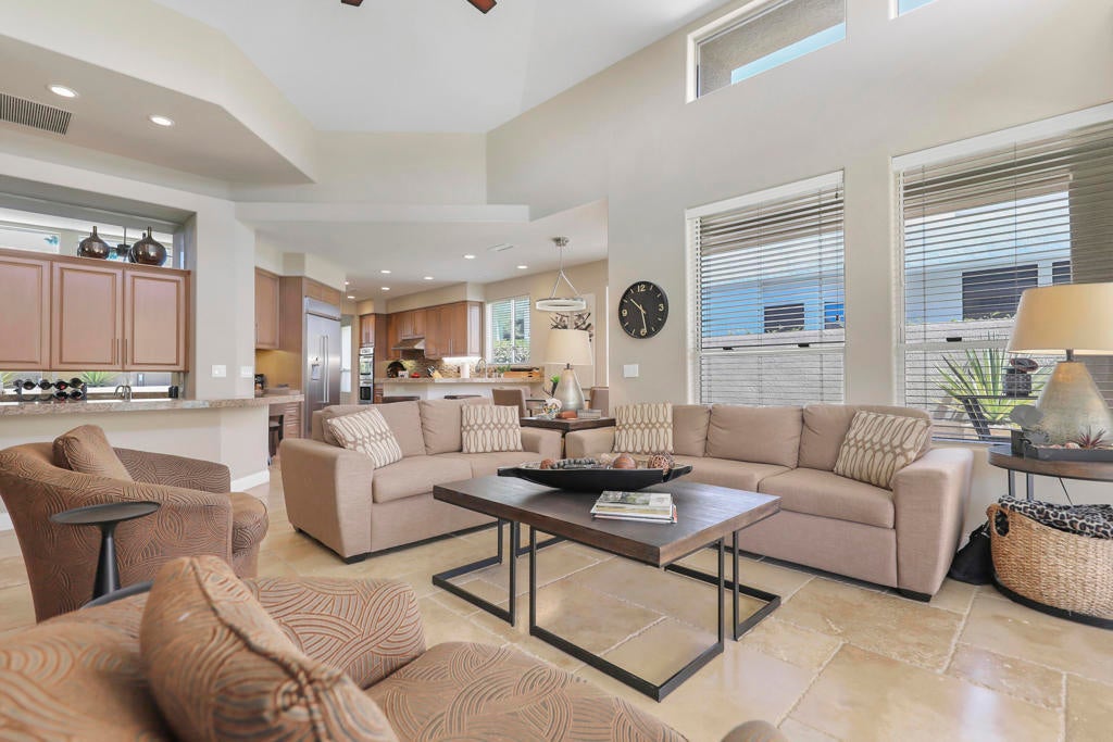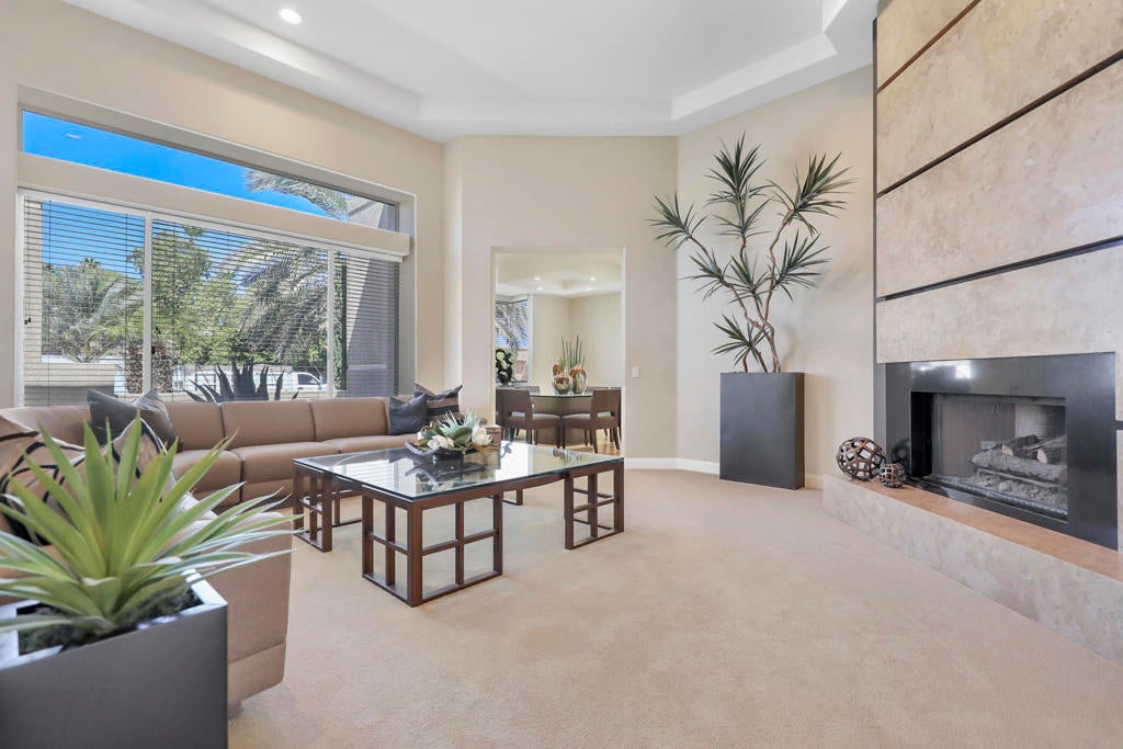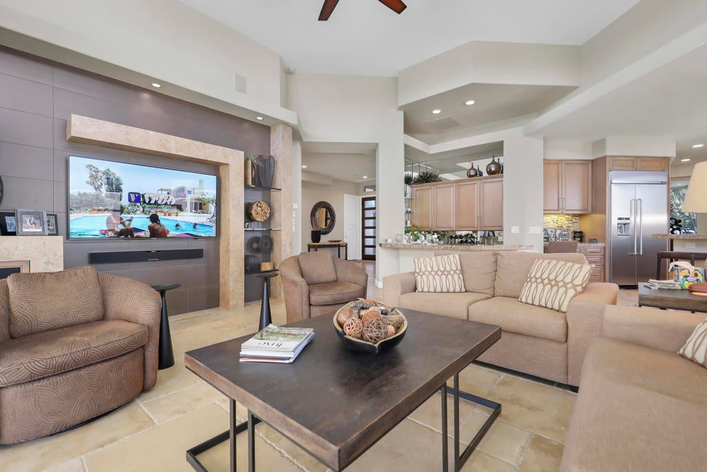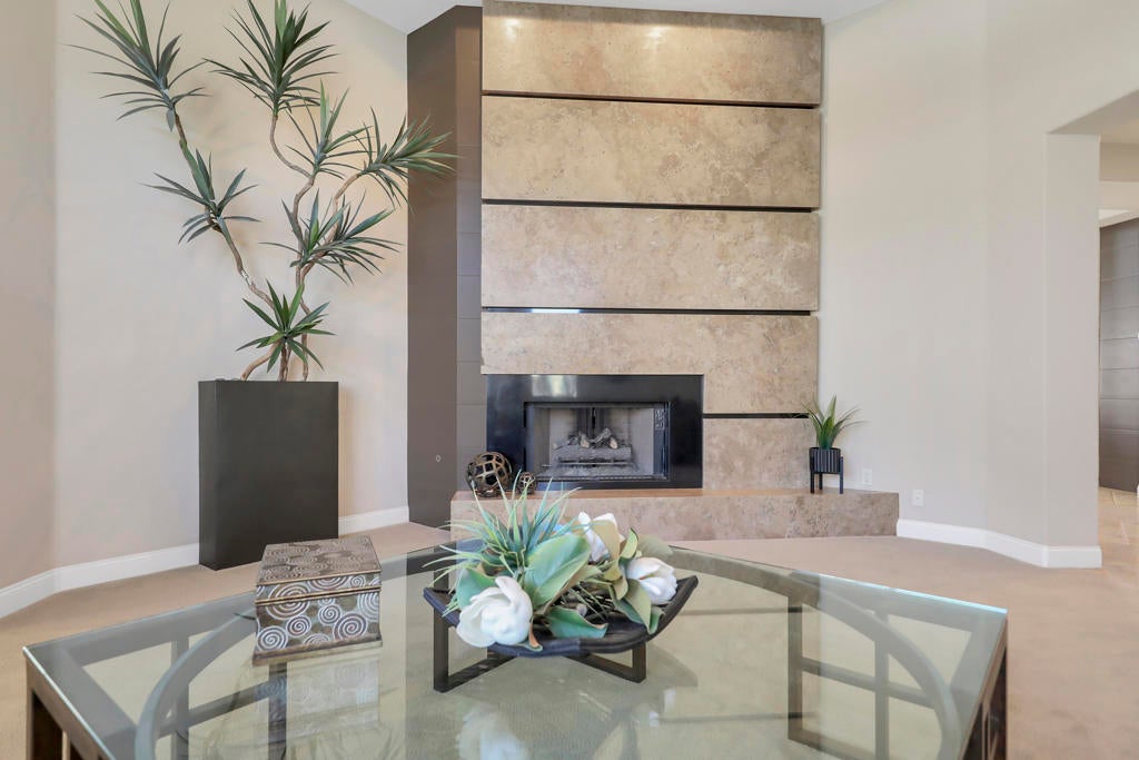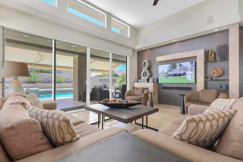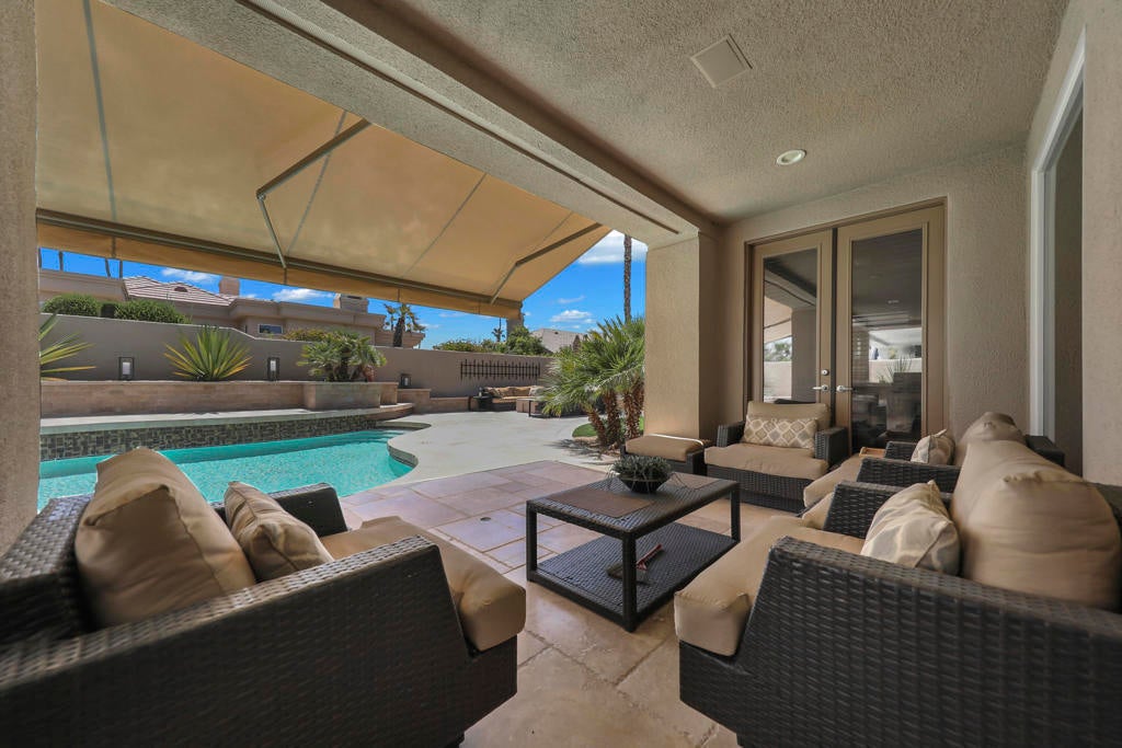 This is a must-see.Private secured entry walk-way lead to double doors and a welcoming foyer.This open floorplan with front door and all interior doors 8 feet highCeilings are coffered and 10 to 13 feet high.All furniture and appliances are top-of-the-line.Kitchen is remodeled with stainless appliances, double ovens and slab granite counter tops.Family room off of kitchen with wet bar.Formal dining room and living room with floor to ceiling marble fireplace.Large master suite with walk-in closet.2 other guest suites with full baths.Separate private office and a den overlooking a dream patio with relaxing pool, spa, built-in BBQ, fire pit, decorative lighting and an awning the width of the patio.New A C, 3 car garage, the best in SOLAR and everything else you could want for.