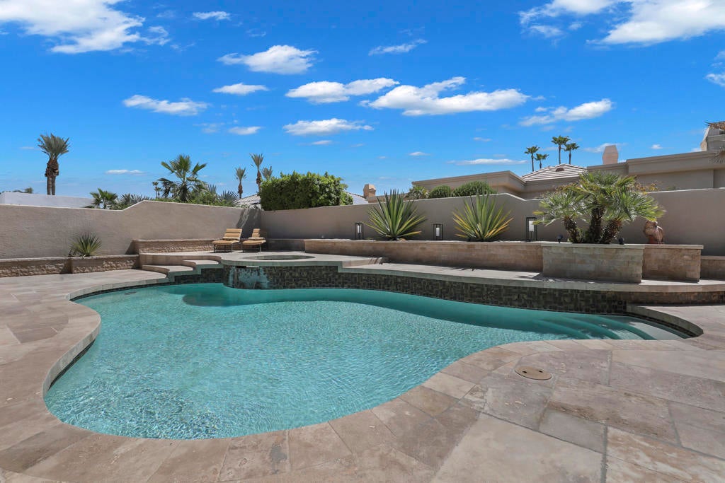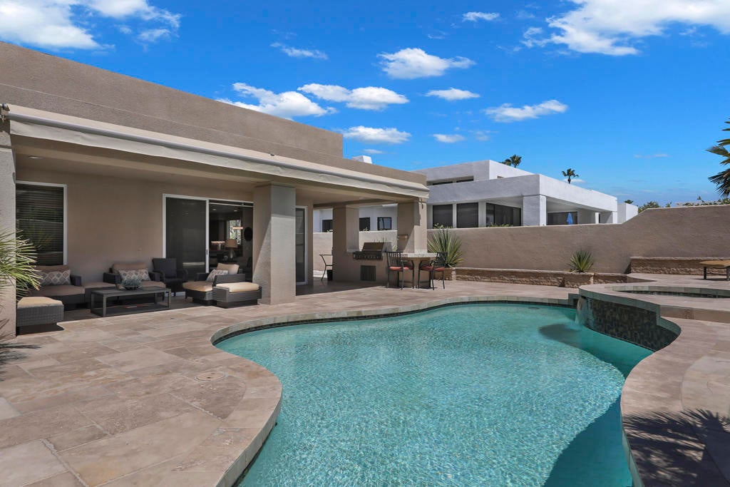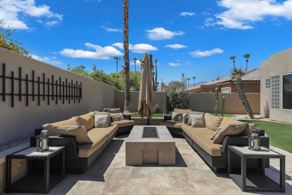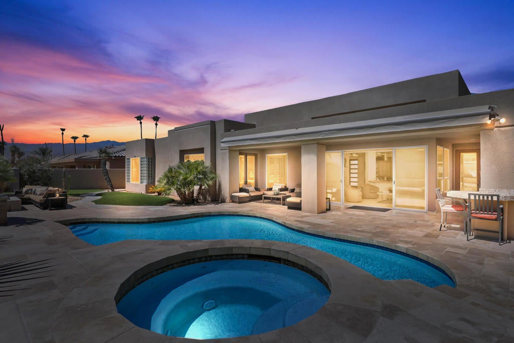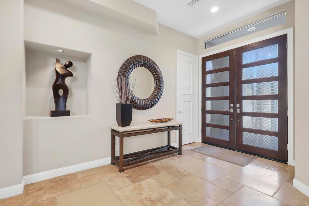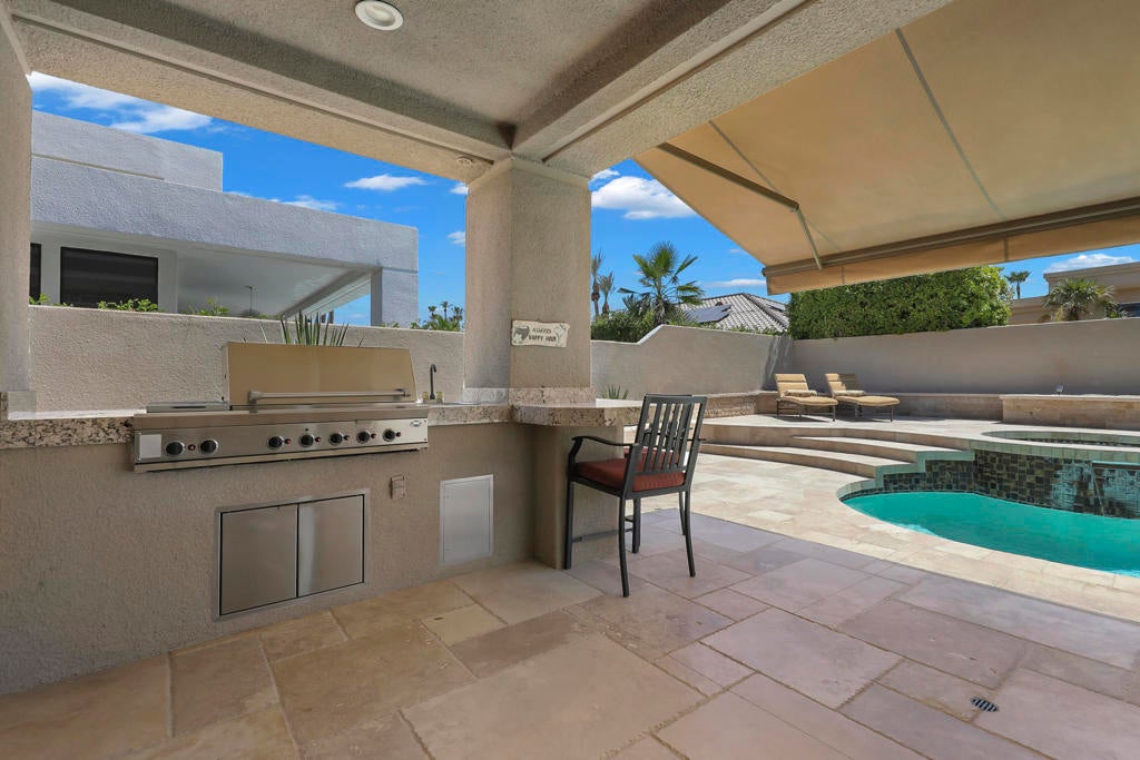 This is a must-see.Private secured entry walk-way lead to double doors and a welcoming foyer.This open floorplan with front door and all interior doors 8 feet highCeilings are coffered and 10 to 13 feet high.All furniture and appliances are top-of-the-line.Kitchen is remodeled with stainless appliances, double ovens and slab granite counter tops.Family room off of kitchen with wet bar.Formal dining room and living room with floor to ceiling marble fireplace.Large master suite with walk-in closet.2 other guest suites with full baths.Separate private office and a den overlooking a dream patio with relaxing pool, spa, built-in BBQ, fire pit, decorative lighting and an awning the width of the patio.New A C, 3 car garage, the best in SOLAR and everything else you could want for.