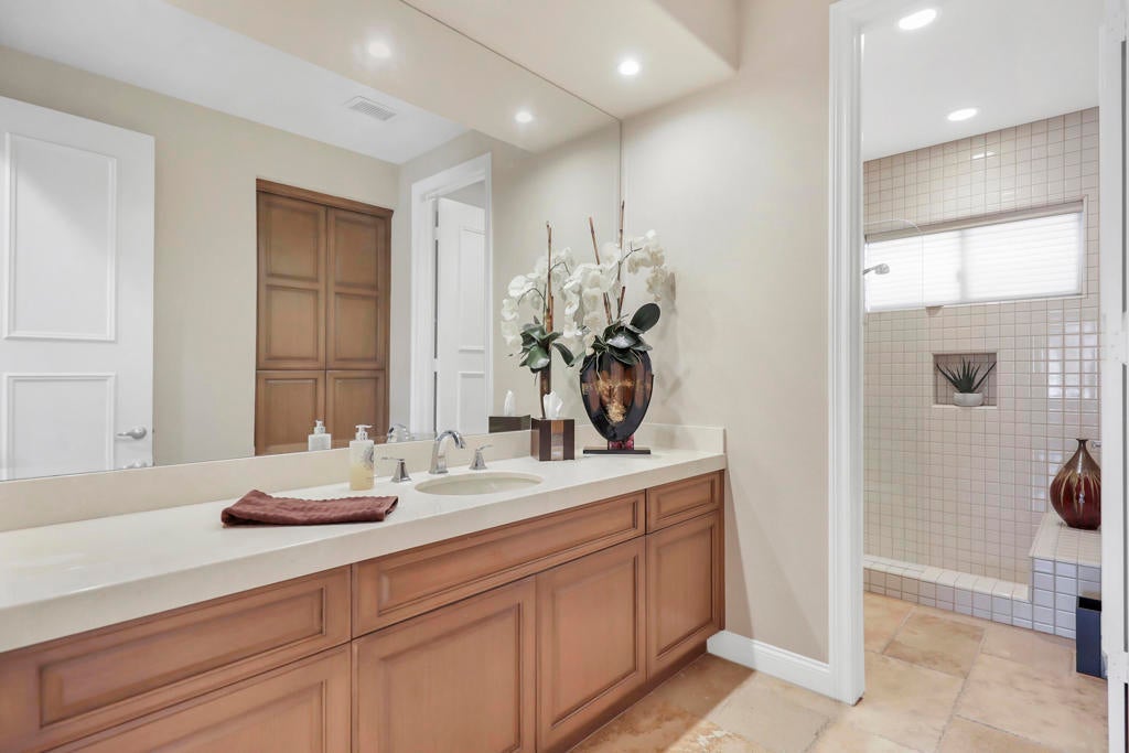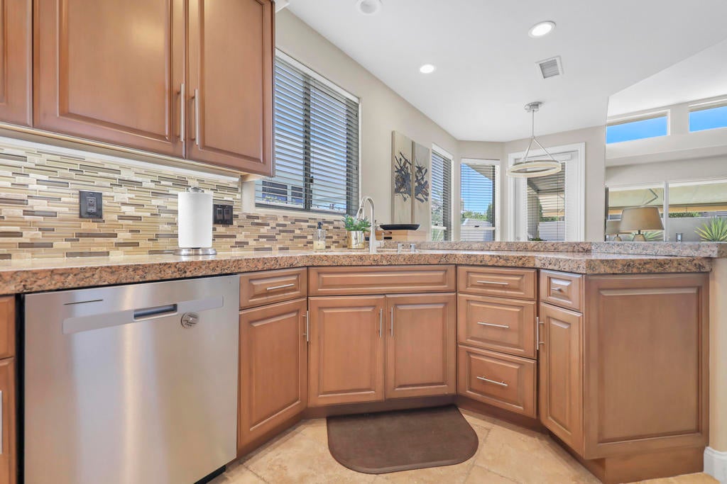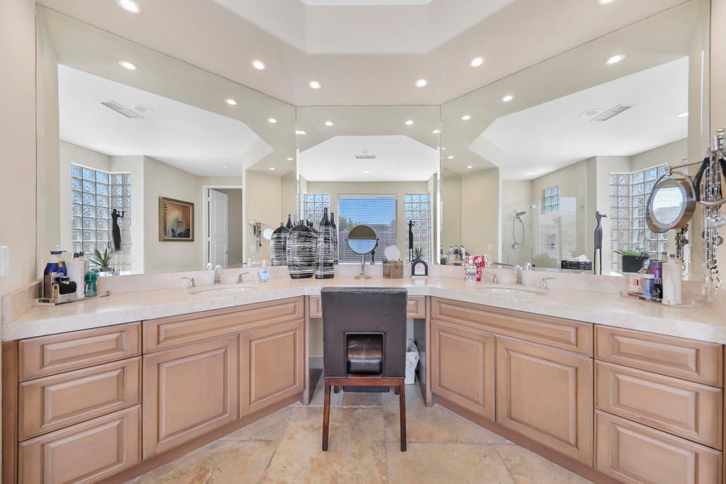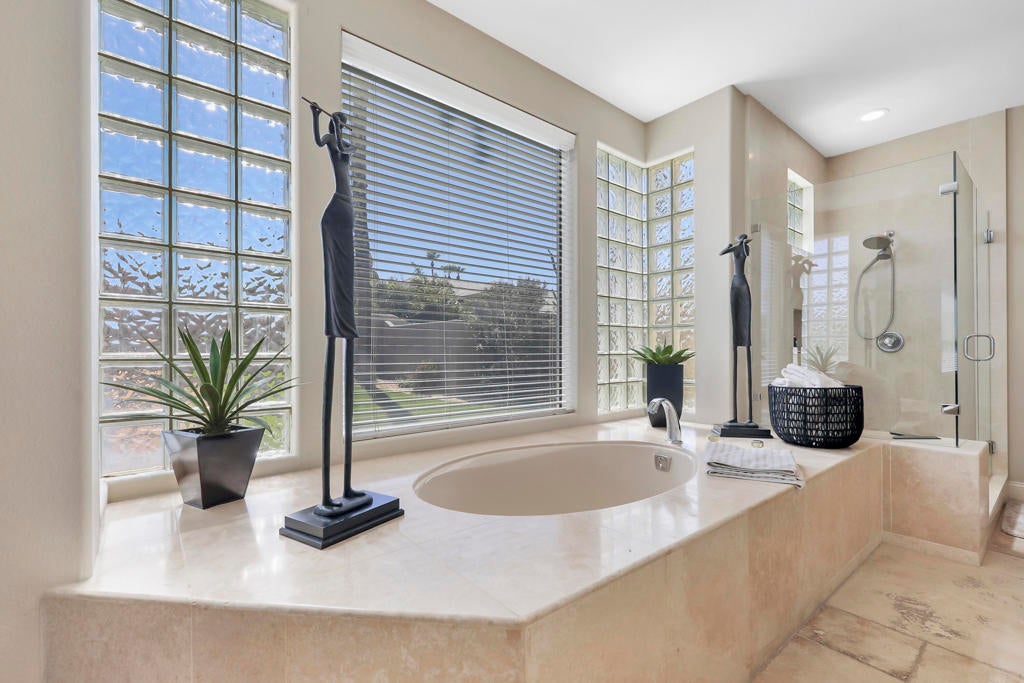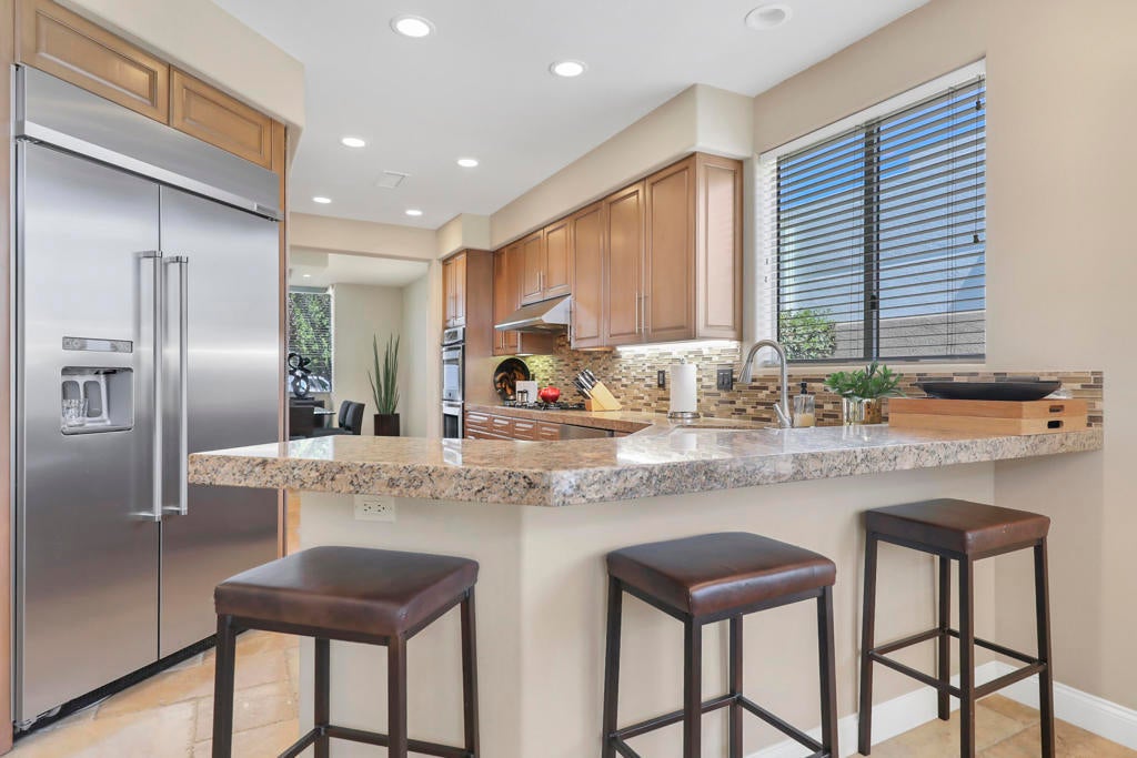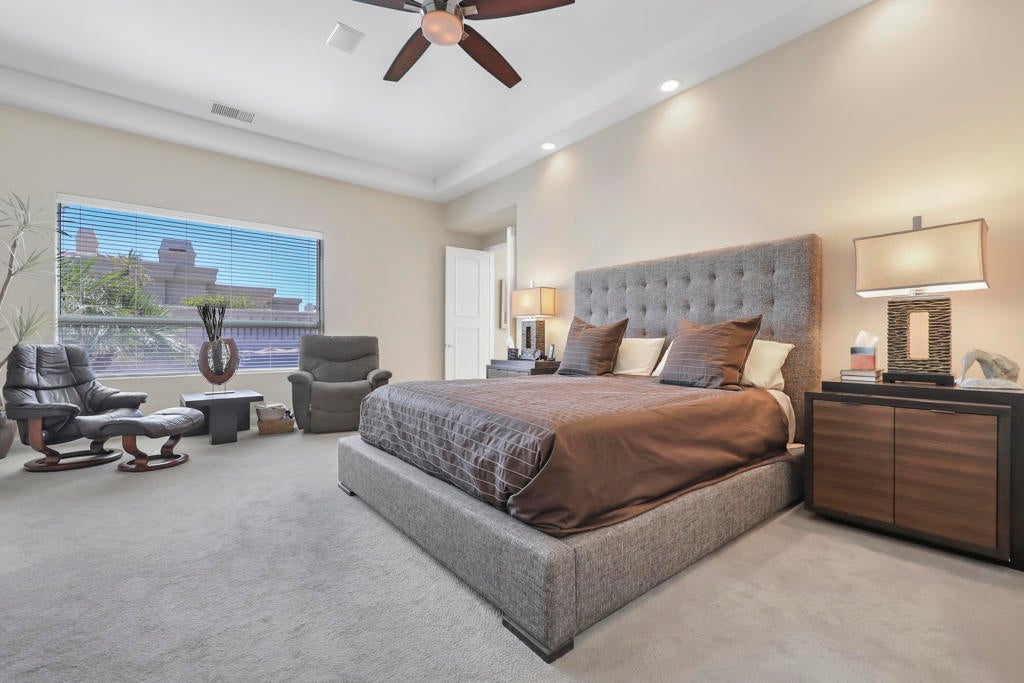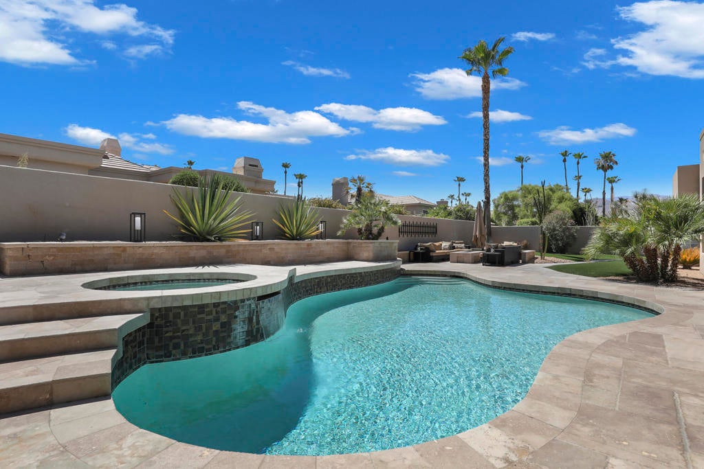 This is a must-see.Private secured entry walk-way lead to double doors and a welcoming foyer.This open floorplan with front door and all interior doors 8 feet highCeilings are coffered and 10 to 13 feet high.All furniture and appliances are top-of-the-line.Kitchen is remodeled with stainless appliances, double ovens and slab granite counter tops.Family room off of kitchen with wet bar.Formal dining room and living room with floor to ceiling marble fireplace.Large master suite with walk-in closet.2 other guest suites with full baths.Separate private office and a den overlooking a dream patio with relaxing pool, spa, built-in BBQ, fire pit, decorative lighting and an awning the width of the patio.New A C, 3 car garage, the best in SOLAR and everything else you could want for.