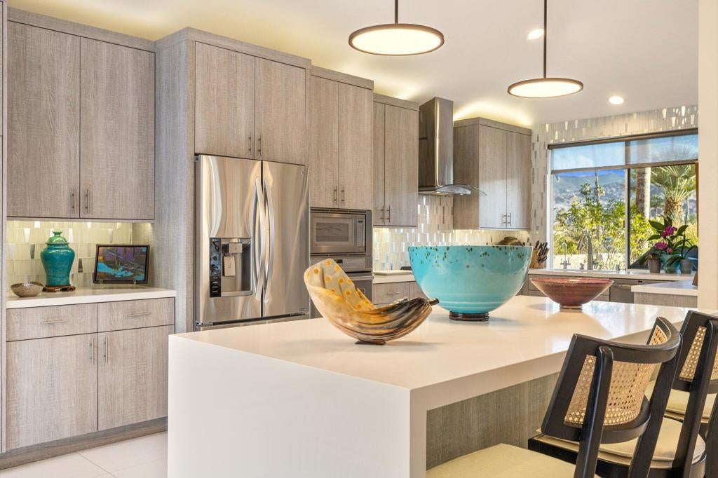 The crown jewel of Lake Mirage. Experience luxurious lakeside living in the heart of exclusive Lake Mirage. This beautifully remodeled 3-bedroom, 2-bath home offers 2,770 square feet of comfortable contemporary design, featuring 24'' white porcelain tile and white quartz countertops throughout, and filled with natural light and stylish upgrades. The third bedroom is currently used as a TV room, would also make a perfect home office.Enjoy breathtaking panoramic southwest views of the lake and surrounding mountains from the spacious great room. Unique accordion sliders open the atrium, transforming it into an additional indoor-outdoor living space ideal for entertaining or relaxing.With direct access from the attached 2-car garage, this light and bright home blends comfort and convenience - perfect for year-round enjoyment or a luxurious retreat.