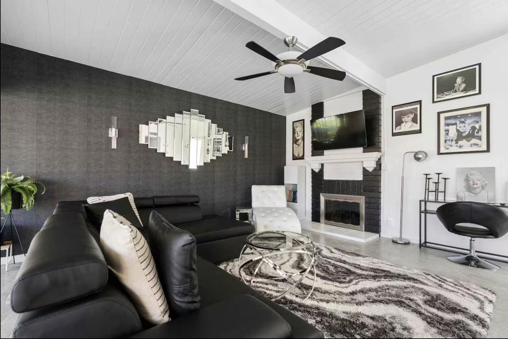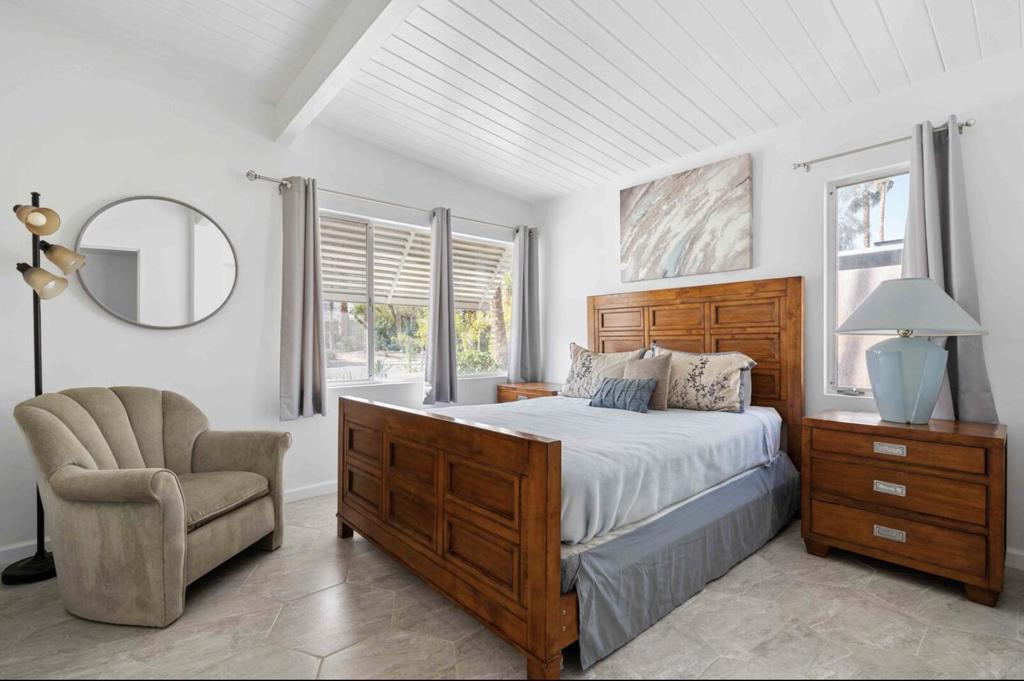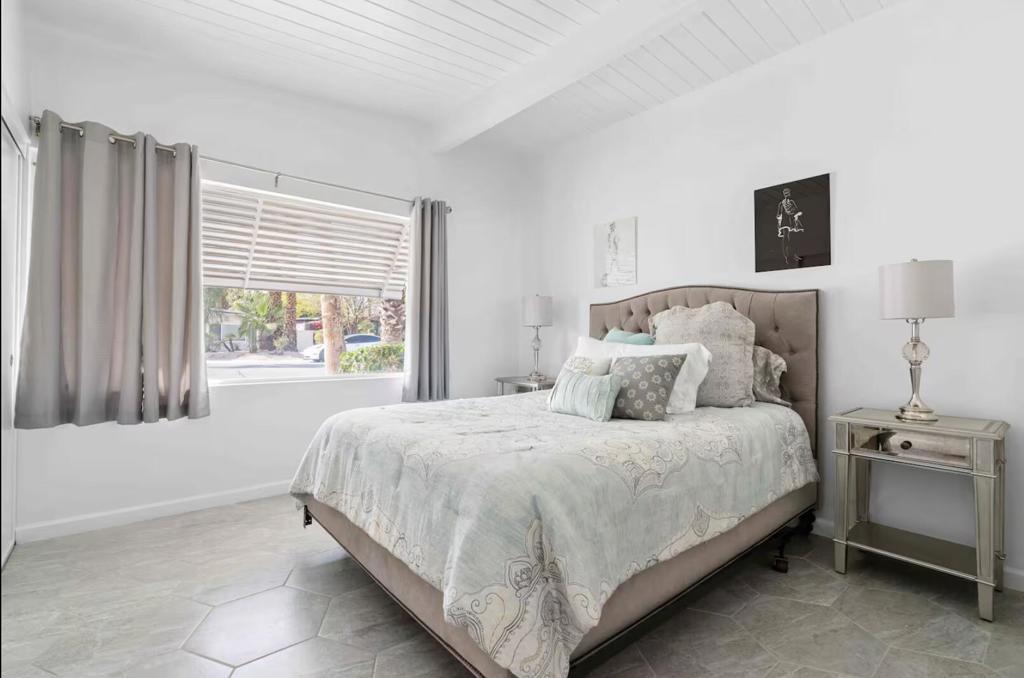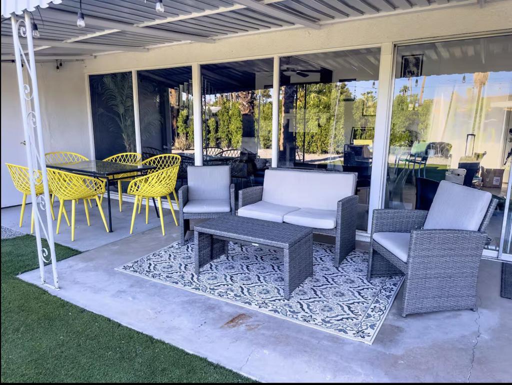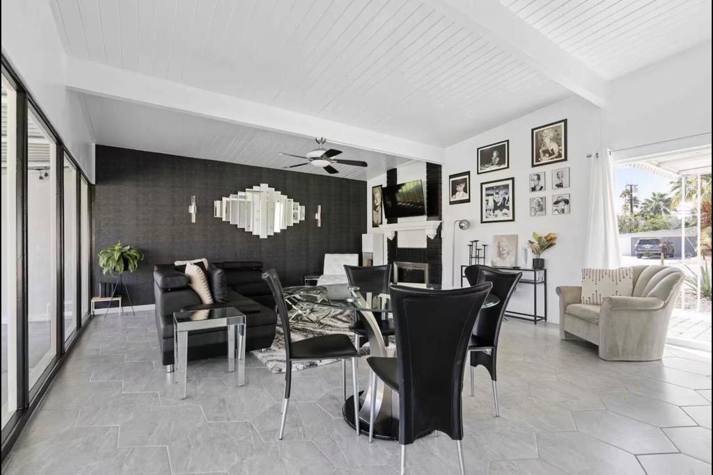 Now available for seasonal or long-term lease (currently all dates are available) , this move-in-ready 3-bedroom, 2-bathroom Marilyn-themed Palm Springs home comfortably accommodates up to six guests and offers a fun, family- and pet-friendly stay without the worry of a pool. The open living area features a fully stocked kitchen and a bright living room overlooking the spacious backyard. The primary suite includes a king bed and private bath, while two additional bedrooms offer queen beds and share a guest bath. Enjoy the large private backyard with lawn games and a ping pong table, plus garage access for convenience. Centrally located near shopping, dining, and downtown Palm Springs. Pets are welcome