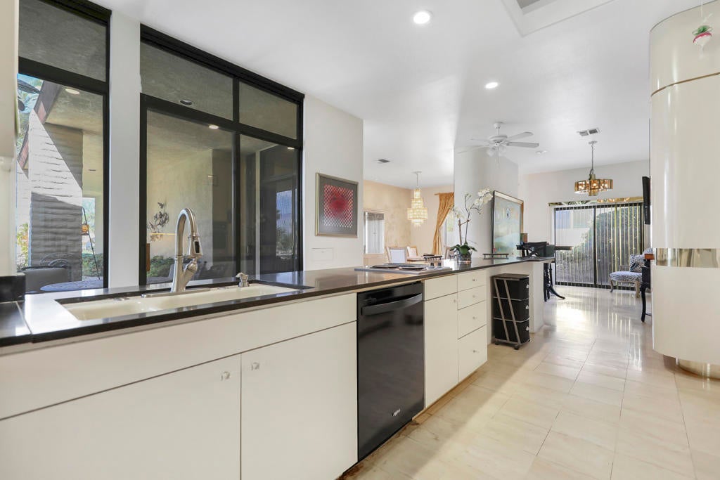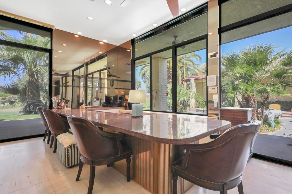 REDUCED!! One of a kind residence located on a 13,503 sq.ft. lot with Southern views over the 3rd fairway of the 3rd Nine (Lake Nine). Enter through impressive metal doors to an inner Atrium that leads to stunning massive glass doors with panoramic views of the floor to ceiling windows highlighting the tropical foliage and sparkling pool/spa leading to the golf course. Wonderful use of Marble and Granite and Travertine throughout adds to the superb quality of this special home. The primary suite, with fireplace and tons of built-ins, is on one side of the home boasting a separate soaking tub and spacious shower. The other two bedrooms (one is being used as an office) have their own bathrooms.. There is also a Texas sized billiard room with granite bar that can seat at least six people. The bar is equipped with a refrigerator and a stand alone ice maker - great for entertaining and taking in the views!! The home is U-Shaped and built around the sparkling pool & spa - There is also a 1/2 bath and shower outside adjacent to the built-in BBQ. Two-car garage PLUS golf cart garage on one side of the home plus another one-car garage on the opposite side. Low HOA of only $214 a month includes cable TV & internet with Spectrum plus 24-hour guard gated Security. IID for lower electric.