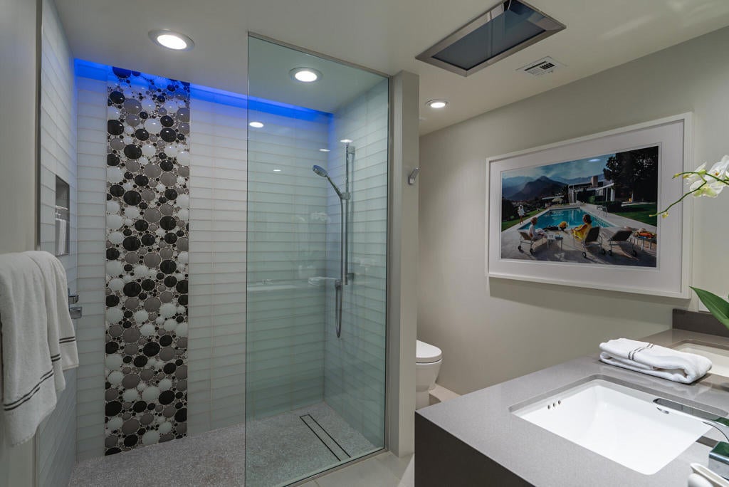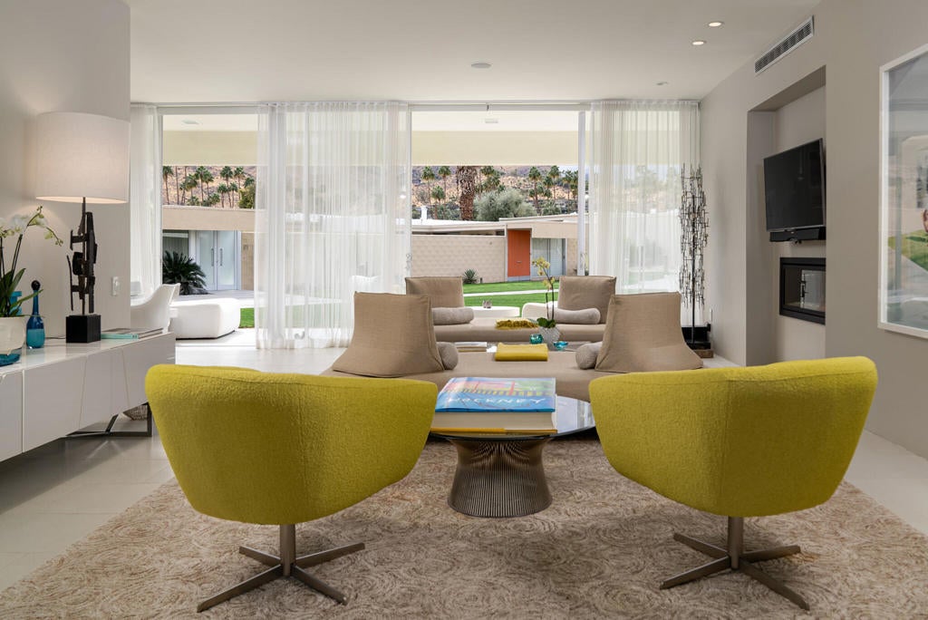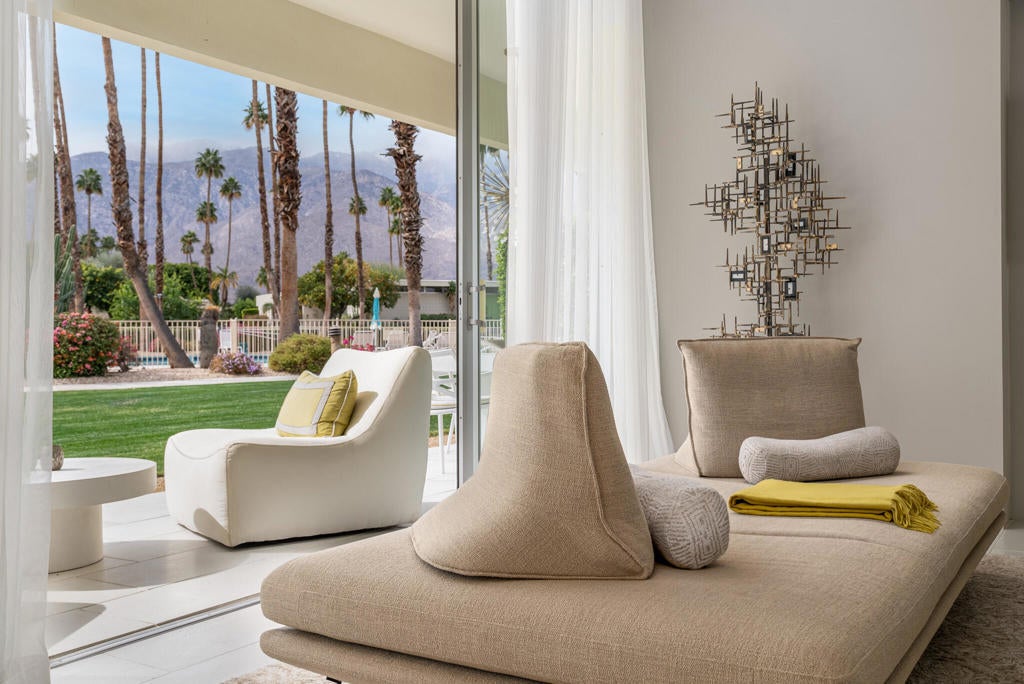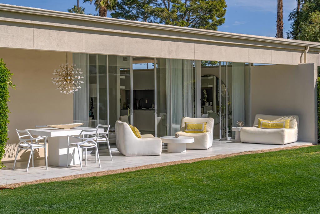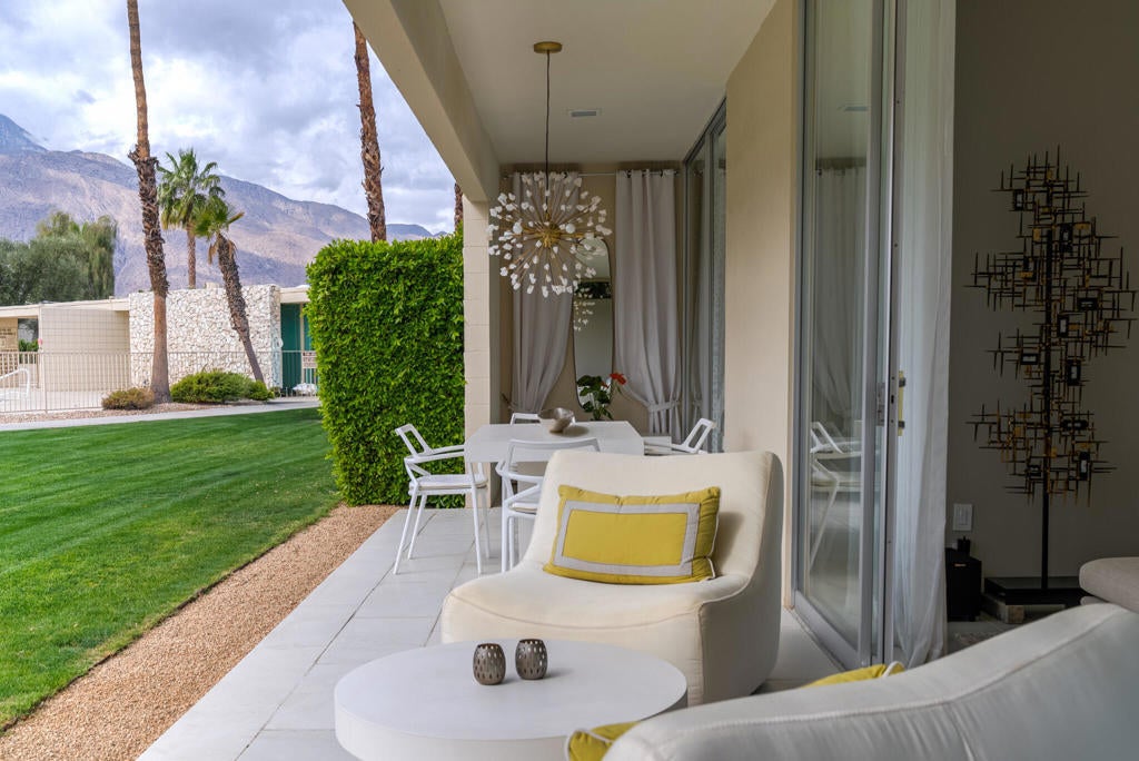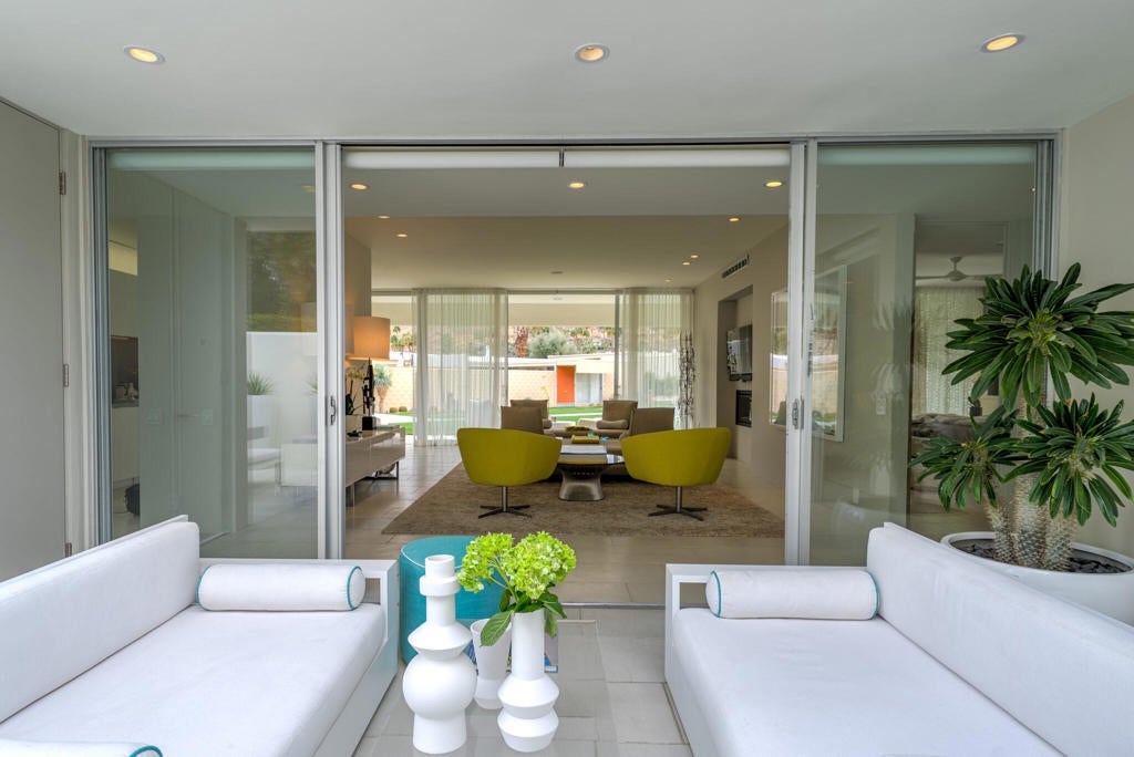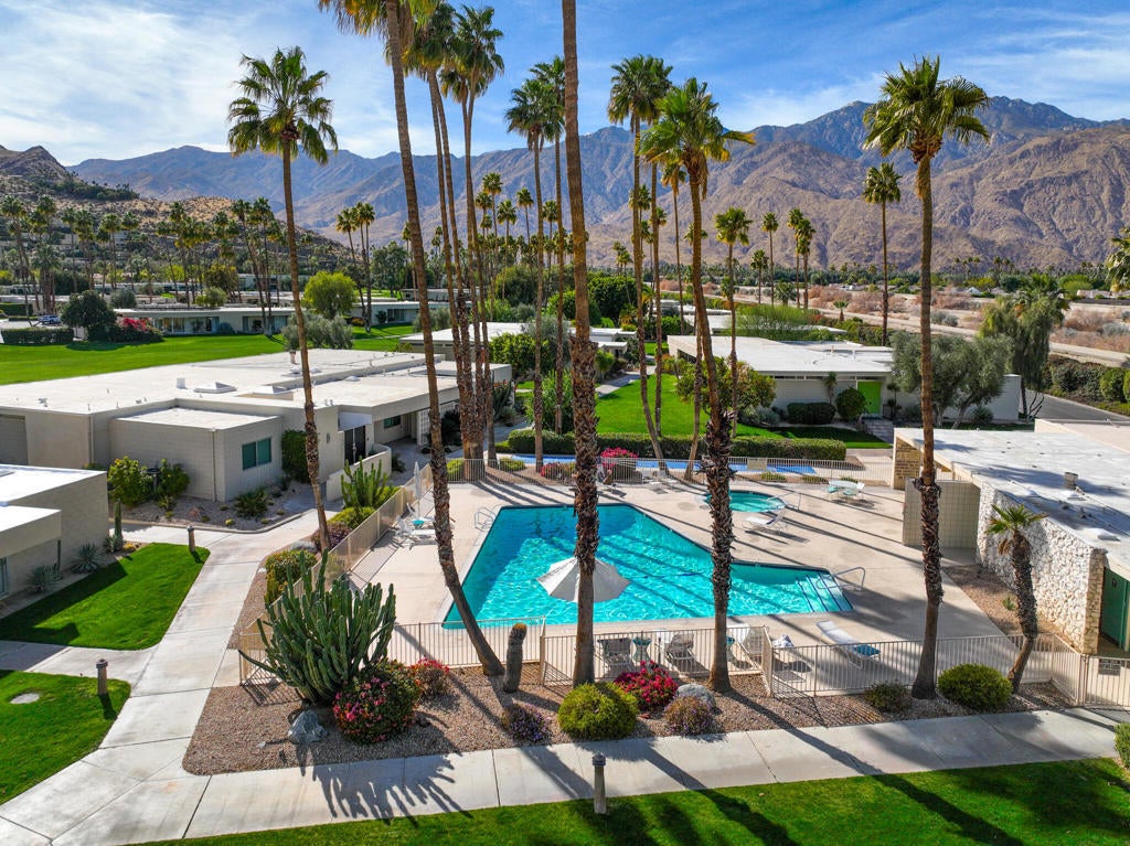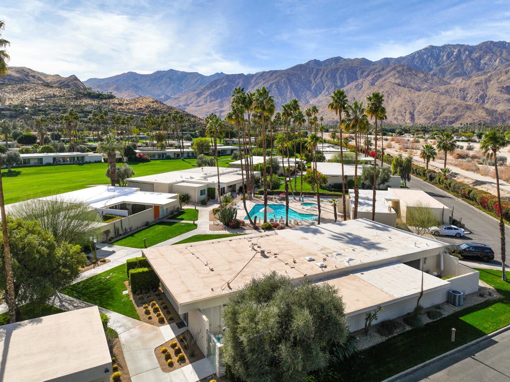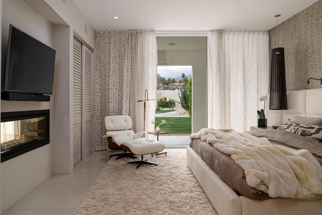 Stunning and sophisticated mid-century modern home in South Palm Springs. Timeless design with modern comforts, featuring sleek quartz countertops, stainless-steel appliances, and polished concrete floors throughout. Walls of glass and 10-ft ceilings capture breathtaking mountain views. Enjoy a cozy double-sided fireplace, remote shades, and updated spa-like baths. Located in the iconic Seven Lakes Country Club with golf, 15 pools, spas, and a clubhouse with restaurant and bar.