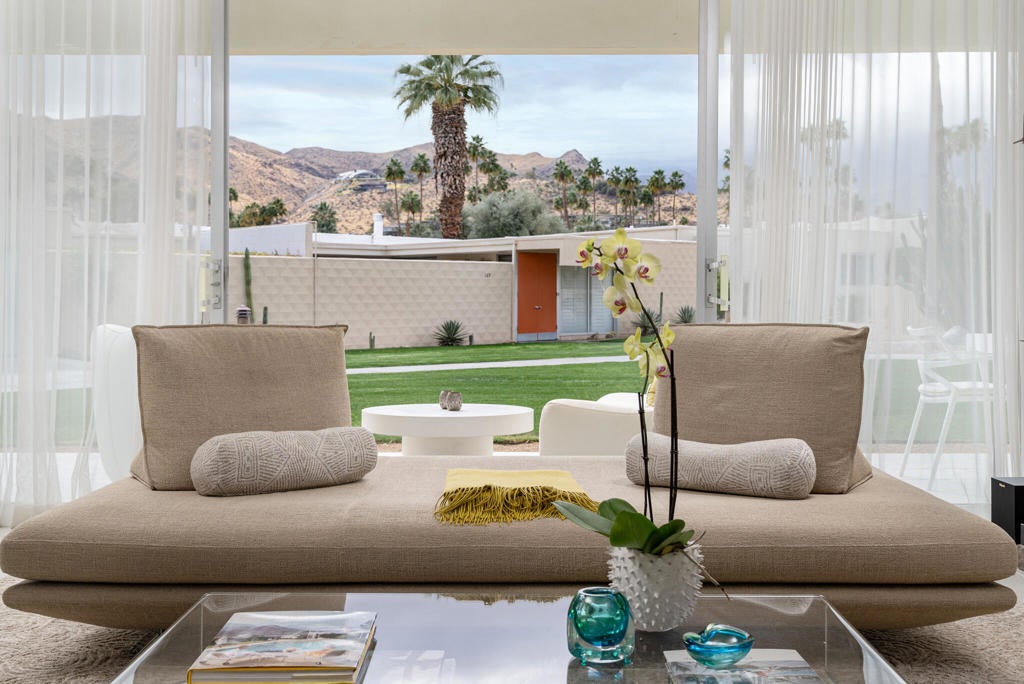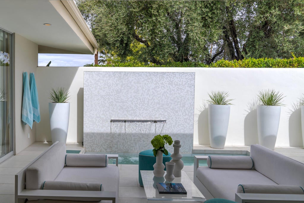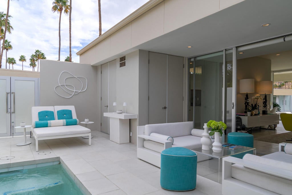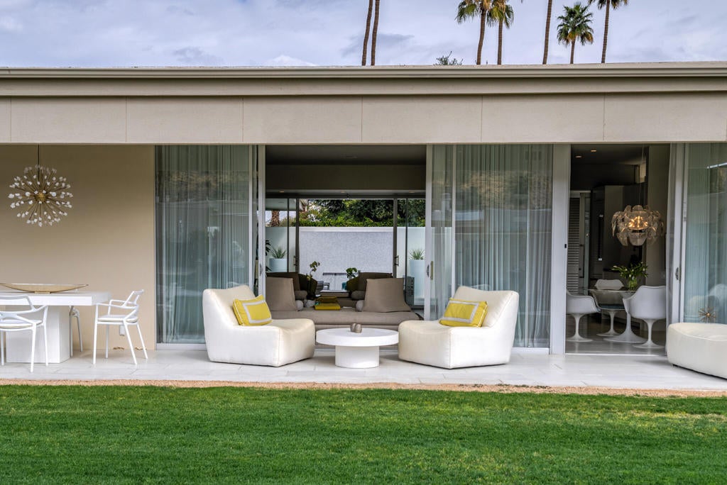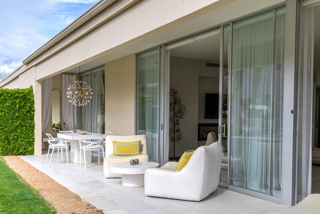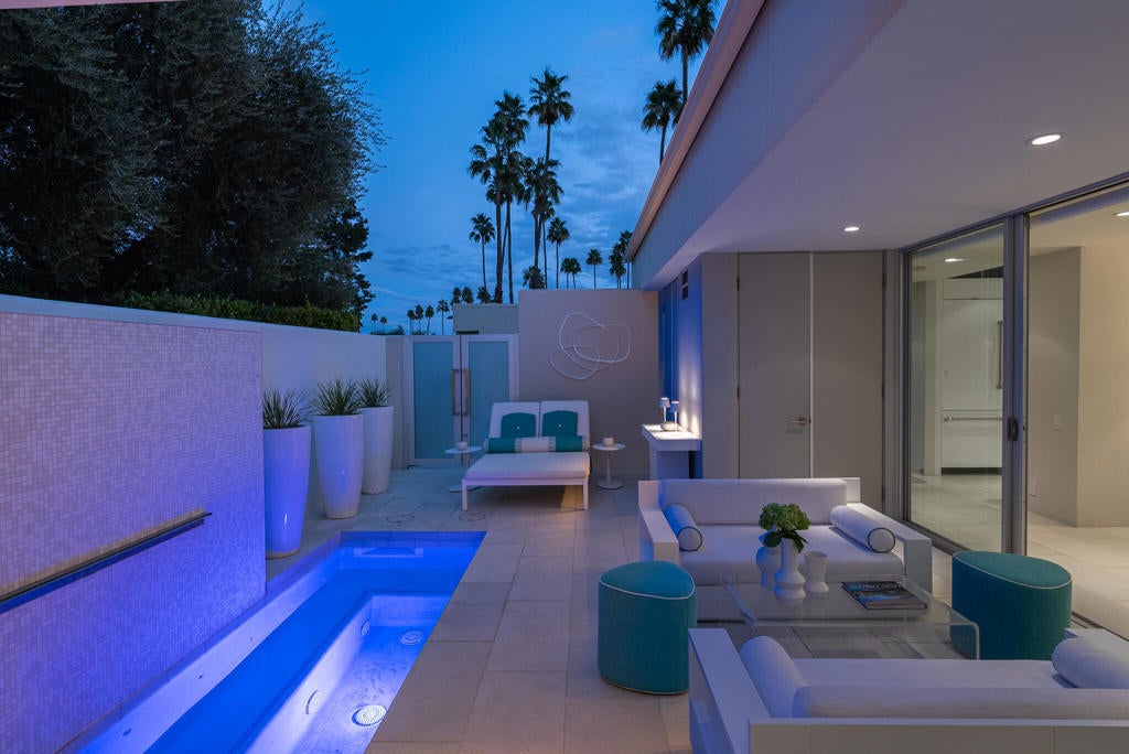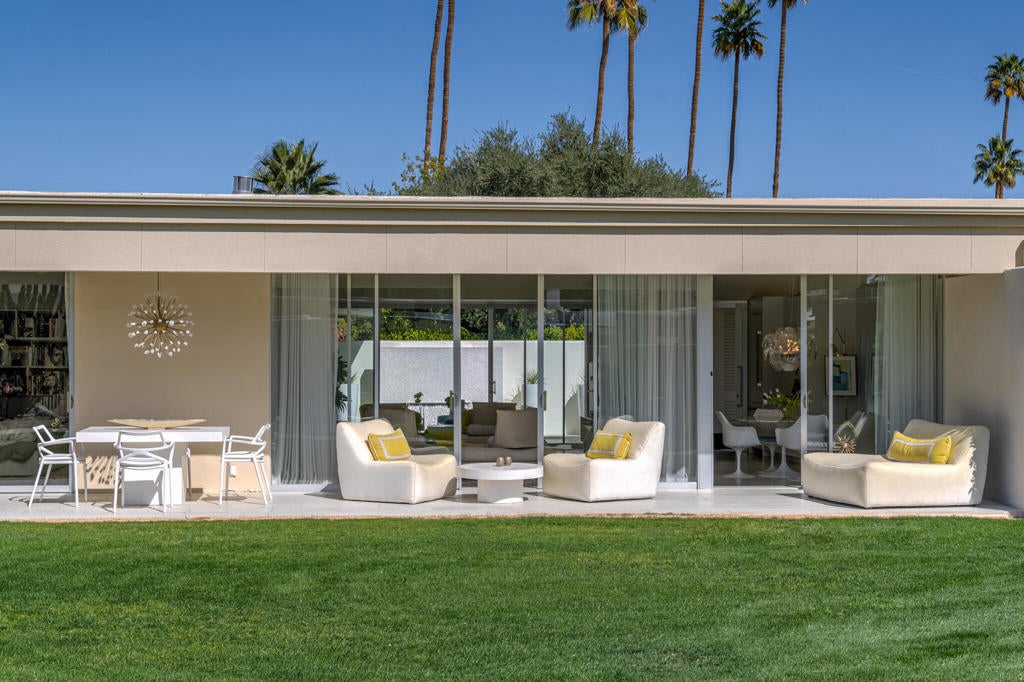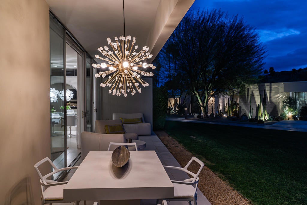 Stunning and sophisticated mid-century modern home in South Palm Springs. Timeless design with modern comforts, featuring sleek quartz countertops, stainless-steel appliances, and polished concrete floors throughout. Walls of glass and 10-ft ceilings capture breathtaking mountain views. Enjoy a cozy double-sided fireplace, remote shades, and updated spa-like baths. Located in the iconic Seven Lakes Country Club with golf, 15 pools, spas, and a clubhouse with restaurant and bar.