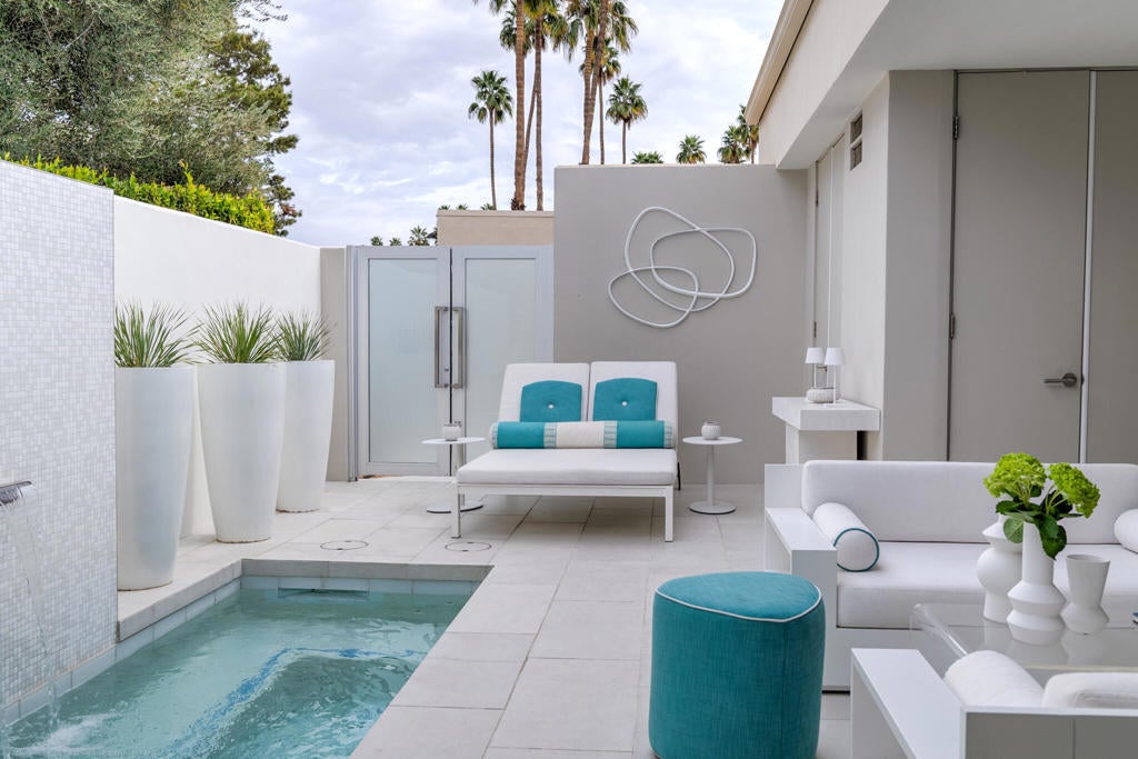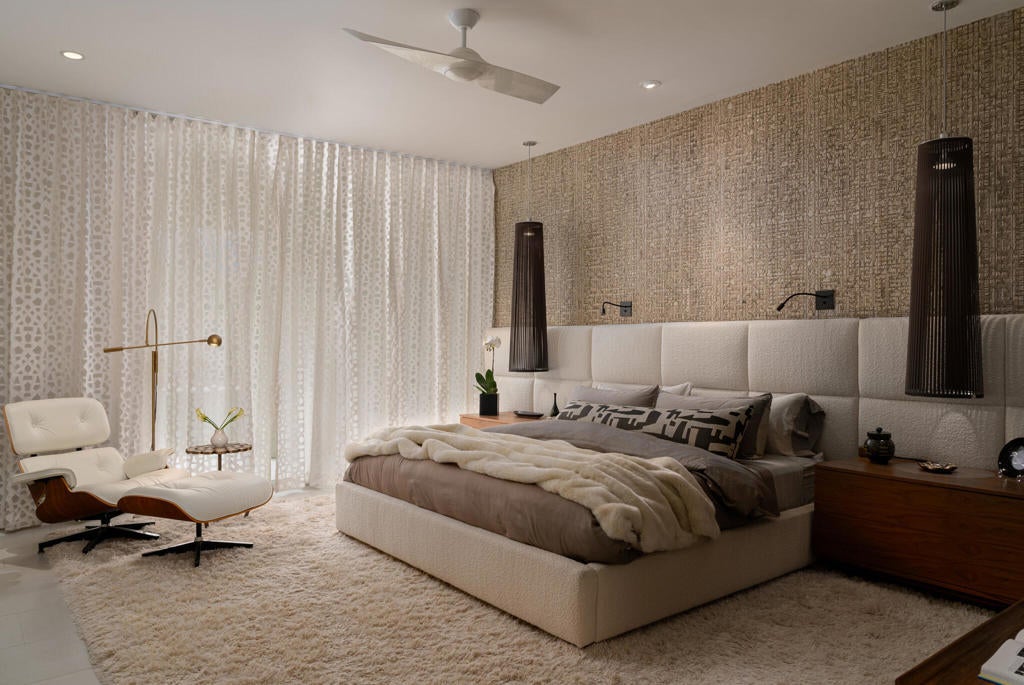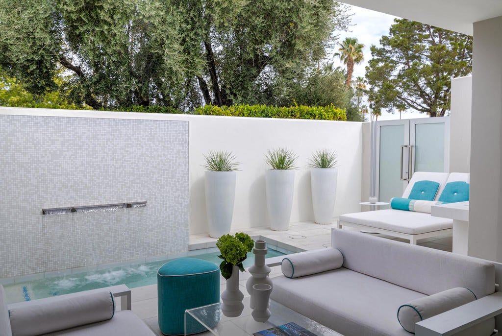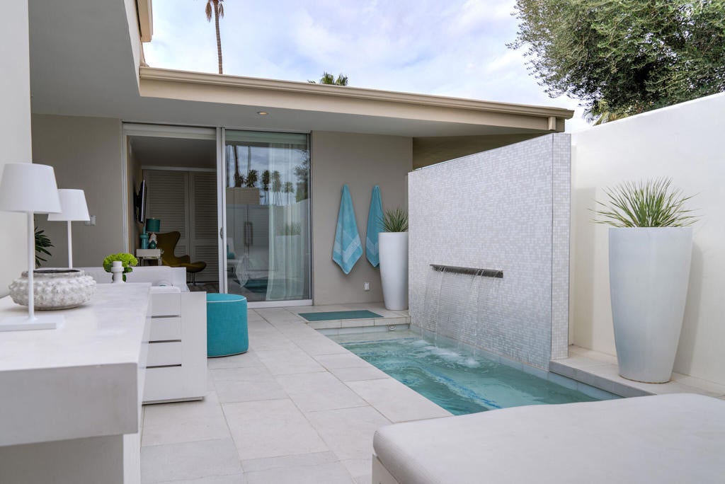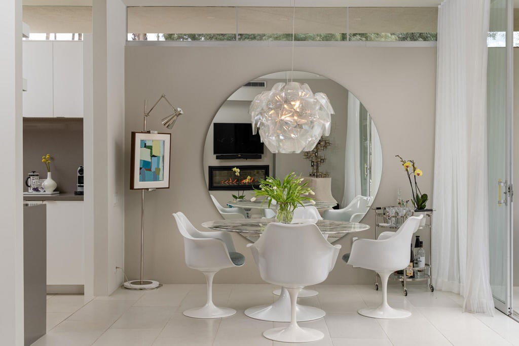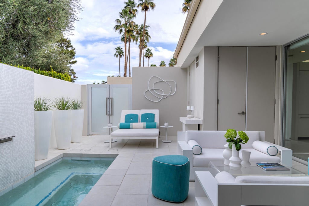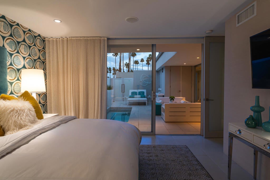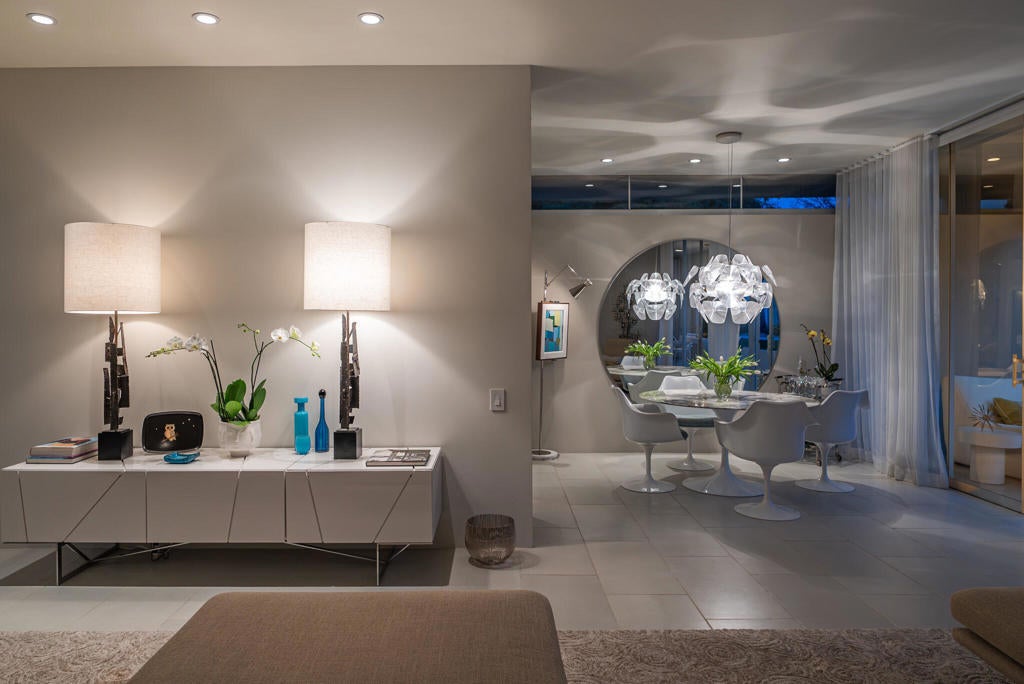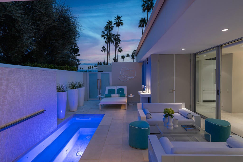 Stunning and sophisticated mid-century modern home in South Palm Springs. Timeless design with modern comforts, featuring sleek quartz countertops, stainless-steel appliances, and polished concrete floors throughout. Walls of glass and 10-ft ceilings capture breathtaking mountain views. Enjoy a cozy double-sided fireplace, remote shades, and updated spa-like baths. Located in the iconic Seven Lakes Country Club with golf, 15 pools, spas, and a clubhouse with restaurant and bar.