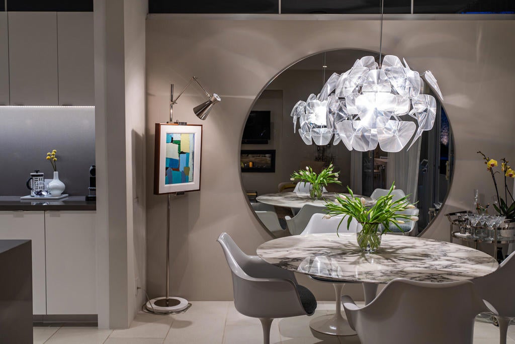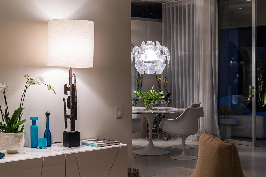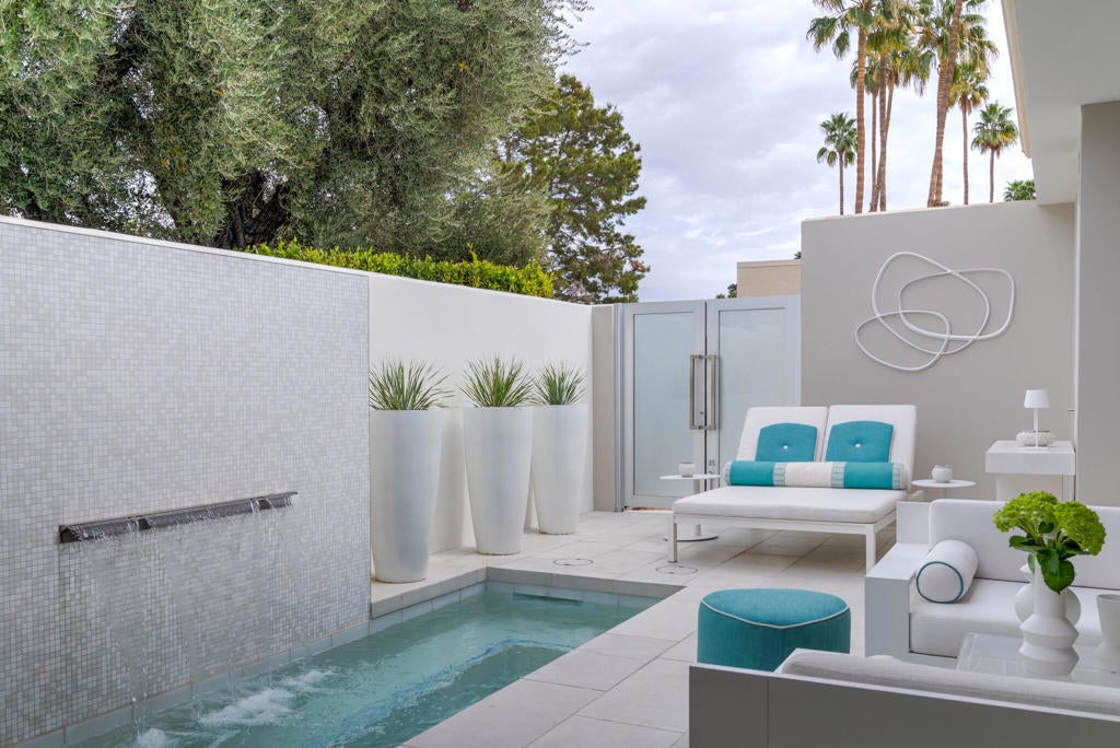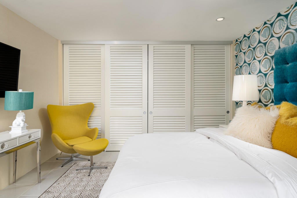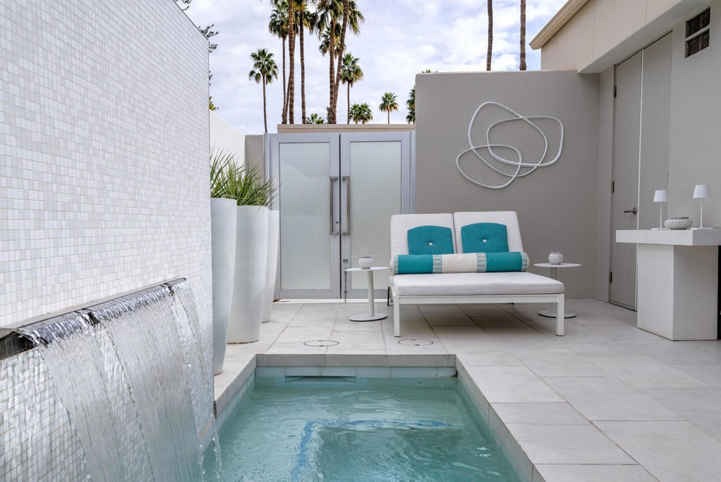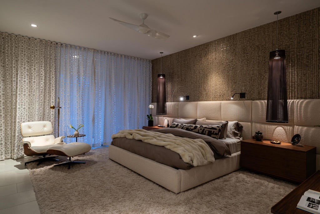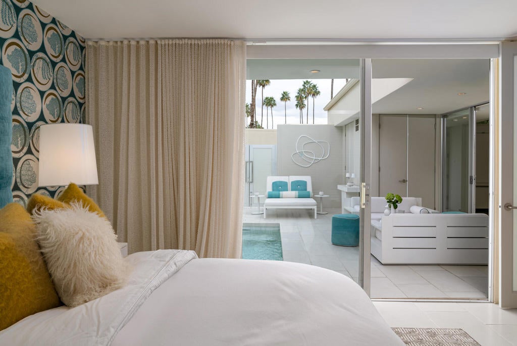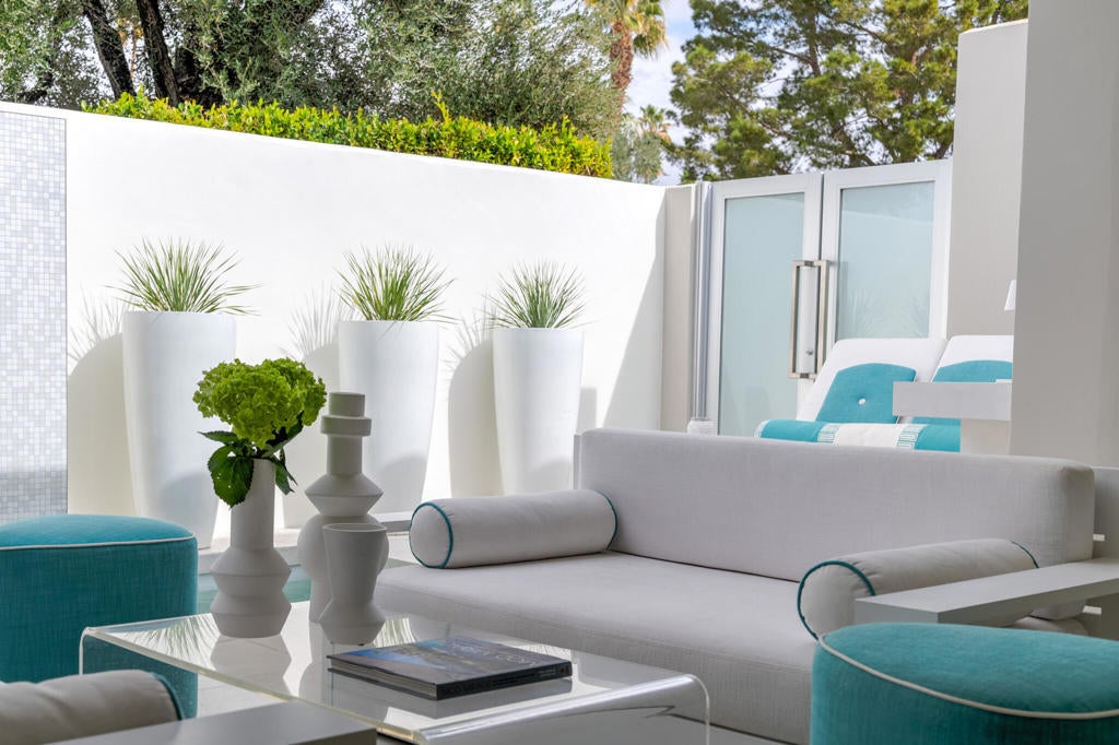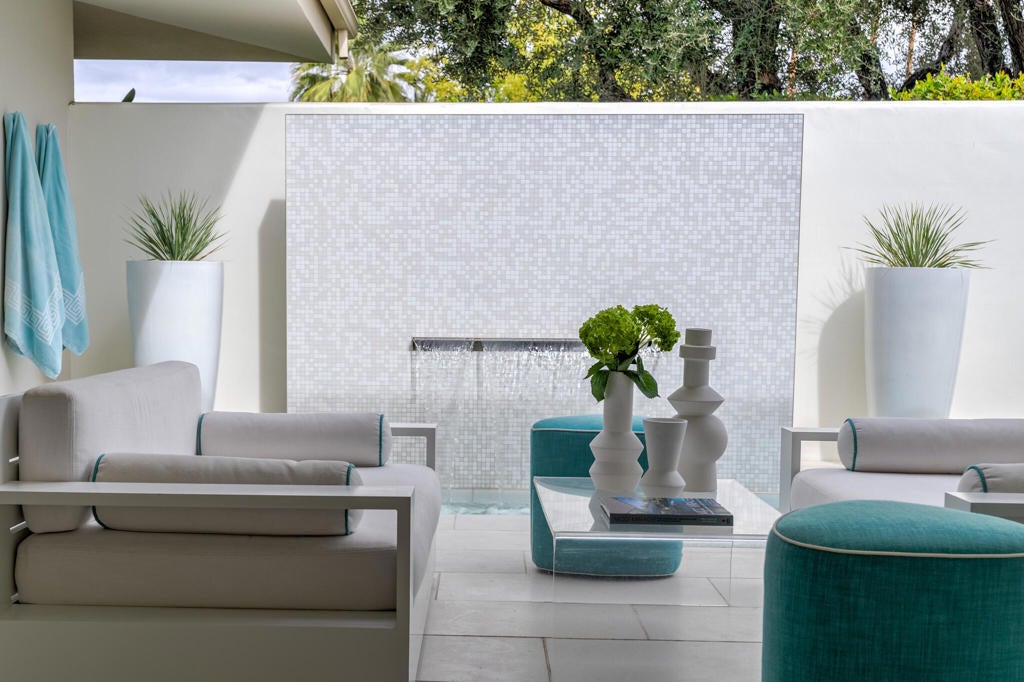 Stunning and sophisticated mid-century modern home in South Palm Springs. Timeless design with modern comforts, featuring sleek quartz countertops, stainless-steel appliances, and polished concrete floors throughout. Walls of glass and 10-ft ceilings capture breathtaking mountain views. Enjoy a cozy double-sided fireplace, remote shades, and updated spa-like baths. Located in the iconic Seven Lakes Country Club with golf, 15 pools, spas, and a clubhouse with restaurant and bar.