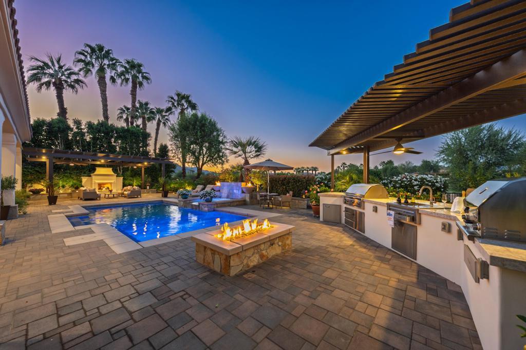 An entertainer's paradise, this exquisite residence showcases a recently completed indoor/outdoor transformation. Located on the 2nd fairway of the Greg Norman Course at PGA West, this popular four-bedroom Ventana plan is renowned for its open-concept design, which seamlessly connects indoor and outdoor living spaces. The resort-style backyard features a louvered pergola-covered kitchen island with a Lynx BBQ, Lynx pizza oven, cocktail/wine station, a warmer drawer, and plenty of storage. Enjoy evenings by the large freestanding fireplace under the louvered pergola, or sit by the separate fire pit. Unwind in the pool and spa framed by cascading waterfalls and dramatic fire pots. Lush, professionally designed landscaping surrounds the property, with a wrought-iron fenced yard offering both privacy and a view of the beautiful Santa Rosa Mountains. Inside, a just-completed kitchen remodel shines with an oversized quartzite island, newly added cabinets, matching quartzite counters, and backsplash. Special features include subzero refrigerator, a Miele dishwasher, a Viking Professional cooktop and oven, a warming drawer, a new sink and faucet, and a built-in wine cabinet. The laundry room has just been remodeled to create more space and convenience, including new quartzite counters, newly added cabinetry, a new washer and dryer, a new sink, and a faucet. The primary suite offers spa-like luxury, and a detached casita provides guest privacy. Newly furnished main living areas, kitchen, bar, and family room with exquisite Restoration Hardware furnishings and Restoration Hardware chandeliers and wall sconces. From the beautifully appointed interiors to the resort-inspired backyard, this residence offers a lifestyle to be celebrated, not just lived.