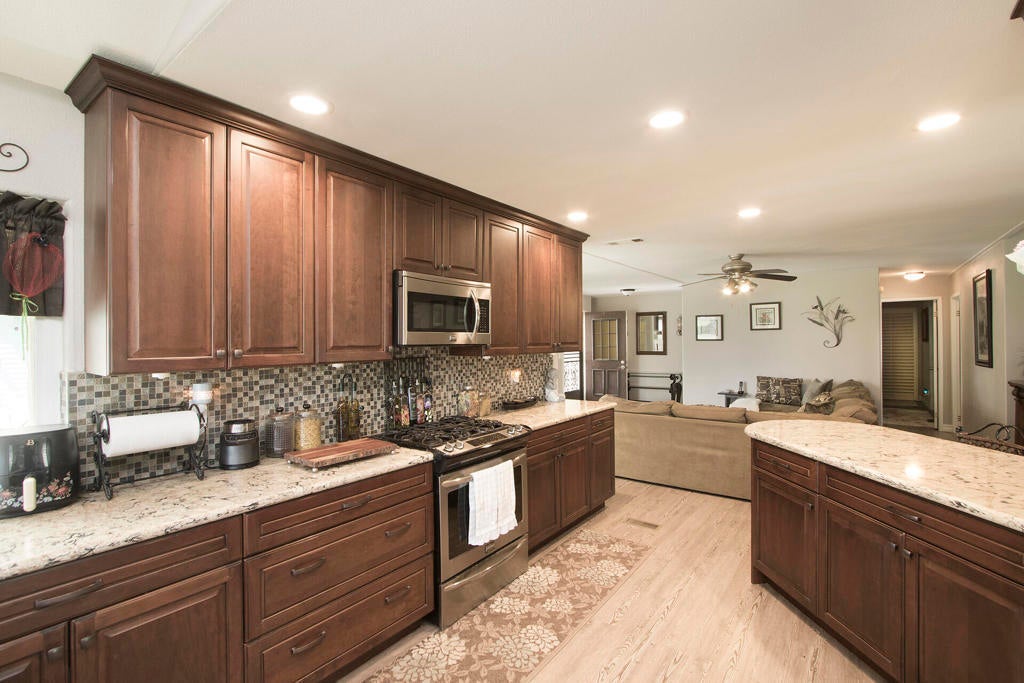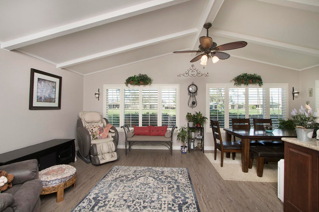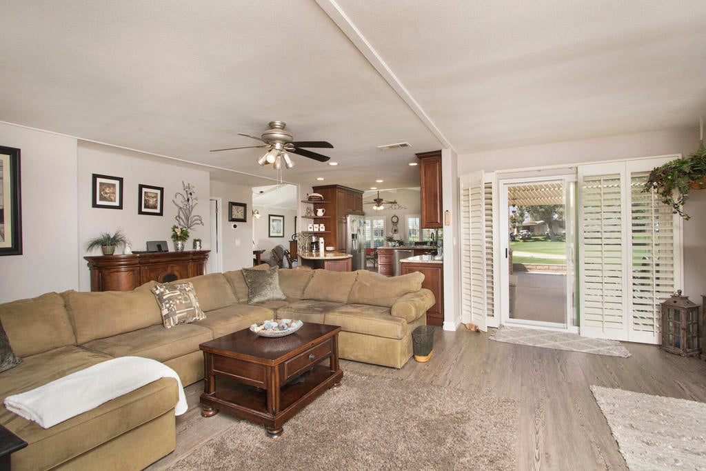Back on the market; sale fell through. Beautiful remodeled and well-maintained home with stucco exterior offers an expansive views of golf course and mountains from oversized patio. 3 car garage with separate golf cart door facing a driveway that easily holds 2 vehicles. Enter the front door to the living room with a wide open view of the kitchen and adjoining family room on the other side of the kitchen. Two separate dining areas in the family room plus seating at the quartz countertop in the kitchen. Stainless steel appliances are a feature in this sizable kitchen designed for easy meal prep. Laundry room is loaded with storage and leads to the hallway for the guest bedroom and bathroom with the master bedroom/bath situated at the end against the garage wall easily buffering outside noise. Owner upgrades include all vinyl flooring, custom kitchen cabinetry with soft-close doors and new double pane windows and shutters throughout. Ivey Ranch has a par 3 golf course, tennis/pickleball courts, clubhouse, exercise equipment room, and 4 pools w/2 spas.Gated with guard on duty till 3 pm daily.