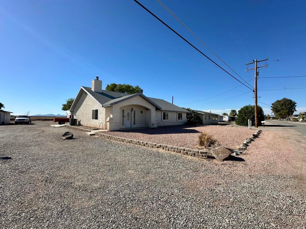 Welcome to river living! This spacious 3 bedroom, 2 bath home offers over 1,800 sq. ft. of comfortable living with an open concept layout perfect for entertaining. The kitchen features beautiful granite counters, plenty of cabinet space, and a large island overlooking the living area. Enjoy tile flooring, neutral tones, and a cozy wood burning stove that adds warmth and charm.Step outside to a generous covered patio and expansive parking area room for over 17 vehicles, boats, or RVs! The temperature controlled garage is ideal for hobbies or storage, and the property includes solar and a tankless water heater for energy efficiency. Also included is a 40x8 Conex perfect for tools, toys or additional storage. Located in a quiet river access community with a low HOA of only $200/year, residents enjoy private boat ramp access to the Colorado River. This home has it all space, comfort, and access to the water!