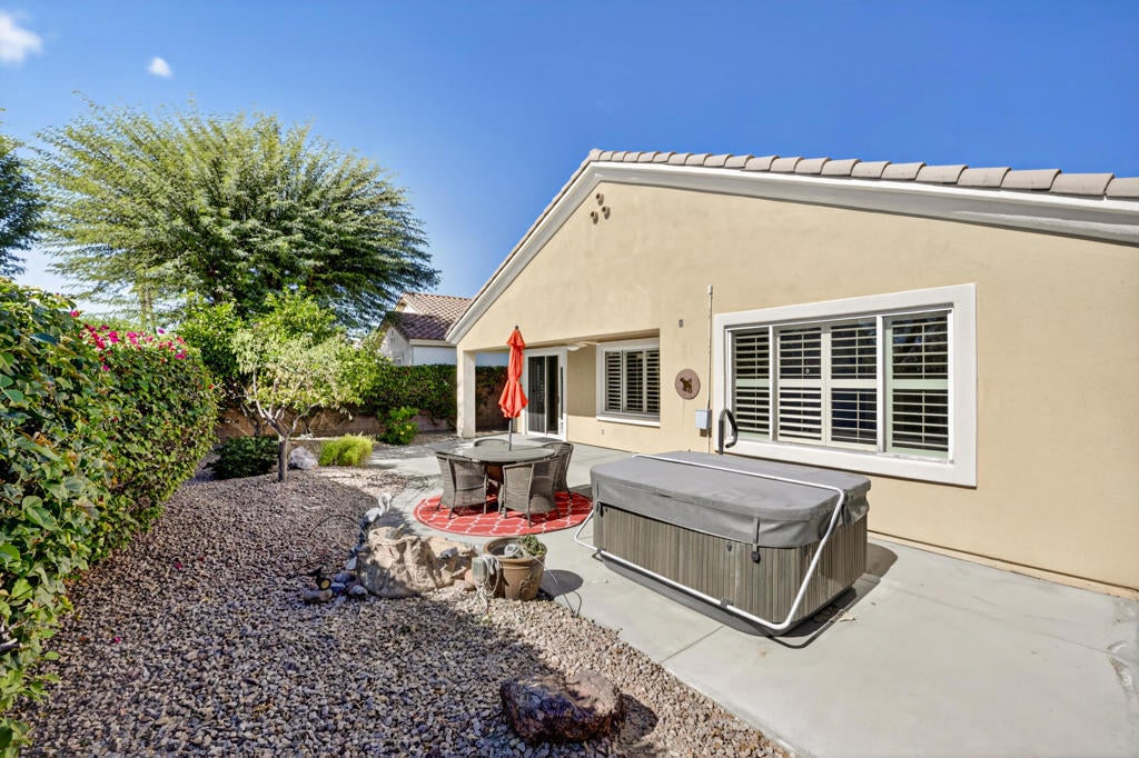 Welcome to this beautifully maintained Cayman floor plan offering 1,616 square feet of comfortable and stylish desert living. From the moment you enter, the home exudes warmth and character with tile flooring throughout and plantation-style shutters that bring a touch of elegance. The open-concept kitchen showcases granite slab countertops, upgraded lighting fixtures, ample cabinet space, and two skylights that fill the area with soft natural light. The adjoining great room is inviting and spacious, featuring a cozy fireplace, built-in shelving, and media storage that create an ideal setting for entertaining or relaxing at home. The primary suite provides a peaceful retreat with direct access to the backyard, a generous walk-in closet, and an ensuite bathroom with dual vanities and a walk-in shower. The guest bedroom offers comfort and convenience with easy access to a full bath, making it perfect for visiting family and friends. Step outside to enjoy a private backyard oasis featuring a covered patio, an above-ground spa, and beautifully designed desert landscaping for easy maintenance and year-round enjoyment. Whether hosting a gathering or simply unwinding after a long day, this outdoor space provides the perfect atmosphere to relax and take in the serene surroundings. Located in the highly desirable active 55 + community of Sun City Palm Desert, residents enjoy resort-style amenities including two golf courses, state-of-the-art fitness centers, clubhouses, swimming pools and spas, tennis and pickleball courts, bocce ball, and a wide variety of clubs and social activities. This home offers the perfect combination of comfort, style, and active living within a beautifully maintained gated community.