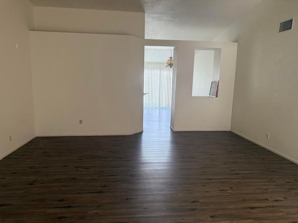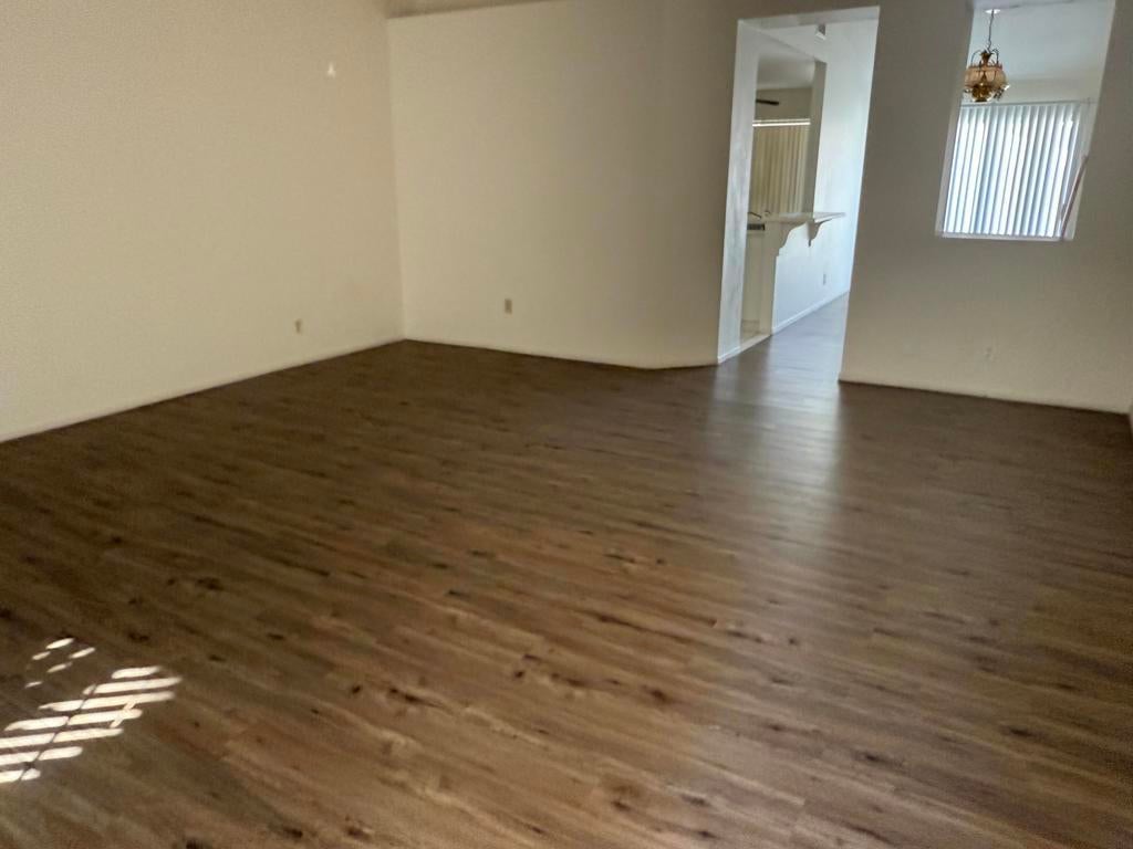 Welcome to this charming home featuring a brightly painted white interior and dark brown wood like vinyl flooring throughout. The living room offers a cozy fireplace, creating a warm and welcoming space to relax. The dining area is accented by a vintage style chandelier and opens to a kitchen full of character, complete with a bar countertop, white tile surfaces, colored tile backsplash, and white cabinetry for a bright, timeless look.Each bedroom is generously sized and continues the clean, modern design with matching vinyl flooring and crisp white walls. The bathrooms maintain the home's cohesive style with tile flooring, white tile countertops, white cabinets, and tiled showers, one of which includes a bathtub. A separate laundry area adds convenience, and the attached 2 car garage provides ample parking and storage. Enjoy the ease of low maintenance desert landscaping in the front yard, designed for both beauty and efficiency. Feel free to schedule your viewing now!