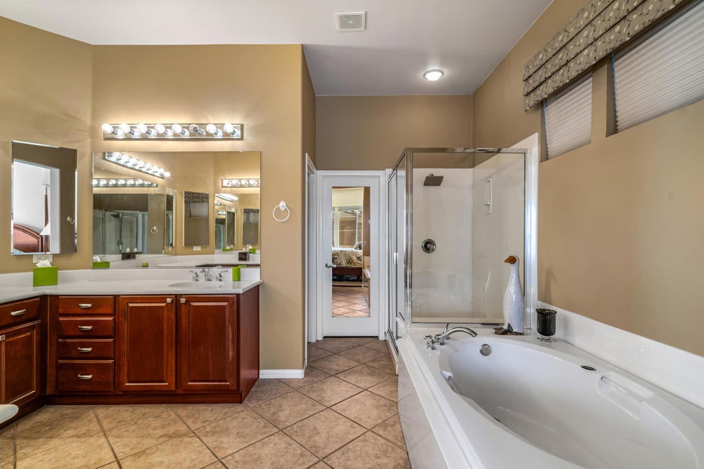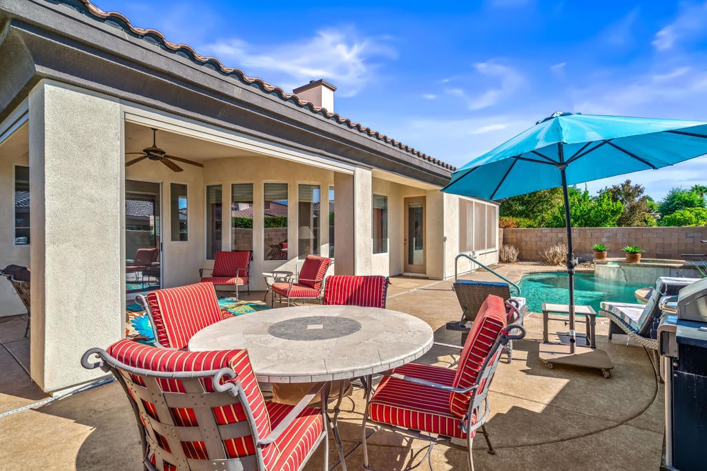 Peaceful & private SOUTH facing 3 bedroom, 2 1/2 bath home with your own private pool & spa in Heritage Palms. This cul-de-sac home with extended driveway parking for your guests and golf cart area in the garage is also nicely located in the center of the community. Featuring an open design layout with courtyard entry, beautiful leaded glass entry door, family room fireplace, granite kitchen counters, NEW BOSCH appliances and a large guest bedroom with private bathroom for your guests. The 3rd bedroom has double doors and could also be utilized as a den/office. The convenient 3rd bath/powder room is also a nice feature of this 2504 sq.ft. plan. The large primary suite has dual split vanities, separate soaking tub & shower and walk-in closet. It also has a French door out to your SOUTH facing and private pool with spa, covered patio with electronic SUN SHADES and mountain views. Additional upgrades include, front and rear patio overlay finishes, both A/C units have been replaced, wood flooring in all bedrooms and custom window coverings. Heritage Palms is a premier adult community featuring an 18 hole championship golf course, pickleball & tennis courts, indoor & outdoor pools, fitness center, grill room, grill room, card rooms, social clubs and more.