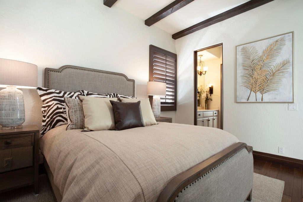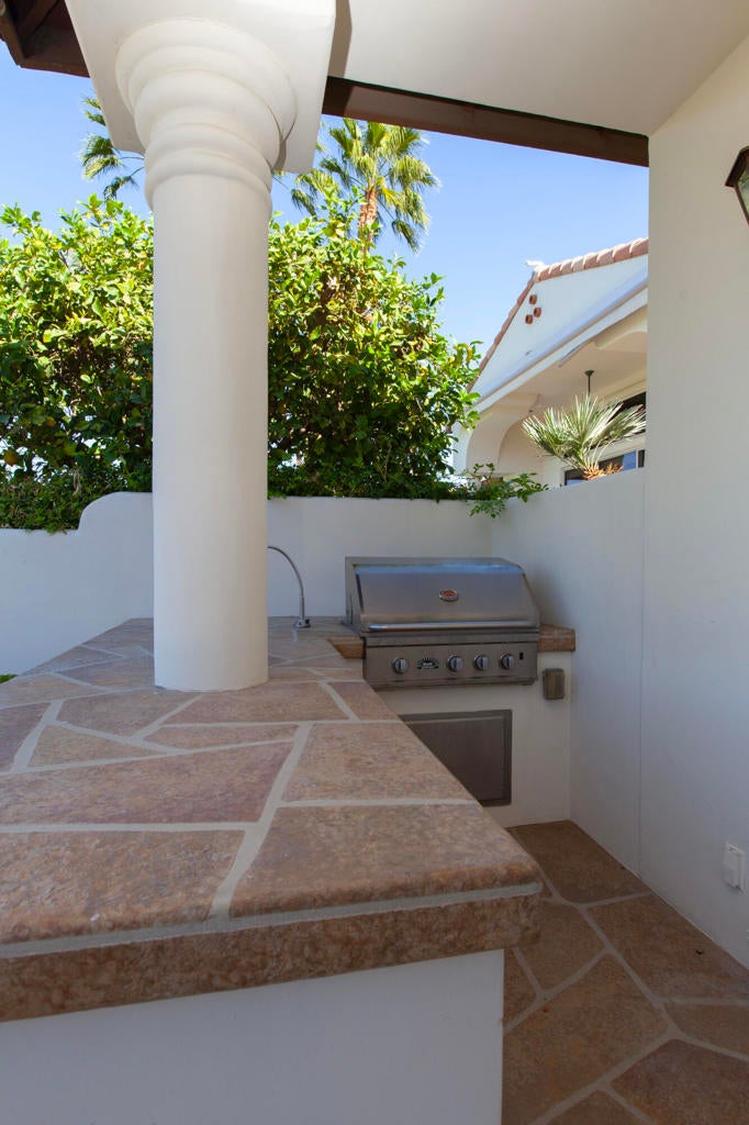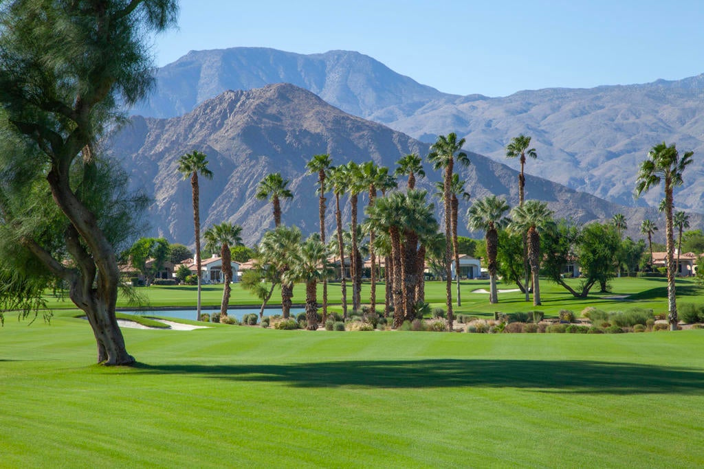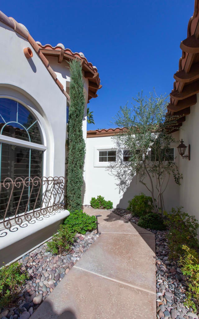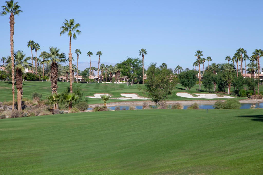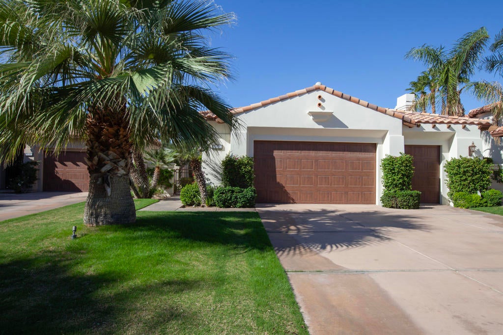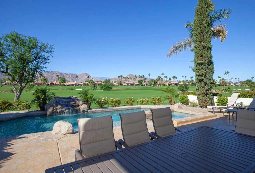 Experience refined desert living in this beautifully upgraded residence located within the prestigious Rancho La Quinta Country Club. Offering magnificent south and west views of the Santa Rosa Mountains and foothills, as well as multiple fairway vistas of the Jerry Pate Championship Golf Course, this home captures the essence of resort-style sophistication. From brilliant sunsets to tranquil mornings overlooking lush greens, every detail of this home has been enhanced for beauty and comfort. The exterior exudes elegance with beautiful exterior paint, new upgraded wood-look garage doors, and a custom wood-and-glass entry door. Three en-suite bedrooms plus a bonus room that is perfect as an additional sleeping space. A large multi-car driveway welcomes guests, while freshly painted trellises and a tiled and sealed primary patio provide perfect spaces to relax outdoors. Exquisite patio and bedroom furnishings elevate the home's inviting desert lifestyle. Inside, the home has been thoughtfully transformed with artistic craftsmanship. Custom finishes on all brick, stone, hearth, mantle, and cabinetry create a warm, cohesive aesthetic. Venetian plaster in the powder room and detailed door and frame finishes showcase fine attention to design. The interior has been painted and complemented by new window treatments and solar film in the kitchen nook and great room to maximize comfort and privacy. The remodeled kitchen features new quartz countertops, a convenient trash pull-out, and custom-finished cabinetry that reflects timeless elegance. Tile floors have been professionally cleaned, sealed, and polished, while new carpeting in the guest bedroom and bonus room adds softness underfoot. Beam ceilings, base moldings, and custom lighting enhance the great room's architectural appeal, along with a built-in entertainment center and electronically controlled window shades. Offered furnished per Inventory List, the home includes premium furnishings throughout: beautiful bedding and drapery in the primary suite guest bedroom suites with king and queen furnishings, area rugs, accessories, and a custom framed mirror in the primary bath. Every room radiates modern desert elegance with a warm, inviting feel. With its meticulous craftsmanship, high-end finishes, and spectacular mountain and fairway views, this Rancho La Quinta C.C. retreat represents the finest in desert country club living. Please see the two-page improvements list.