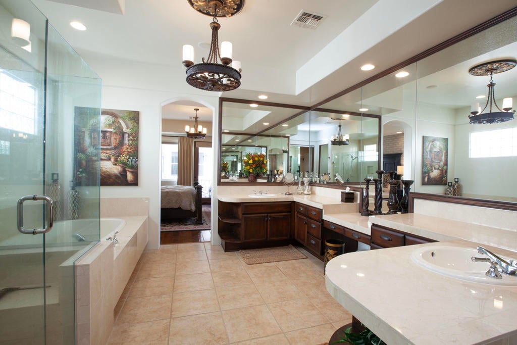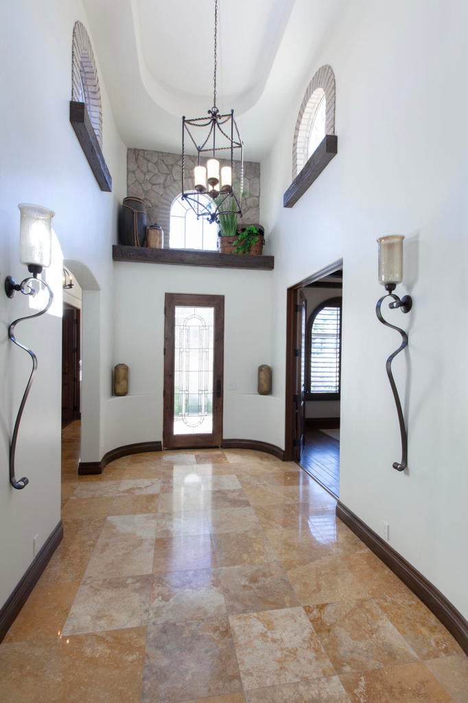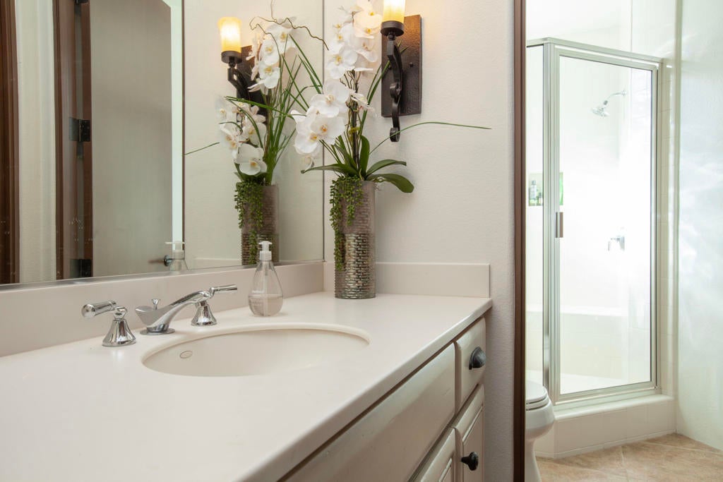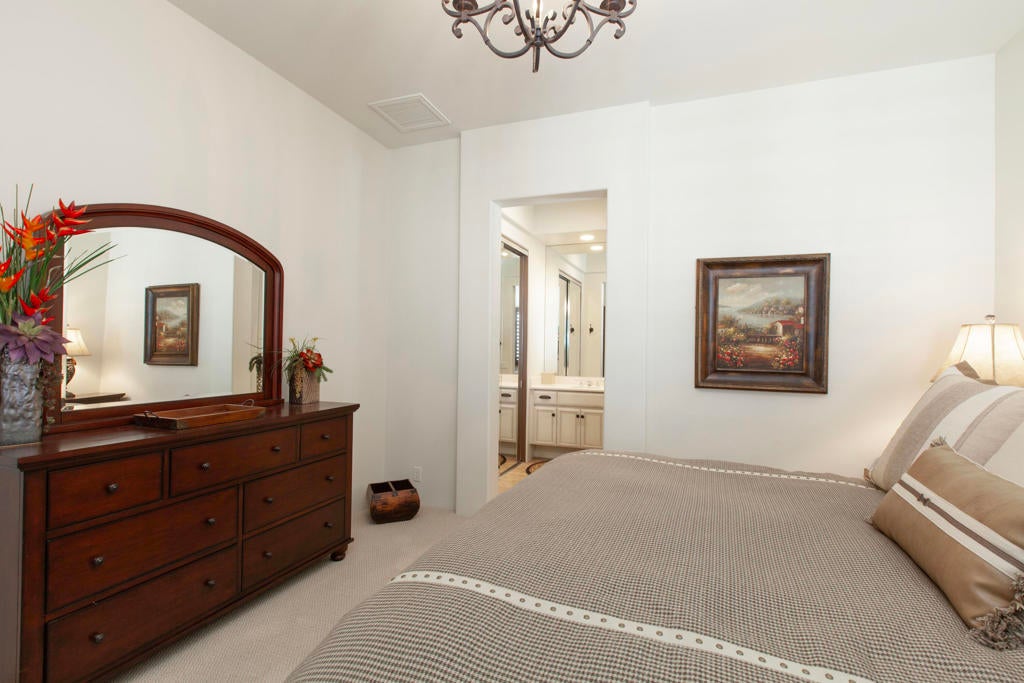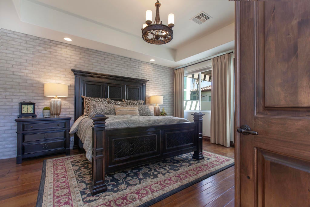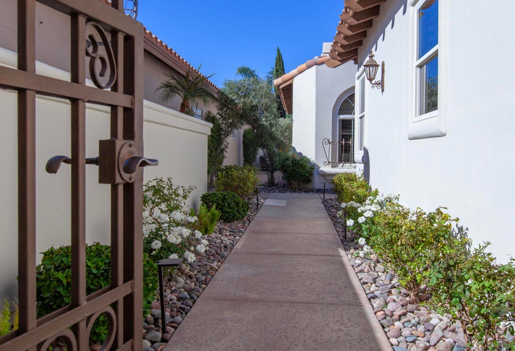 Experience refined desert living in this beautifully upgraded residence located within the prestigious Rancho La Quinta Country Club. Offering magnificent south and west views of the Santa Rosa Mountains and foothills, as well as multiple fairway vistas of the Jerry Pate Championship Golf Course, this home captures the essence of resort-style sophistication. From brilliant sunsets to tranquil mornings overlooking lush greens, every detail of this home has been enhanced for beauty and comfort. The exterior exudes elegance with beautiful exterior paint, new upgraded wood-look garage doors, and a custom wood-and-glass entry door. Three en-suite bedrooms plus a bonus room that is perfect as an additional sleeping space. A large multi-car driveway welcomes guests, while freshly painted trellises and a tiled and sealed primary patio provide perfect spaces to relax outdoors. Exquisite patio and bedroom furnishings elevate the home's inviting desert lifestyle. Inside, the home has been thoughtfully transformed with artistic craftsmanship. Custom finishes on all brick, stone, hearth, mantle, and cabinetry create a warm, cohesive aesthetic. Venetian plaster in the powder room and detailed door and frame finishes showcase fine attention to design. The interior has been painted and complemented by new window treatments and solar film in the kitchen nook and great room to maximize comfort and privacy. The remodeled kitchen features new quartz countertops, a convenient trash pull-out, and custom-finished cabinetry that reflects timeless elegance. Tile floors have been professionally cleaned, sealed, and polished, while new carpeting in the guest bedroom and bonus room adds softness underfoot. Beam ceilings, base moldings, and custom lighting enhance the great room's architectural appeal, along with a built-in entertainment center and electronically controlled window shades. Offered furnished per Inventory List, the home includes premium furnishings throughout: beautiful bedding and drapery in the primary suite guest bedroom suites with king and queen furnishings, area rugs, accessories, and a custom framed mirror in the primary bath. Every room radiates modern desert elegance with a warm, inviting feel. With its meticulous craftsmanship, high-end finishes, and spectacular mountain and fairway views, this Rancho La Quinta C.C. retreat represents the finest in desert country club living. Please see the two-page improvements list.