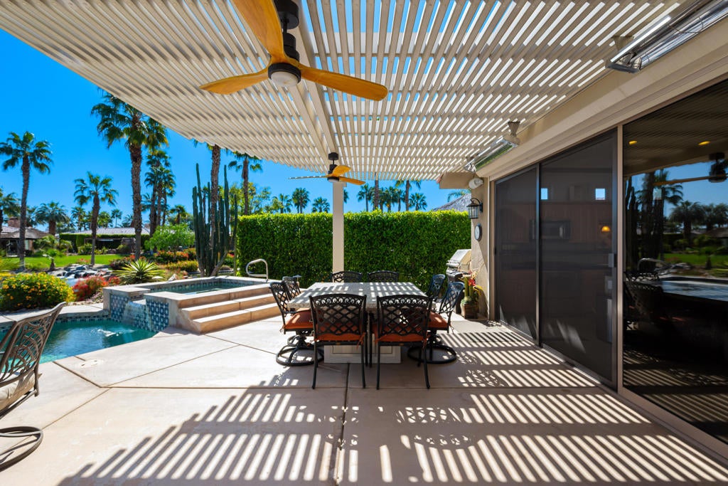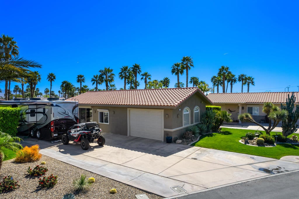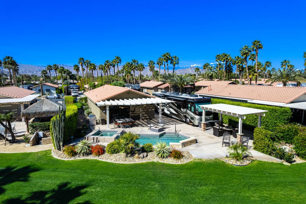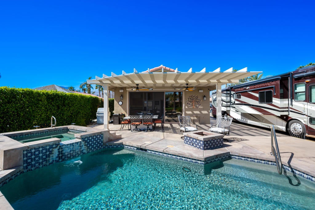 #65 DESERT SHORES RESORTVery nice eastern backyard Desert Shores Motorcoach Resort property!Casita + Pool & Spa Property with double patio spaces.Garage/Great Room-Kitchen/ Retreat with Bathroom.Common area includes clubhouse, pool, spa, fitness, tennis, pickleball.