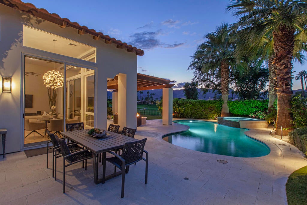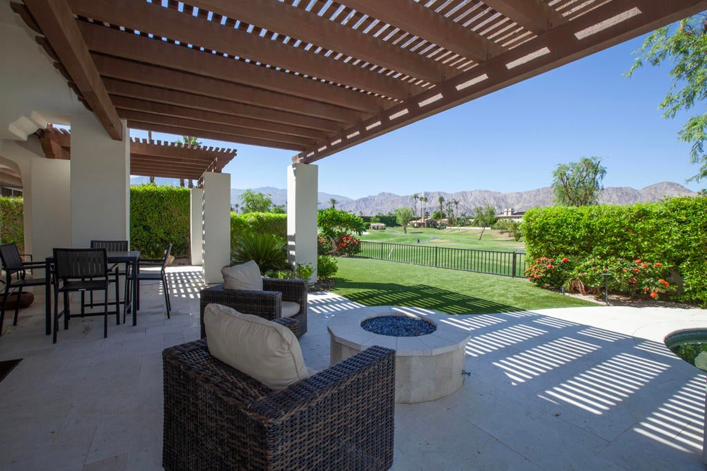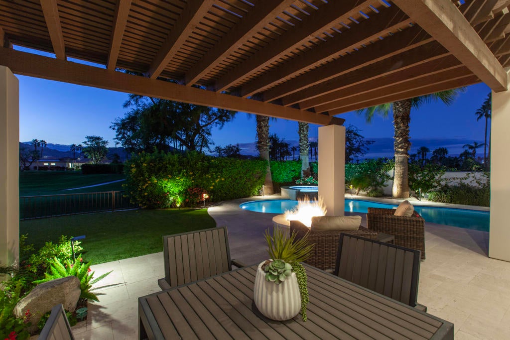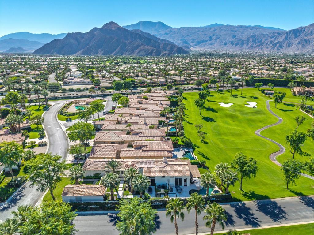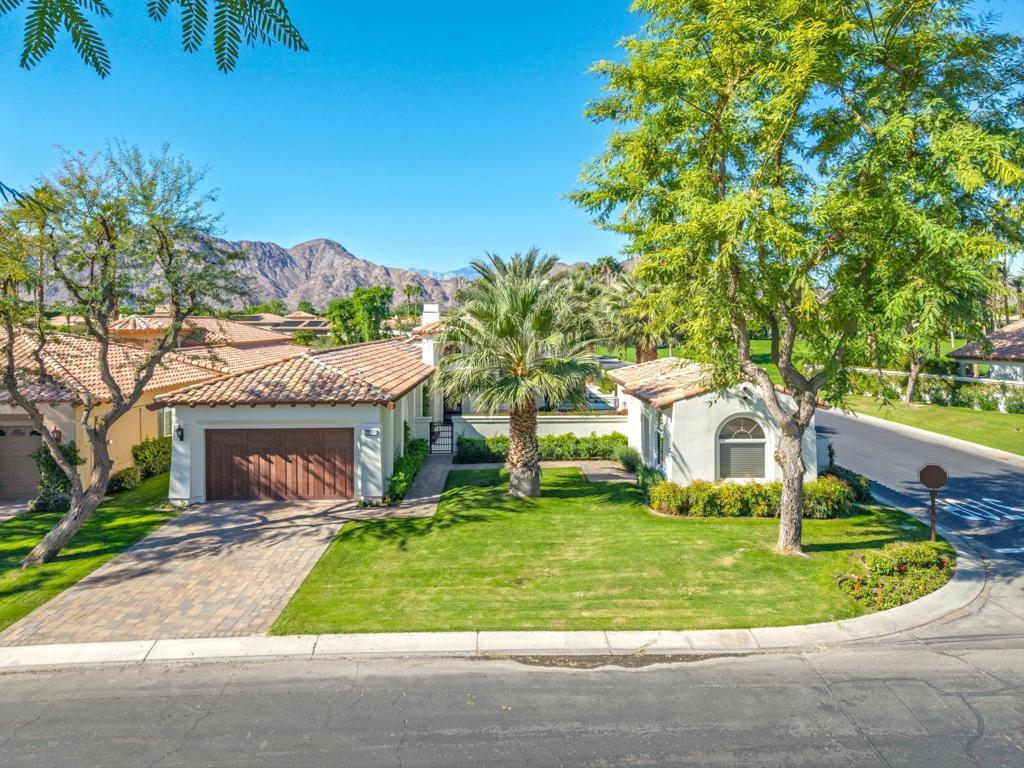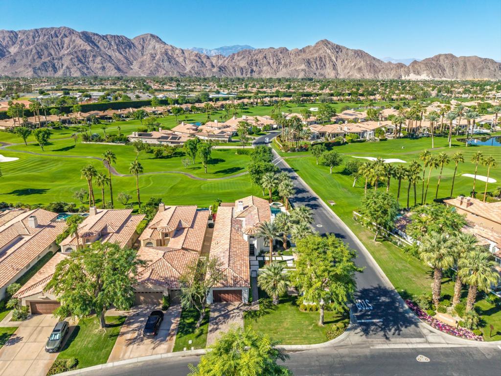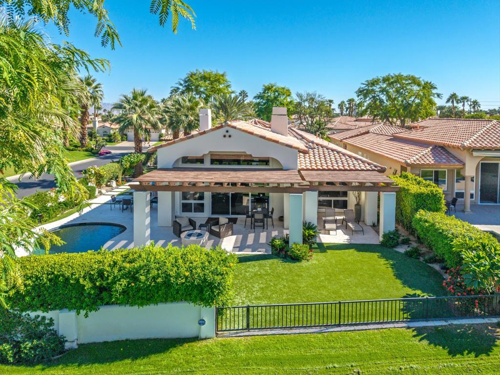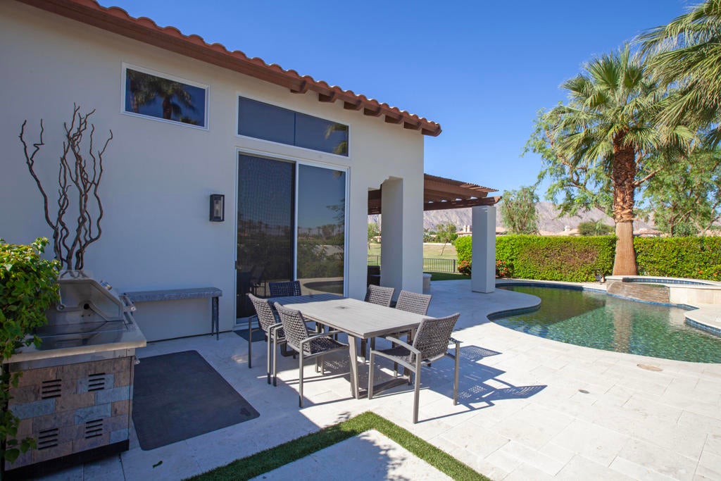 Step into refined desert sophistication at this stunningly remodeled contemporary retreat in the prestigious Rancho La Quinta Country Club. Every element of this residence has been masterfully curated to embody modern elegance, comfort, and tranquility. With no other home in the community offering such extraordinary fairway and mountain views, the setting feels like living inside a constantly changing work of art. From the moment you arrive, the lush landscaping, architectural precision, and commanding curb appeal set the tone for something truly special. Situated on an expansive 14,375 sq. ft. end lot with no neighbor on one side, this home is designed for ultimate privacy and serenity. The outdoor living spaces are nothing short of resort caliber. An entertainer's dream featuring a dramatic custom patio, sparkling pool and spa with cascading waterfall, fire pit, and sweeping vistas of the south and west mountains glowing at sunset. A two-room detached guest casita provides comfort and autonomy for guests, blending seamlessly into the design yet offering its own quiet retreat. The main home invites you through a striking custom front door crafted of hot-waxed glass and rich wood, revealing a light-filled great room that perfectly balances openness with warmth. Walls of windows frame the spectacular views, while a thoughtfully reimagined floor plan achieved by removing a dividing wall unites the kitchen, dining, and living areas in perfect harmony. Dual modern fireplace walls create dramatic focal points, complementing soaring ceilings and sleek architectural lines.The chef's kitchen is a showpiece in itself, anchored by a massive quartz-topped island ideal for entertaining. Outfitted with premium stainless-steel appliances, Cambria stone surfaces, refreshed millwork, and a climate-controlled wine cellar, it's designed for both daily indulgence and gourmet artistry. Control 4 home automation seamlessly integrates lighting, climate, and sound throughout the home, offering luxury at your fingertips. Every detail reflects quality: travertine floors, refined base molding, custom window treatments, and designer lighting that sets a warm, ambient glow. Even the practical spaces shine. The expanded four-car garage features epoxy flooring, dedicated air conditioning, and a custom wood-look door. A paver driveway and meandering walkways tie the exterior together with effortless elegance. Offered partially furnished. Please see Improvements and Amenities list.