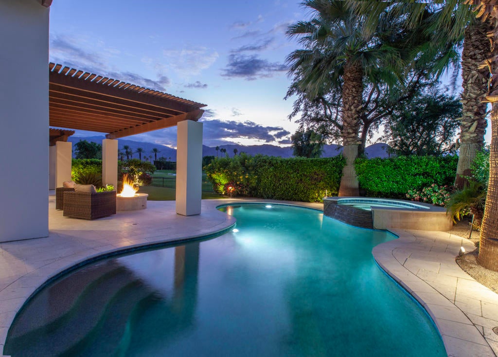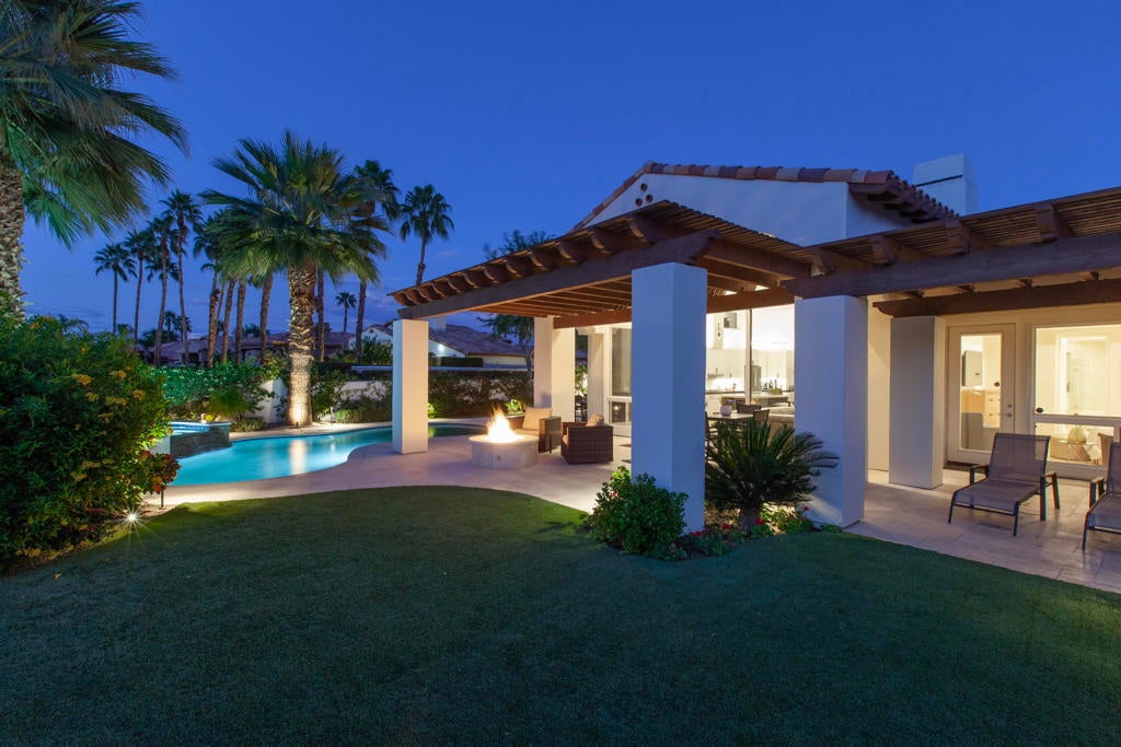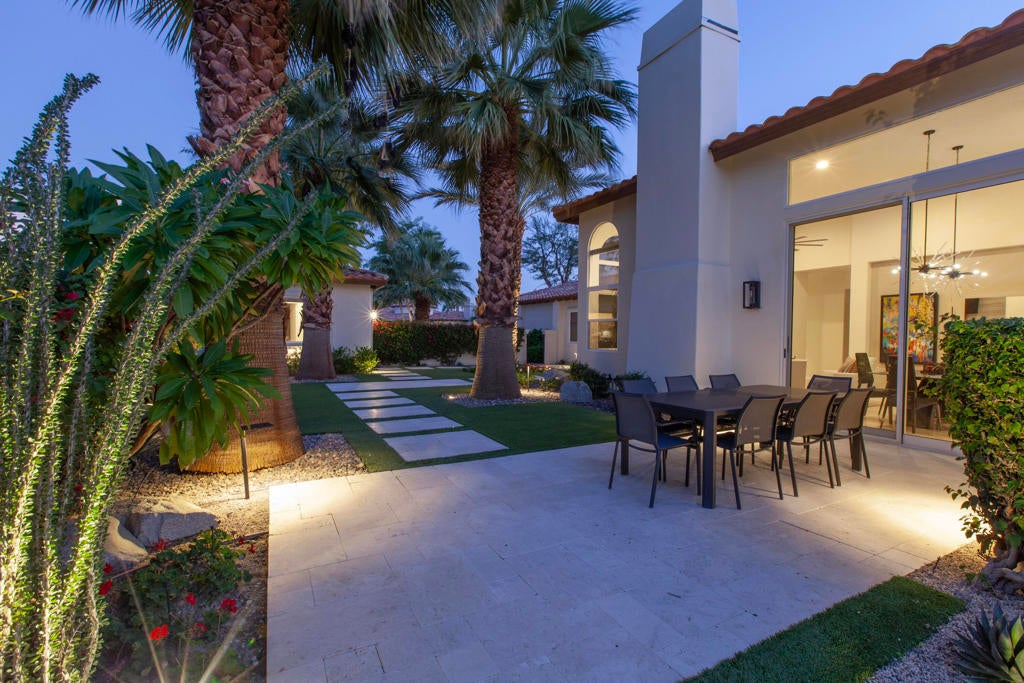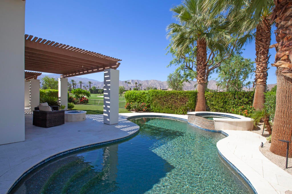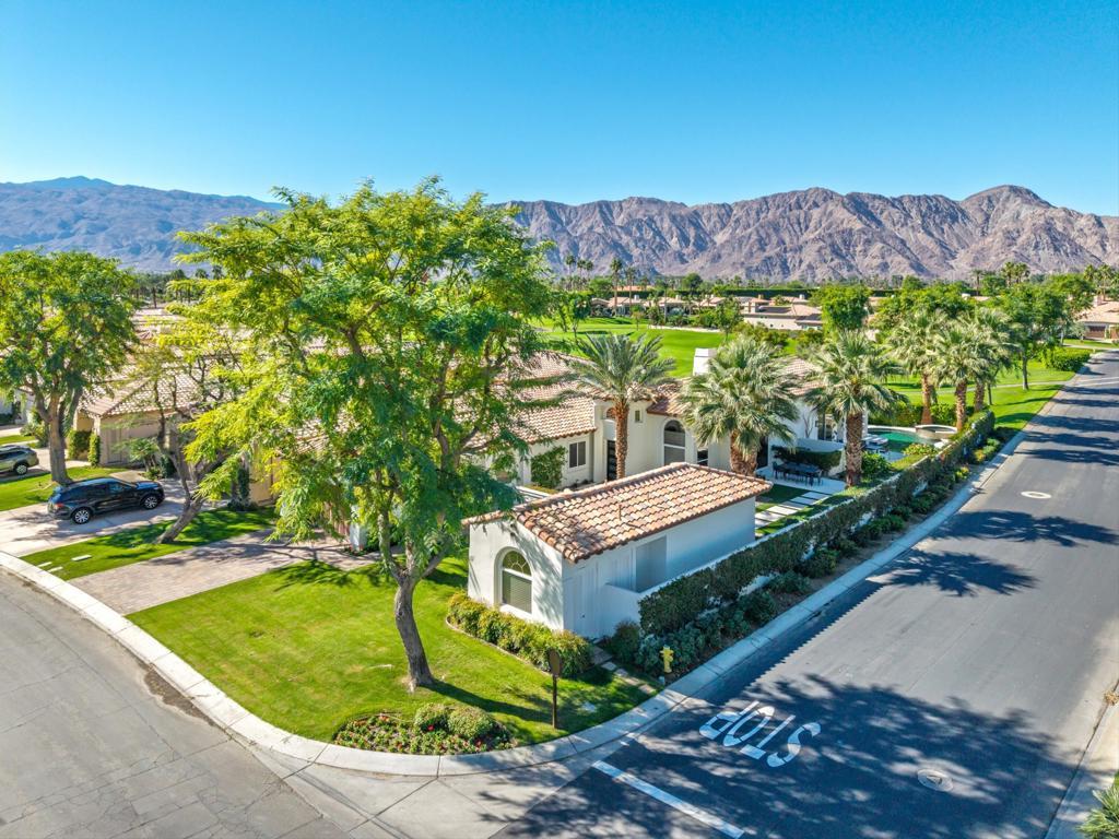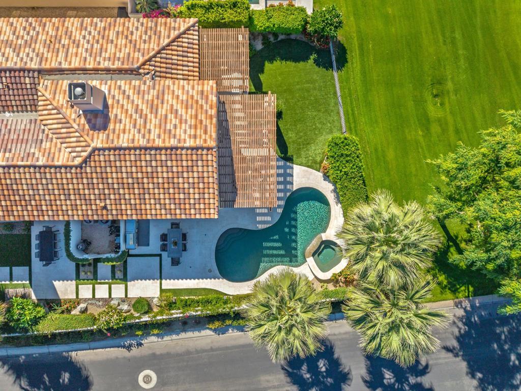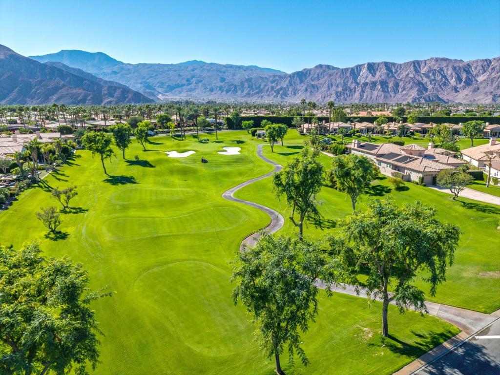 Step into refined desert sophistication at this stunningly remodeled contemporary retreat in the prestigious Rancho La Quinta Country Club. Every element of this residence has been masterfully curated to embody modern elegance, comfort, and tranquility. With no other home in the community offering such extraordinary fairway and mountain views, the setting feels like living inside a constantly changing work of art. From the moment you arrive, the lush landscaping, architectural precision, and commanding curb appeal set the tone for something truly special. Situated on an expansive 14,375 sq. ft. end lot with no neighbor on one side, this home is designed for ultimate privacy and serenity. The outdoor living spaces are nothing short of resort caliber. An entertainer's dream featuring a dramatic custom patio, sparkling pool and spa with cascading waterfall, fire pit, and sweeping vistas of the south and west mountains glowing at sunset. A two-room detached guest casita provides comfort and autonomy for guests, blending seamlessly into the design yet offering its own quiet retreat. The main home invites you through a striking custom front door crafted of hot-waxed glass and rich wood, revealing a light-filled great room that perfectly balances openness with warmth. Walls of windows frame the spectacular views, while a thoughtfully reimagined floor plan achieved by removing a dividing wall unites the kitchen, dining, and living areas in perfect harmony. Dual modern fireplace walls create dramatic focal points, complementing soaring ceilings and sleek architectural lines.The chef's kitchen is a showpiece in itself, anchored by a massive quartz-topped island ideal for entertaining. Outfitted with premium stainless-steel appliances, Cambria stone surfaces, refreshed millwork, and a climate-controlled wine cellar, it's designed for both daily indulgence and gourmet artistry. Control 4 home automation seamlessly integrates lighting, climate, and sound throughout the home, offering luxury at your fingertips. Every detail reflects quality: travertine floors, refined base molding, custom window treatments, and designer lighting that sets a warm, ambient glow. Even the practical spaces shine. The expanded four-car garage features epoxy flooring, dedicated air conditioning, and a custom wood-look door. A paver driveway and meandering walkways tie the exterior together with effortless elegance. Offered partially furnished. Please see Improvements and Amenities list.