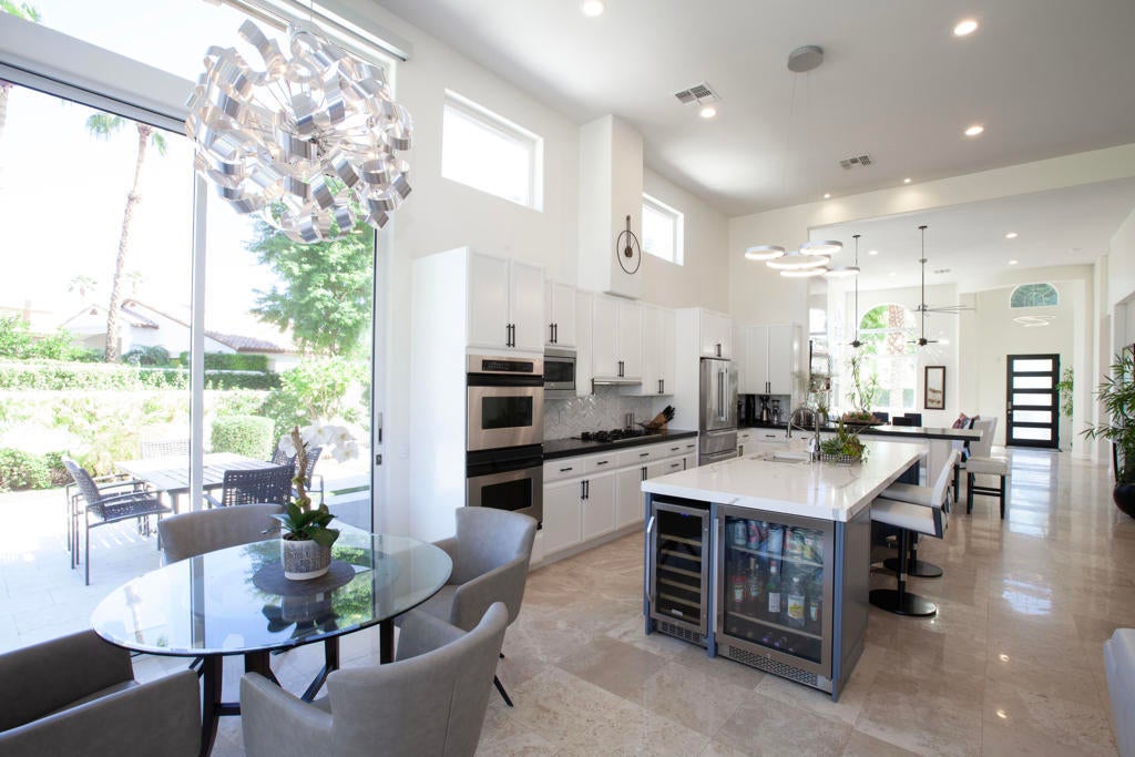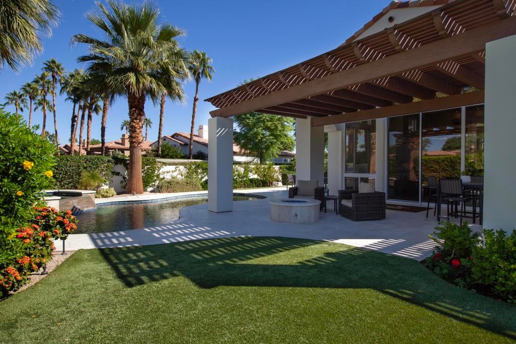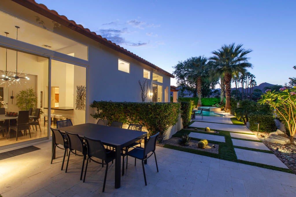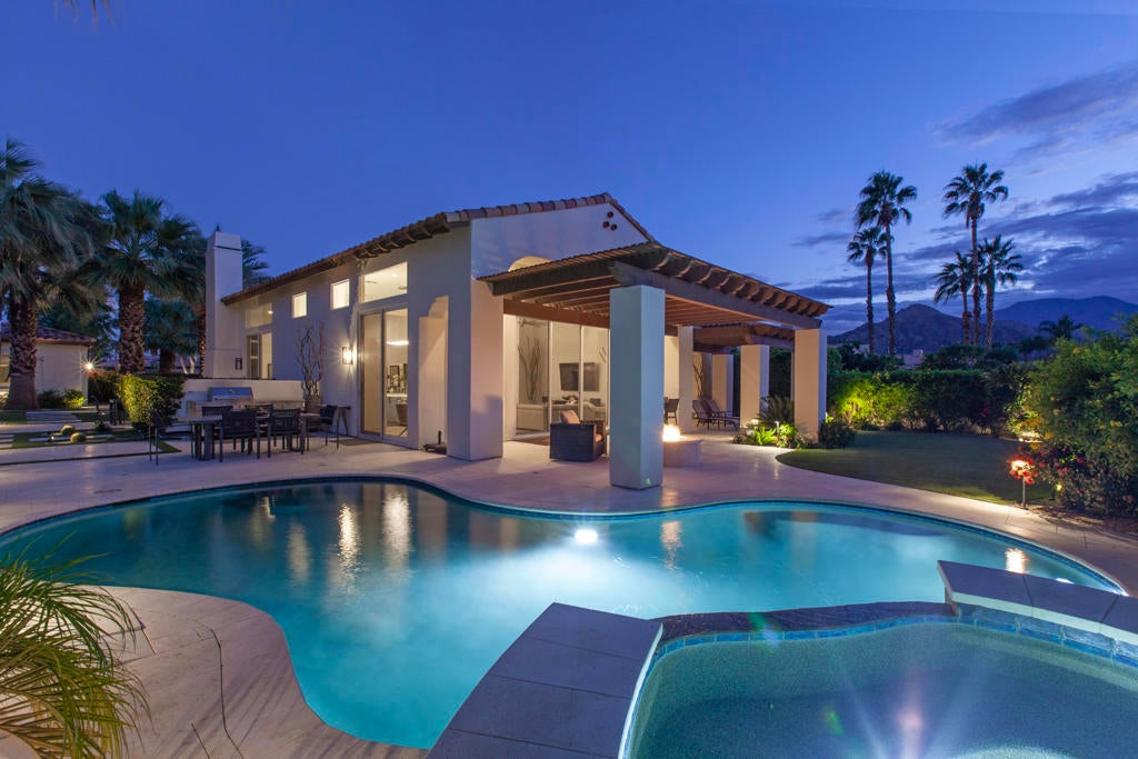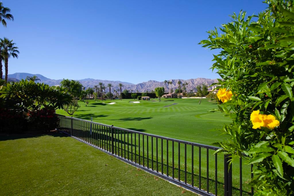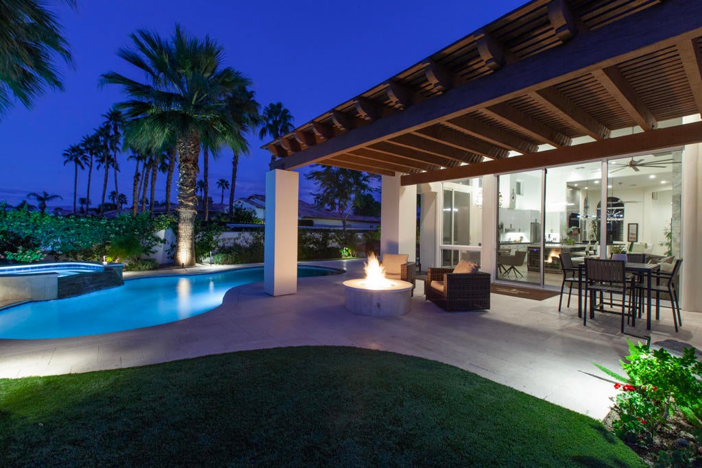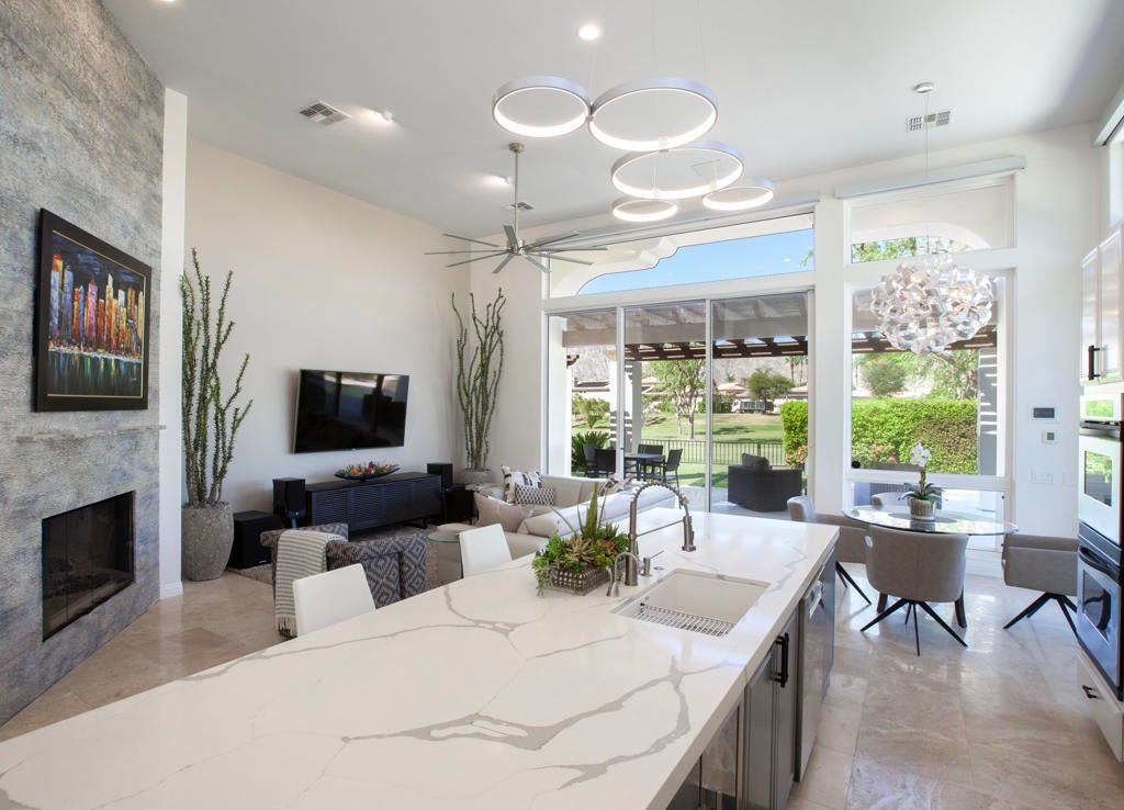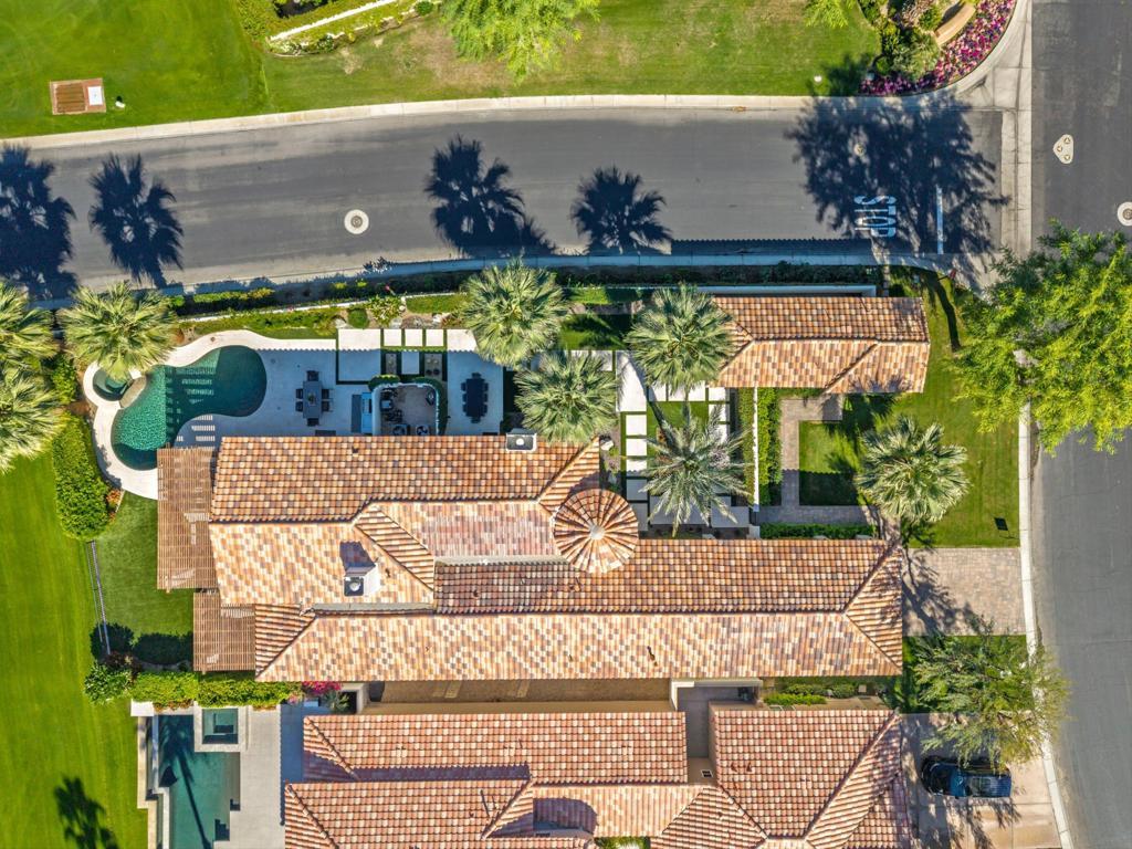 Step into refined desert sophistication at this stunningly remodeled contemporary retreat in the prestigious Rancho La Quinta Country Club. Every element of this residence has been masterfully curated to embody modern elegance, comfort, and tranquility. With no other home in the community offering such extraordinary fairway and mountain views, the setting feels like living inside a constantly changing work of art. From the moment you arrive, the lush landscaping, architectural precision, and commanding curb appeal set the tone for something truly special. Situated on an expansive 14,375 sq. ft. end lot with no neighbor on one side, this home is designed for ultimate privacy and serenity. The outdoor living spaces are nothing short of resort caliber. An entertainer's dream featuring a dramatic custom patio, sparkling pool and spa with cascading waterfall, fire pit, and sweeping vistas of the south and west mountains glowing at sunset. A two-room detached guest casita provides comfort and autonomy for guests, blending seamlessly into the design yet offering its own quiet retreat. The main home invites you through a striking custom front door crafted of hot-waxed glass and rich wood, revealing a light-filled great room that perfectly balances openness with warmth. Walls of windows frame the spectacular views, while a thoughtfully reimagined floor plan achieved by removing a dividing wall unites the kitchen, dining, and living areas in perfect harmony. Dual modern fireplace walls create dramatic focal points, complementing soaring ceilings and sleek architectural lines.The chef's kitchen is a showpiece in itself, anchored by a massive quartz-topped island ideal for entertaining. Outfitted with premium stainless-steel appliances, Cambria stone surfaces, refreshed millwork, and a climate-controlled wine cellar, it's designed for both daily indulgence and gourmet artistry. Control 4 home automation seamlessly integrates lighting, climate, and sound throughout the home, offering luxury at your fingertips. Every detail reflects quality: travertine floors, refined base molding, custom window treatments, and designer lighting that sets a warm, ambient glow. Even the practical spaces shine. The expanded four-car garage features epoxy flooring, dedicated air conditioning, and a custom wood-look door. A paver driveway and meandering walkways tie the exterior together with effortless elegance. Offered partially furnished. Please see Improvements and Amenities list.