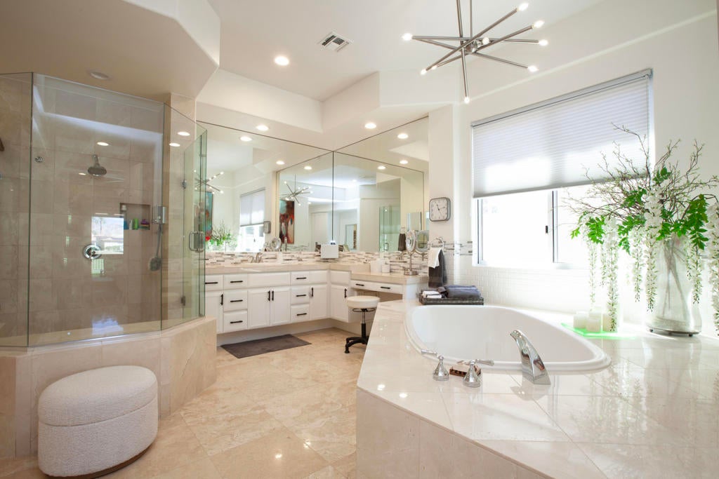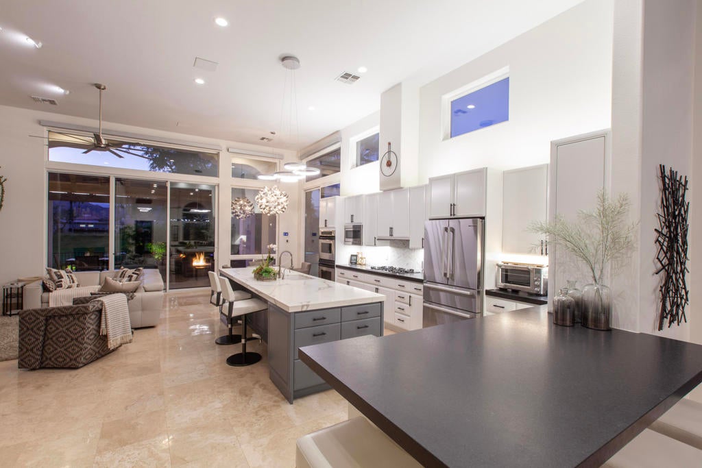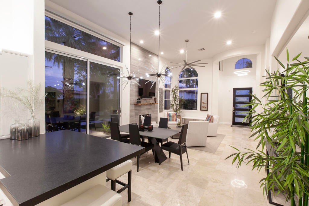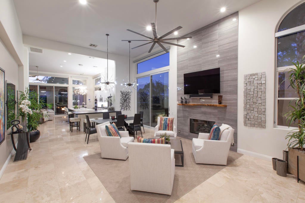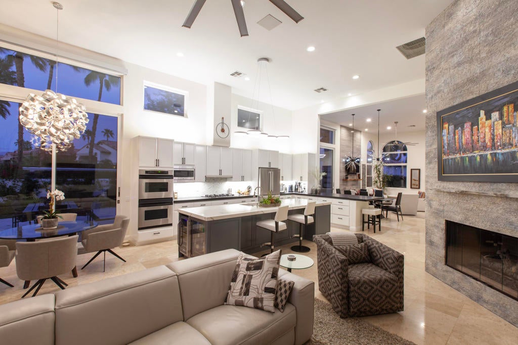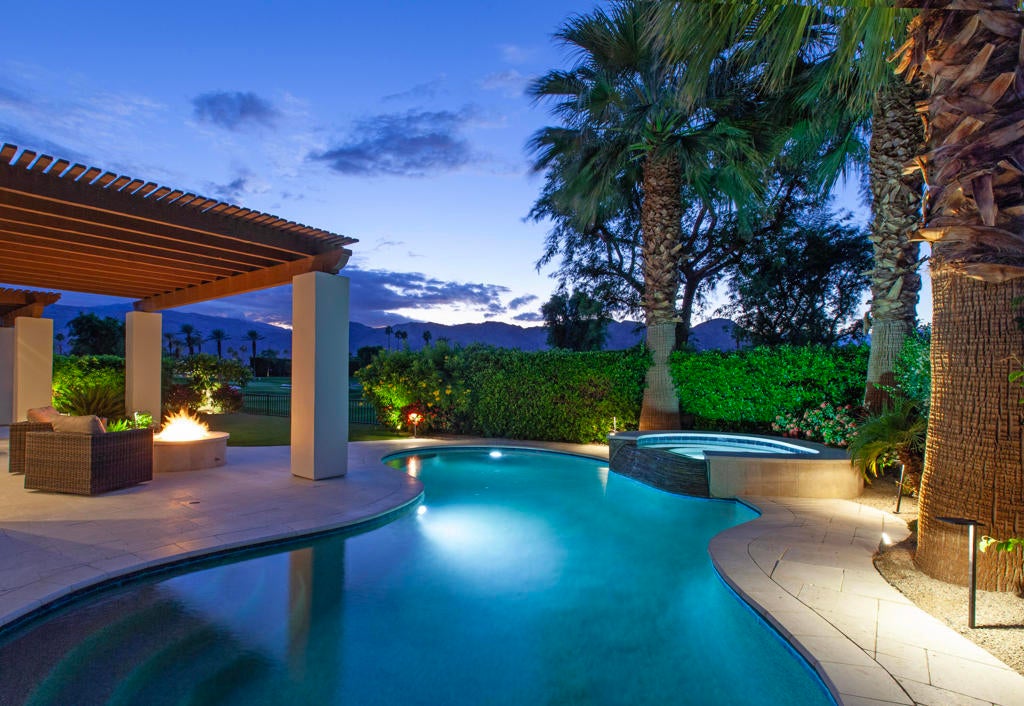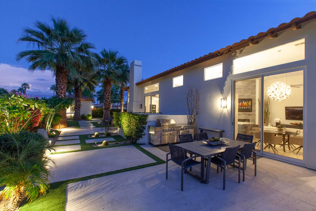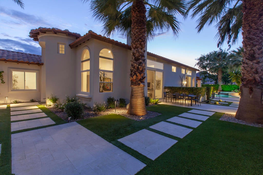 Step into refined desert sophistication at this stunningly remodeled contemporary retreat in the prestigious Rancho La Quinta Country Club. Every element of this residence has been masterfully curated to embody modern elegance, comfort, and tranquility. With no other home in the community offering such extraordinary fairway and mountain views, the setting feels like living inside a constantly changing work of art. From the moment you arrive, the lush landscaping, architectural precision, and commanding curb appeal set the tone for something truly special. Situated on an expansive 14,375 sq. ft. end lot with no neighbor on one side, this home is designed for ultimate privacy and serenity. The outdoor living spaces are nothing short of resort caliber. An entertainer's dream featuring a dramatic custom patio, sparkling pool and spa with cascading waterfall, fire pit, and sweeping vistas of the south and west mountains glowing at sunset. A two-room detached guest casita provides comfort and autonomy for guests, blending seamlessly into the design yet offering its own quiet retreat. The main home invites you through a striking custom front door crafted of hot-waxed glass and rich wood, revealing a light-filled great room that perfectly balances openness with warmth. Walls of windows frame the spectacular views, while a thoughtfully reimagined floor plan achieved by removing a dividing wall unites the kitchen, dining, and living areas in perfect harmony. Dual modern fireplace walls create dramatic focal points, complementing soaring ceilings and sleek architectural lines.The chef's kitchen is a showpiece in itself, anchored by a massive quartz-topped island ideal for entertaining. Outfitted with premium stainless-steel appliances, Cambria stone surfaces, refreshed millwork, and a climate-controlled wine cellar, it's designed for both daily indulgence and gourmet artistry. Control 4 home automation seamlessly integrates lighting, climate, and sound throughout the home, offering luxury at your fingertips. Every detail reflects quality: travertine floors, refined base molding, custom window treatments, and designer lighting that sets a warm, ambient glow. Even the practical spaces shine. The expanded four-car garage features epoxy flooring, dedicated air conditioning, and a custom wood-look door. A paver driveway and meandering walkways tie the exterior together with effortless elegance. Offered partially furnished. Please see Improvements and Amenities list.