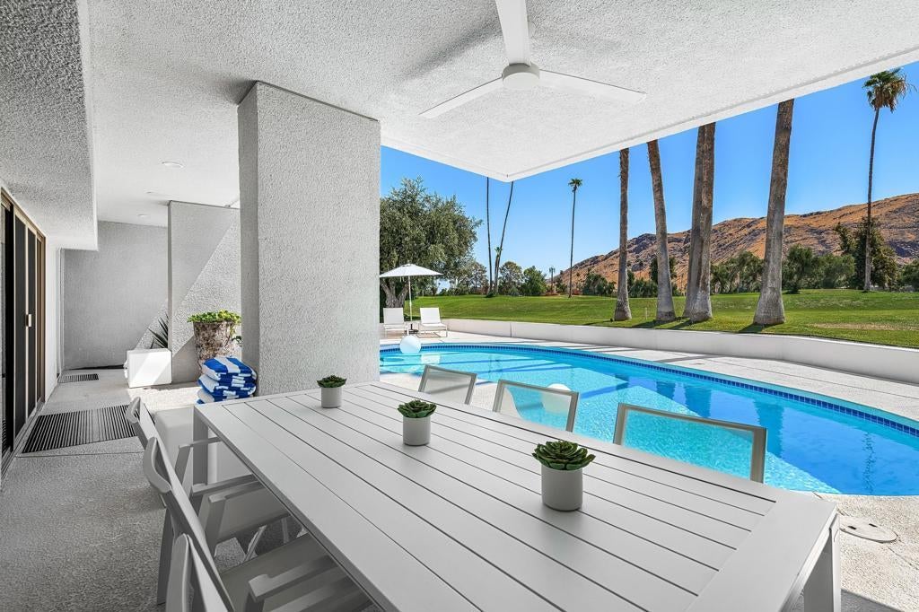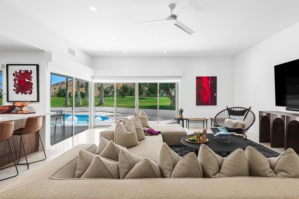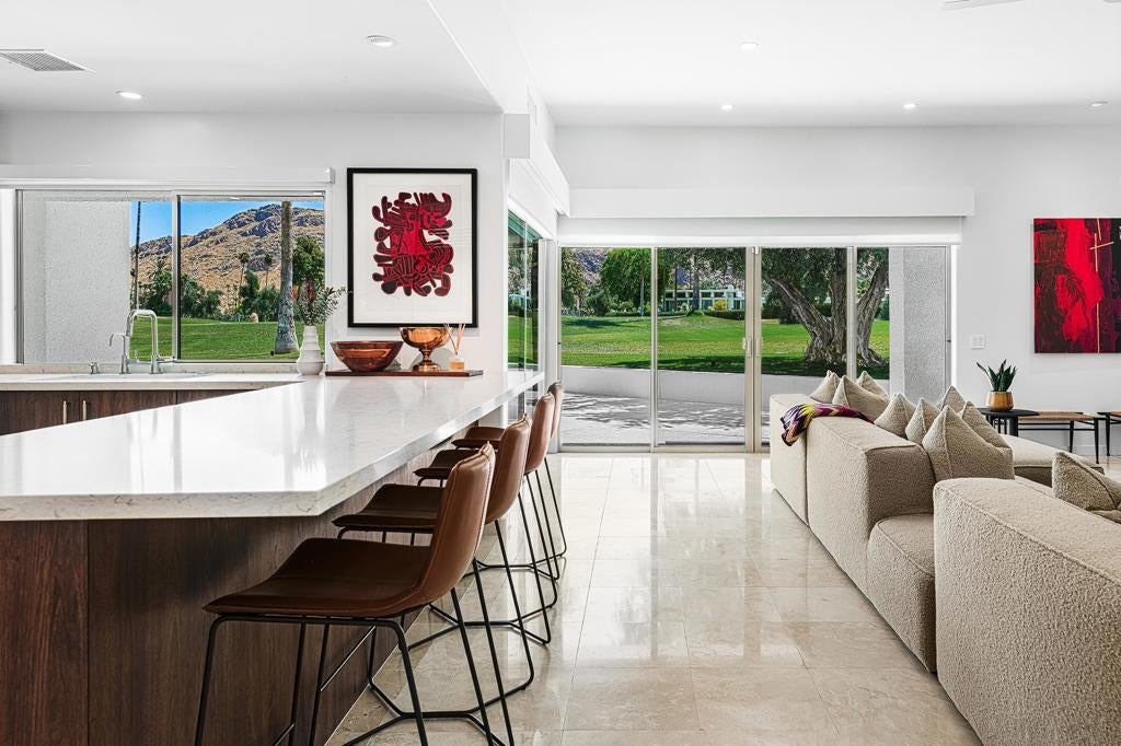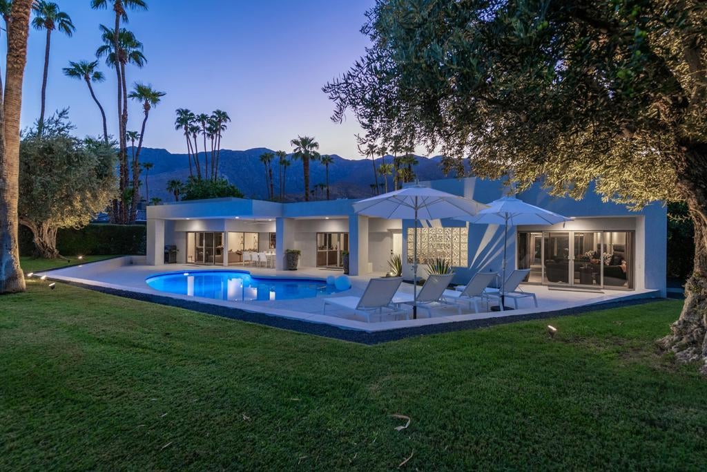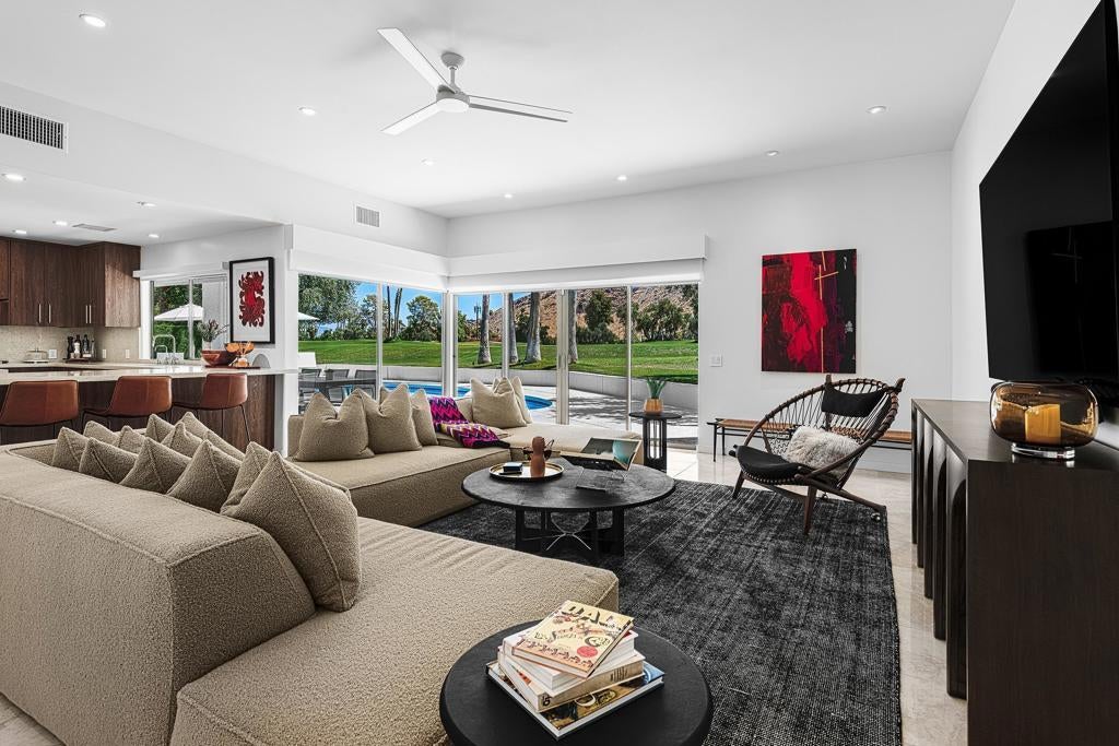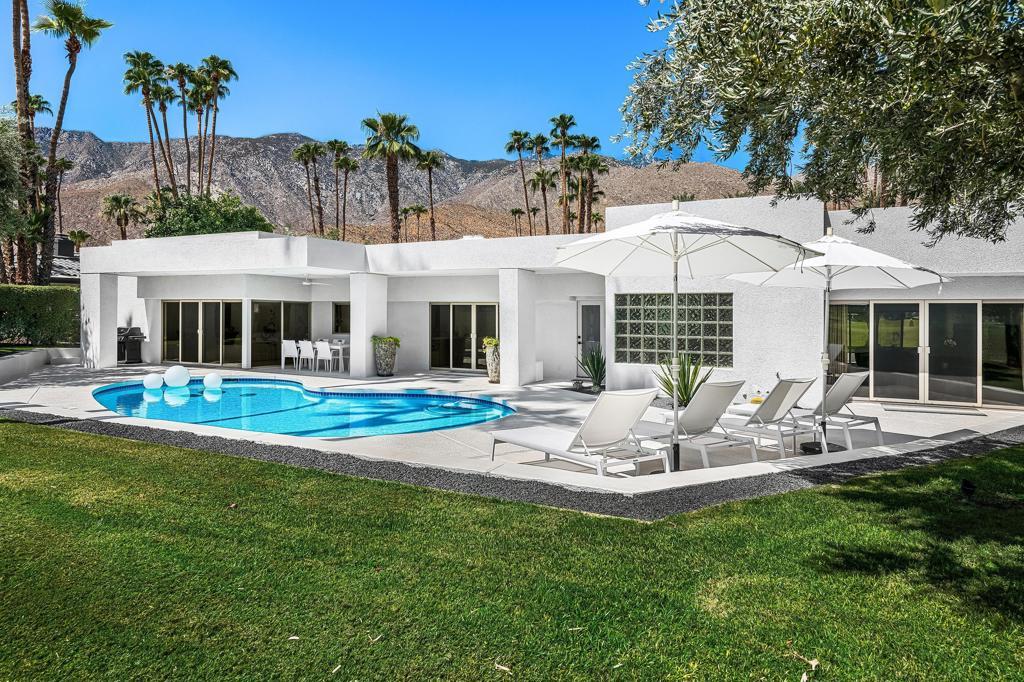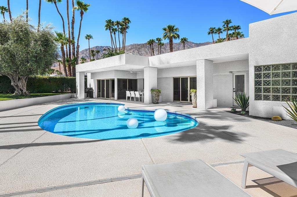 Set against the dramatic backdrop of the Santa Rosa Mountains, this striking white modern residence offers serene golf course vistas and an atmosphere of tranquility within a beautifully maintained community.From the moment you arrive, the home's captivating curb appeal and lush, sculpted landscaping create an unforgettable first impression. Iconic double entry doors open to an interior that masterfully blends sleek modern design with effortless livability. The inviting living room, anchored by a travertine fireplace, sets the stage for elegant entertaining or quiet evenings by the fire.The formal dining room frames picture-perfect views of the mountains, golf course, pool, and spa an exquisite setting for dinner parties and gatherings. Adjacent, the chef's kitchen is a culinary dream, appointed with premium appliances, a center prep island, quartz countertops, and a casual dining bar ideal for morning coffee or relaxed meals. Flowing seamlessly from the kitchen, the spacious family room offers the perfect retreat after sun-drenched days spent lounging by the pool or soaking in the spa amidst the resort-style backyard.Perfectly situated near world-class dining, shopping, golf, and hiking, this residence places you at the very heart of the Palm Springs lifestyle. After a day of exploration, unwind in the luxurious primary suite where every detail has been thoughtfully curated for comfort and style. Two beautifully appointed guest rooms ensure your visitors feel equally at home.An attached garage adds everyday convenience, completing this impeccable desert retreat a harmonious blend of luxury, sophistication, and ease. Once here, you may never want to leave.