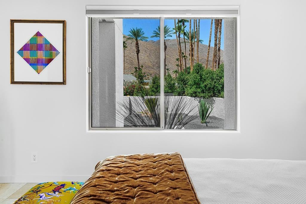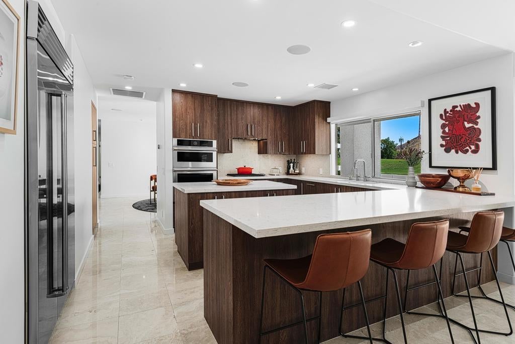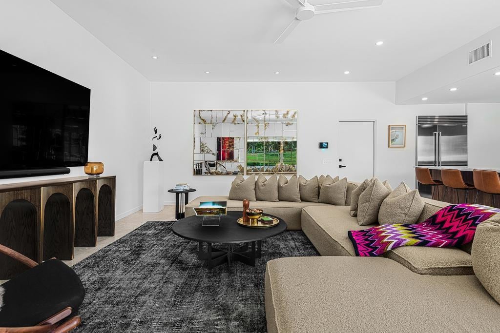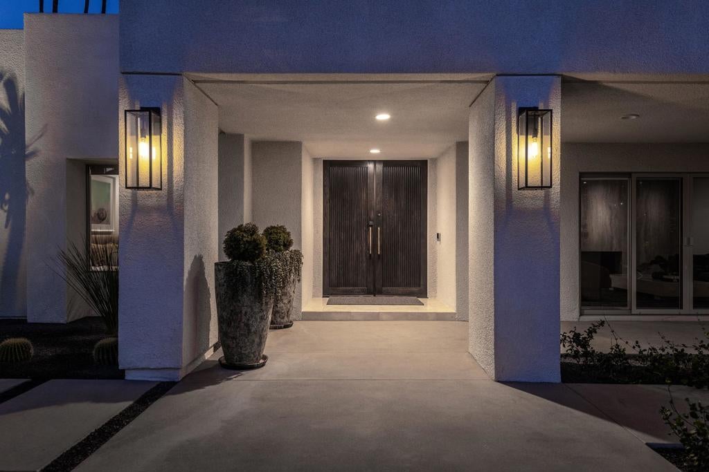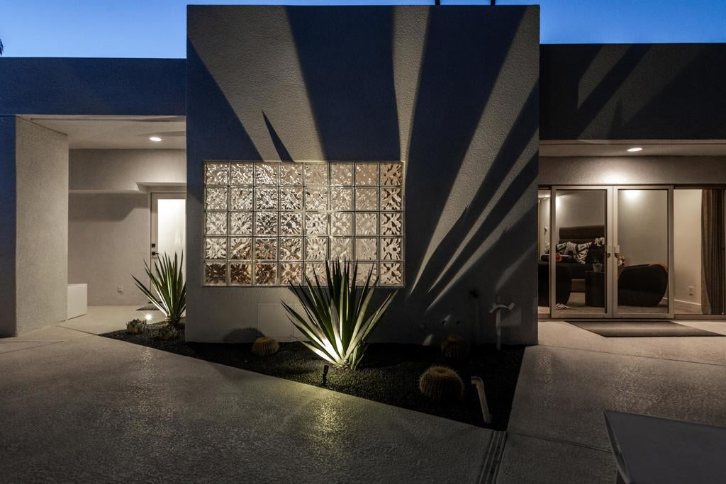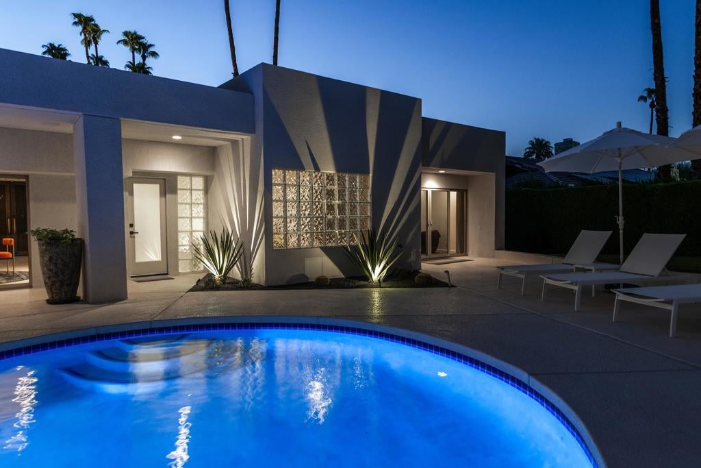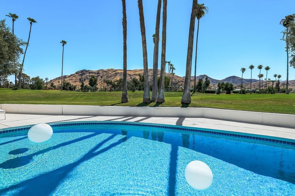 Set against the dramatic backdrop of the Santa Rosa Mountains, this striking white modern residence offers serene golf course vistas and an atmosphere of tranquility within a beautifully maintained community.From the moment you arrive, the home's captivating curb appeal and lush, sculpted landscaping create an unforgettable first impression. Iconic double entry doors open to an interior that masterfully blends sleek modern design with effortless livability. The inviting living room, anchored by a travertine fireplace, sets the stage for elegant entertaining or quiet evenings by the fire.The formal dining room frames picture-perfect views of the mountains, golf course, pool, and spa an exquisite setting for dinner parties and gatherings. Adjacent, the chef's kitchen is a culinary dream, appointed with premium appliances, a center prep island, quartz countertops, and a casual dining bar ideal for morning coffee or relaxed meals. Flowing seamlessly from the kitchen, the spacious family room offers the perfect retreat after sun-drenched days spent lounging by the pool or soaking in the spa amidst the resort-style backyard.Perfectly situated near world-class dining, shopping, golf, and hiking, this residence places you at the very heart of the Palm Springs lifestyle. After a day of exploration, unwind in the luxurious primary suite where every detail has been thoughtfully curated for comfort and style. Two beautifully appointed guest rooms ensure your visitors feel equally at home.An attached garage adds everyday convenience, completing this impeccable desert retreat a harmonious blend of luxury, sophistication, and ease. Once here, you may never want to leave.