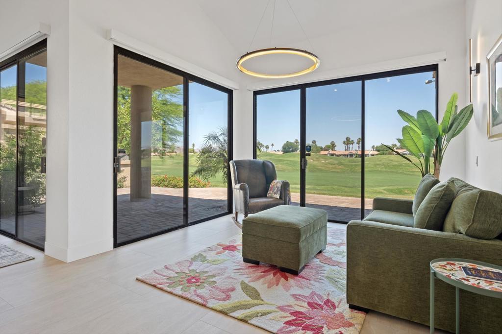 Welcome to this beautifully upgraded Legends 40 model home, perfectly located on the 3rd hole of the iconic PGA West Stadium Course. Offering panoramic golf course and mountain views, this 3,031 sq. ft. residence is the ultimate in desert resort living.Step inside to a light-filled, expansive floor plan featuring 3 spacious ensuite bedrooms and 3.5 baths. Recently refreshed with all new tile and carpet flooring, fresh interior paint, and modern painted MDF baseboards and door trim, the home exudes contemporary elegance throughout.Entertain effortlessly in the grand living room with a sunken wet bar and breathtaking views, or cook like a pro in the chef's kitchen with granite countertops and premium stainless steel appliances. All-new LED can lighting throughout highlights the sophisticated finishes, while shutters in the primary suite and guest bedroom add a layer of privacy and charm.Additional upgrades include a newer AC unit, new mini-split A/C in the main garage, epoxy garage flooring, newer designer furnishings, and a Silver EZ-GO electric golf cart. Step outside to enjoy your private patio with new outdoor furniture and a brand-new Traeger ''Flatrock'' BBQ--perfect for sunset gatherings.This home also features high-end custom electric blinds in living room, sitting area, and dining room. Lastly, there are Eufy security cameras for added peace of mind. Offered fully furnished per inventory.