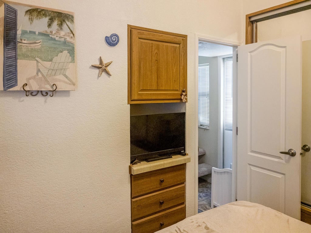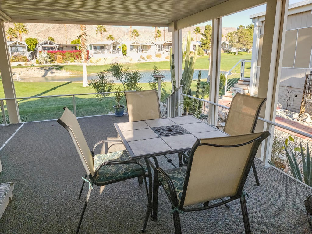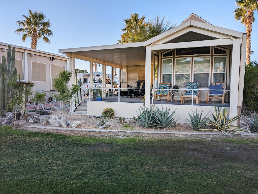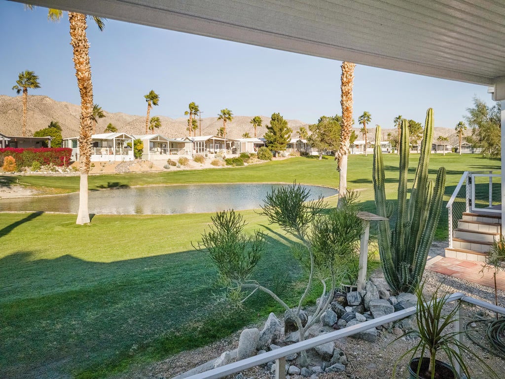 Magnificent location on the 8th hole of the golf course! Here we have a well-appointed 1 bedroom, 1 bath plus an additional sleeping area, 2007 Loft Style Park Model home featuring high ceilings throughout the living areas, a fireplace, an efficient home brightly lit by natural sunlight, and pride in ownership. Step outside onto the wrap around covered porch and take in the beautiful greens, pond, and desert scenery out the back. All this is being offered now in the exquisite 55+ Caliente Springs Resort. Immerse yourself in the top-notch amenities including mineral hot spring fed pool and spas, state of the art fitness center, 9-hole golf course, pickleball courts, tennis court, laundry facilities, library, and a fun active community. Lot is not owned; space rent $950.