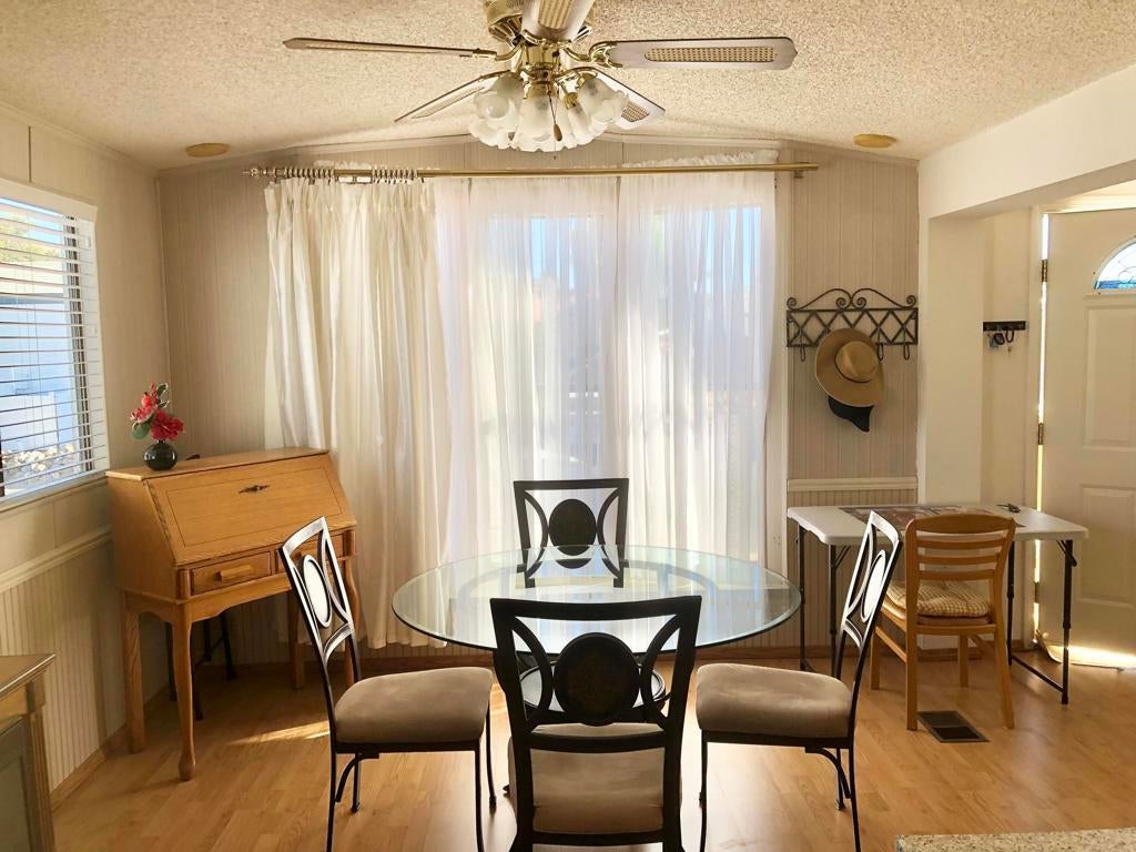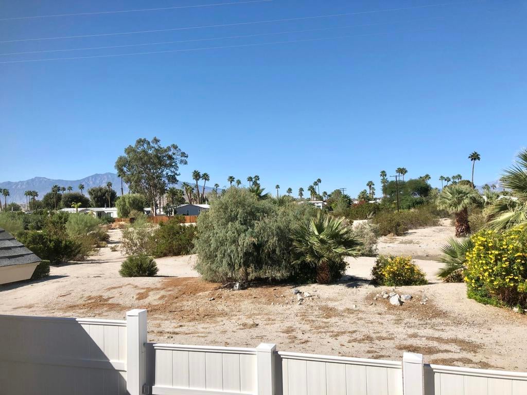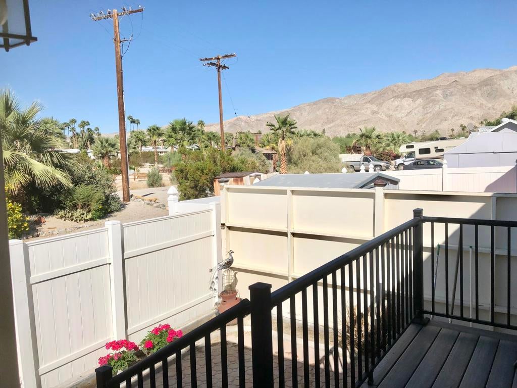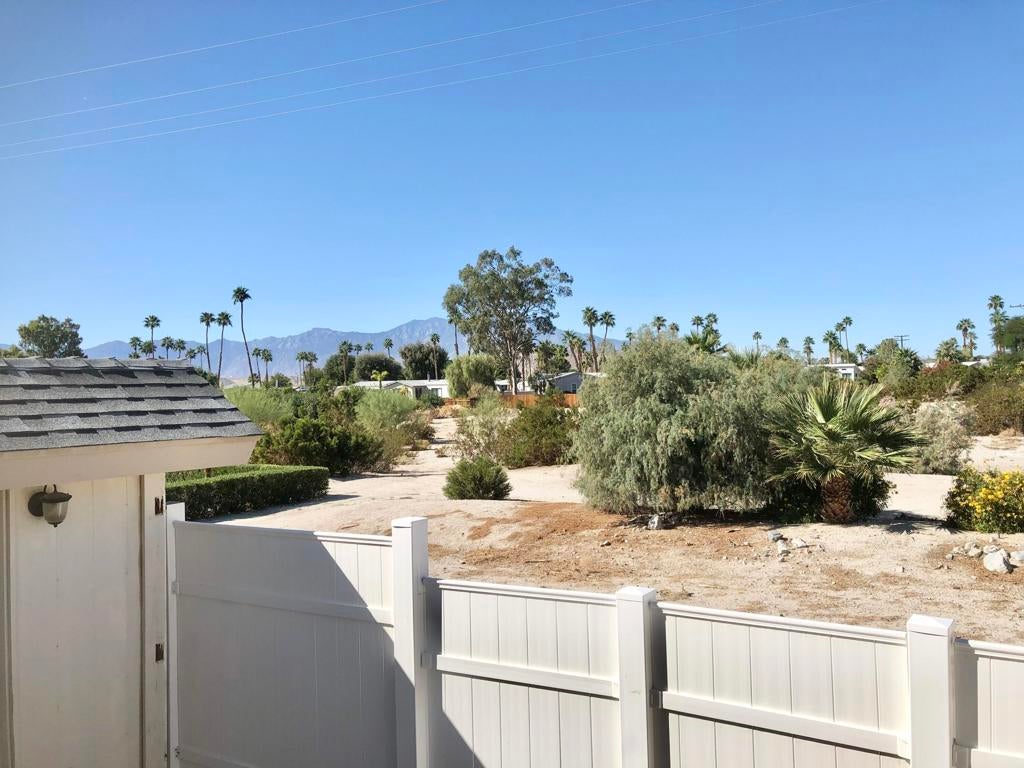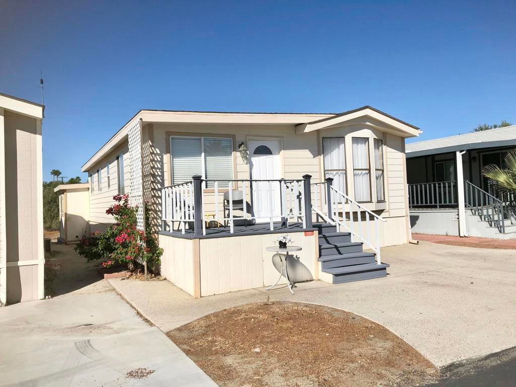 IMMACULATE park model with large room addition, divided between living room and second bedroom with half bath and large walk in closet. Full sized washer and dryer in finished shed with additional sleeping area. Peaceful front deck and you can hear the free concerts from the rear deck, facing the Wild West Wash walking trail, San Jacinto mountain and sunset. FENCED yard great for pets! TURN KEY, furnished, stocked with kitchenware and linent. Electric fireplace producing heat to keep you cozy on cold desert nights.ALL AGED gated community of Sky Valley Resort offers lots of amenities! 13 sparkling hot spring mineral pools, pickleball, walking trails, fitness center, library, cafe, community events and daily exercise classes.Call for a showing! 760-218-9974