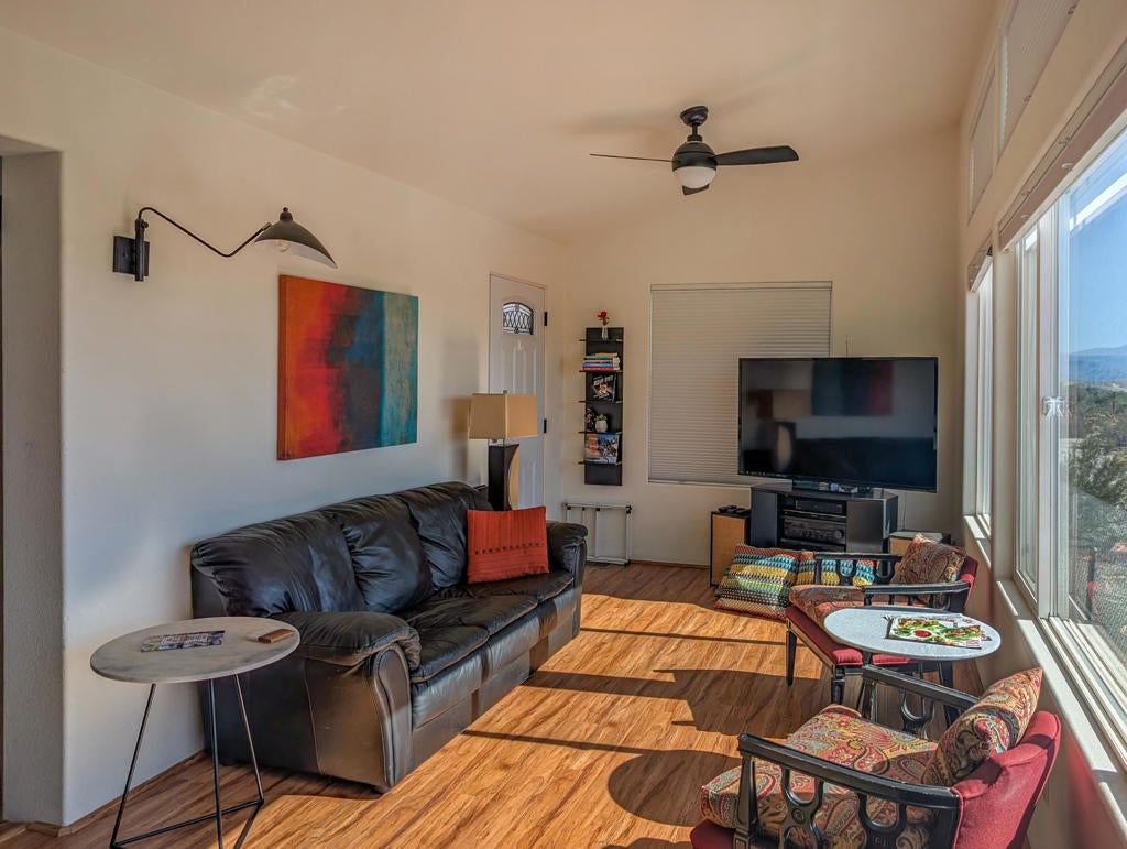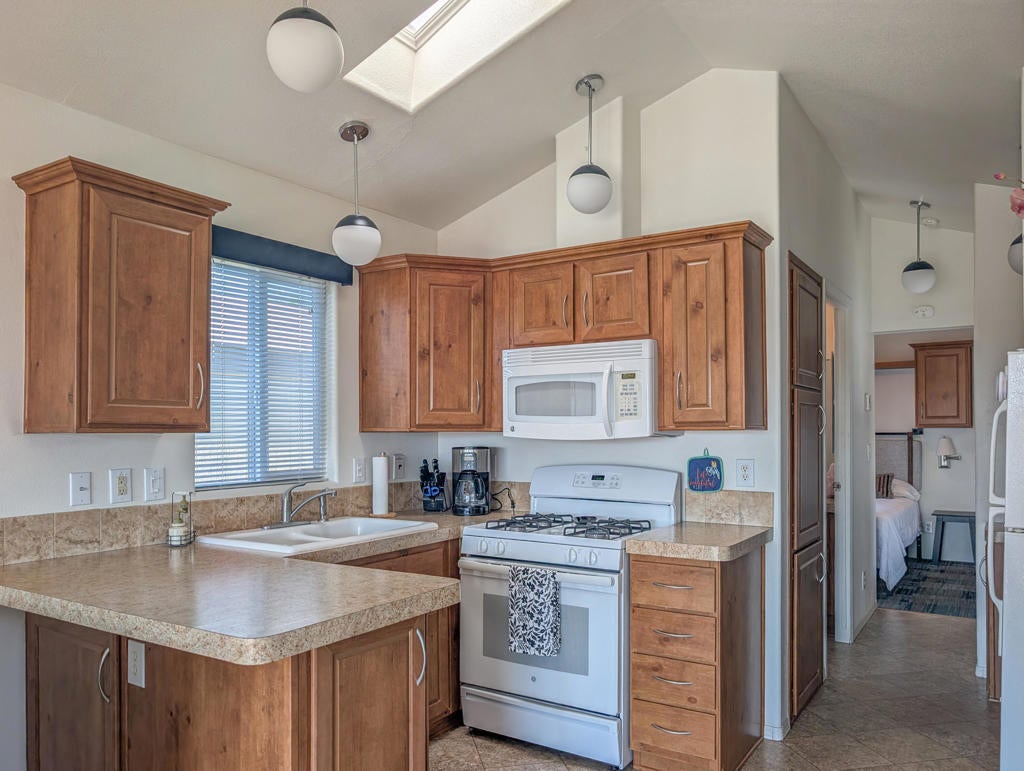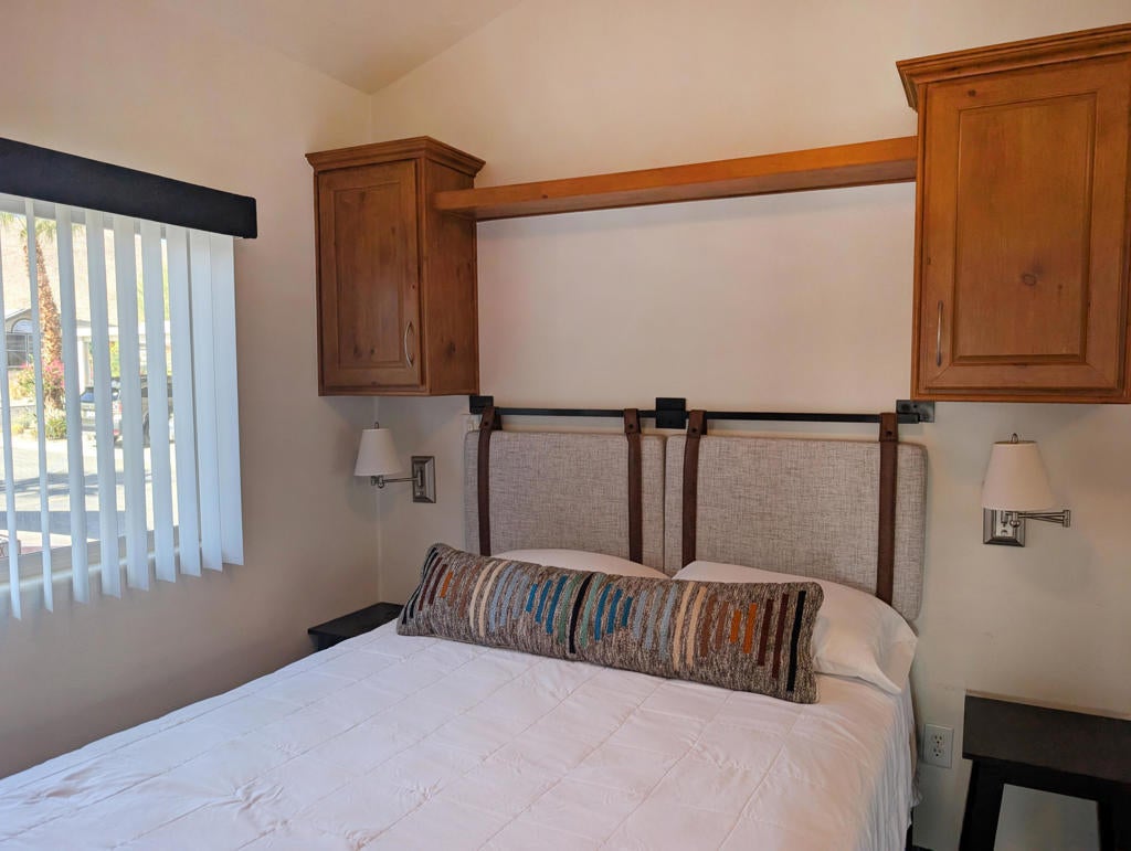 Exceptional Desert Retreat at Caliente Springs. Come and experience breathtaking panoramic desert views from this remarkable 2014 Cavco Park Model home. Meticulously and thoughtfully designed, this residence features 1 bedroom and 1 bathroom, enhanced by attractive flooring throughout the living spaces. The kitchen is bright and inviting, thanks to a skylight that basks the area with natural light, making cooking and dining a pleasurable experience. An added bonus is that all lighting plus three ceiling fans have recently been tastefully upgraded with Mid-Century Modern accentuations. Enjoy magnificent vistas and sunsets from the spacious California room, perfect for relaxing and taking in the captivating desert and mountain surroundings. Step outside to a private, well-appointed deck, ideal for entertaining guests or simply unwinding in peace. The extra-large shed has double doors and three levels of storage to easily accommodate any need for additional space. This most desirable home reflects pride in ownership and offers versatile and flexibility for both a tranquil getaway or comfortable full-time living. Located in Caliente Springs, a premier 55+ RV resort, residents have access to outstanding amenities including rejuvenating hot mineral springs pool and spas, a scenic 9-hole golf course, pickleball and tennis courts, a modern fitness center, and an active community with year-round planned events. The lot is not owned; space rent is $811.