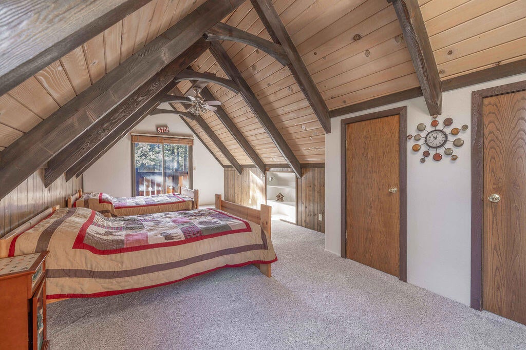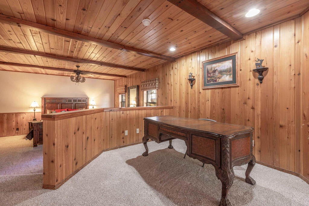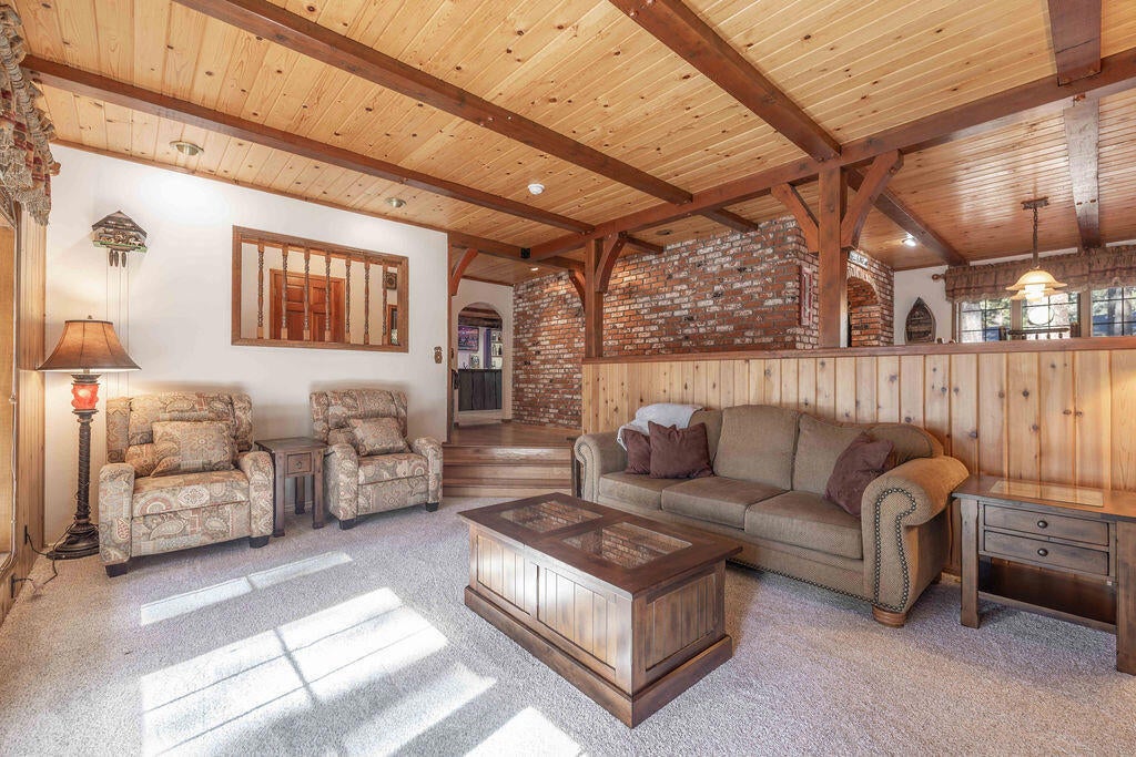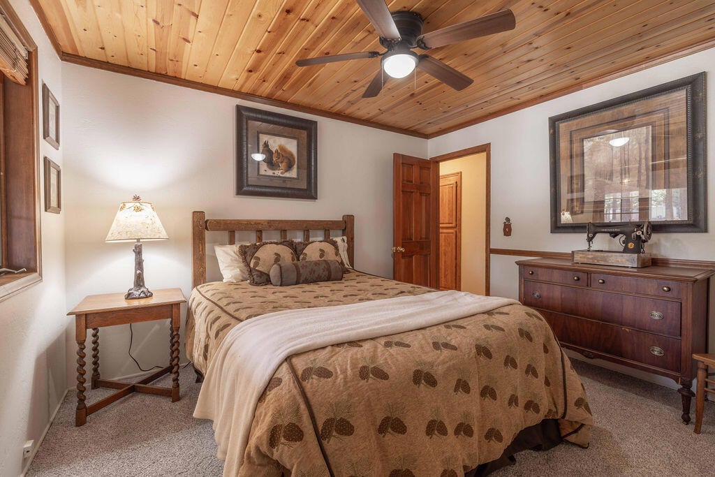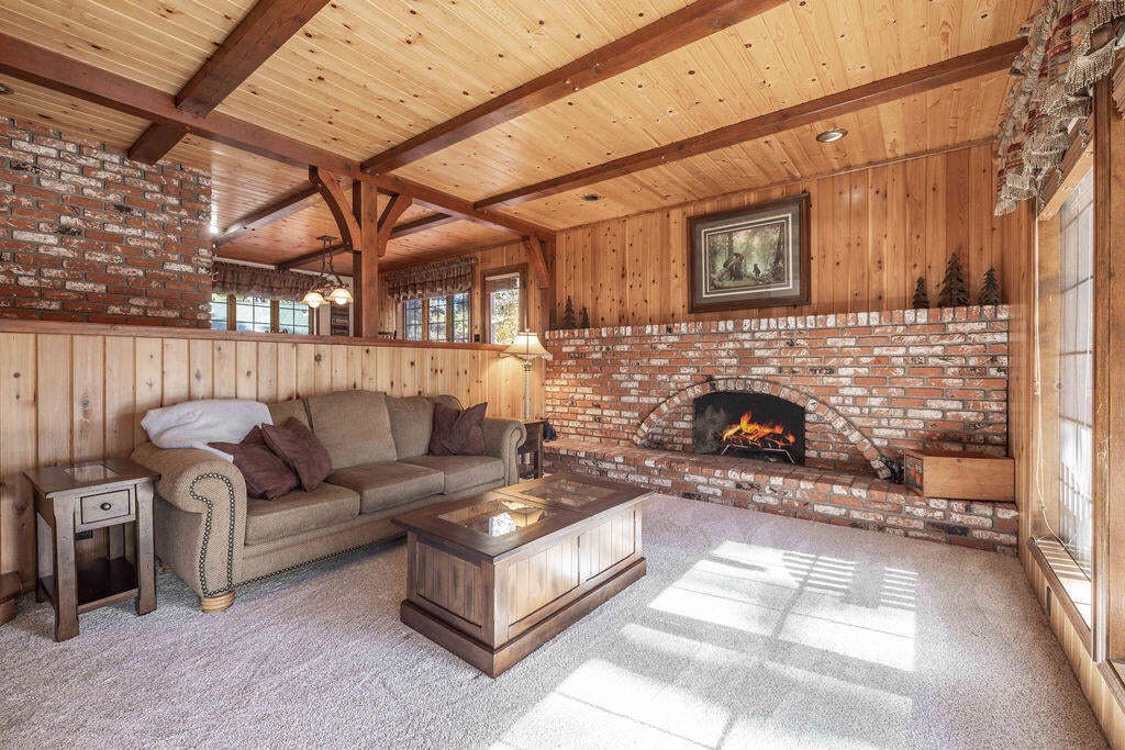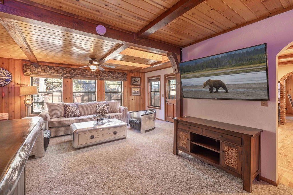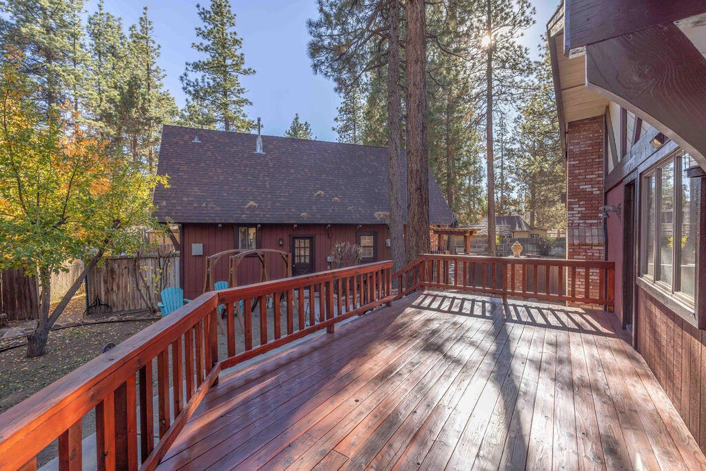 Welcome to your Big Bear getaway! This charming single-level ranch home sits on a roomy half-acre lot surrounded by mountain beauty. Enjoy peaceful mornings on the covered front porch or summer BBQs on the big back deck. The fully fenced yard is perfect for kids and pets to play safely. Inside, you'll find a warm and inviting space that's been lovingly maintained. The primary en-suite is spacious with its own wood burning fireplace and the sliding glass door leads to the redwood hot tub room to enjoy after a day on the slopes or mountain biking. Large living room and separate entertainment room with a bar and game area. The property also includes a separate two-story guest quarters offer excellent flexibility, featuring a full kitchen, bedroom, and bath on the main level, plus a large loft bedroom and additional bath upstairs--ideal for guests, extended family, or rental potential. There's plenty of room for all your toys with a 2-car garage and extra space for RV or boat parking. You'll love the convenient location just off North Shore Drive--close to hiking, biking, and horse trails in Holcomb Valley, and just a short drive to Big Bear Lake, shopping, and the ski resorts, providing easy year-round access.