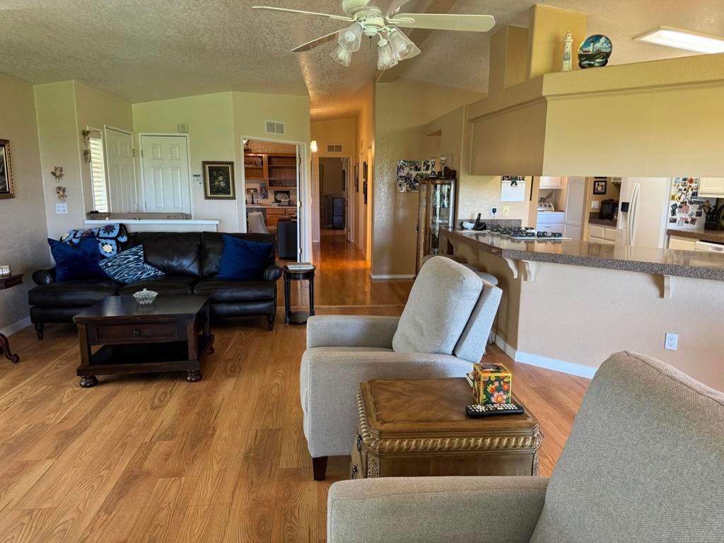 This nicely maintained, 1760 Sq Ft home has 2 Bedrooms, 2 Baths, a Sunroom and a Study. This home is on the 7th Fairway of the Ivey Ranch Country Club Golf Course and has beautiful Golf Course and Mountain views from the Kitchen, Study and Living Room. The home has a large Primary Bedroom with an en suite bathroom. The large covered Patio provides plenty of room for entertaining and the 3 Car Garage offers plenty of storage. The home features a new roof, (2023) Water Heater, (2020) and A/C (2015). This Home is on a 433A Permanent Foundation for Easy Financing. Ivey Ranch CC & GC, is a gated, senior community of manufactured homes integrated with a 9 hole golf course, Pro-shop, Driving Range, 4 community pools, 2 community spas, Club House and a Seasonal Restaurant. In Ivey Ranch you own the land. This home has a 433A Permanent Foundation and is ready for financing.